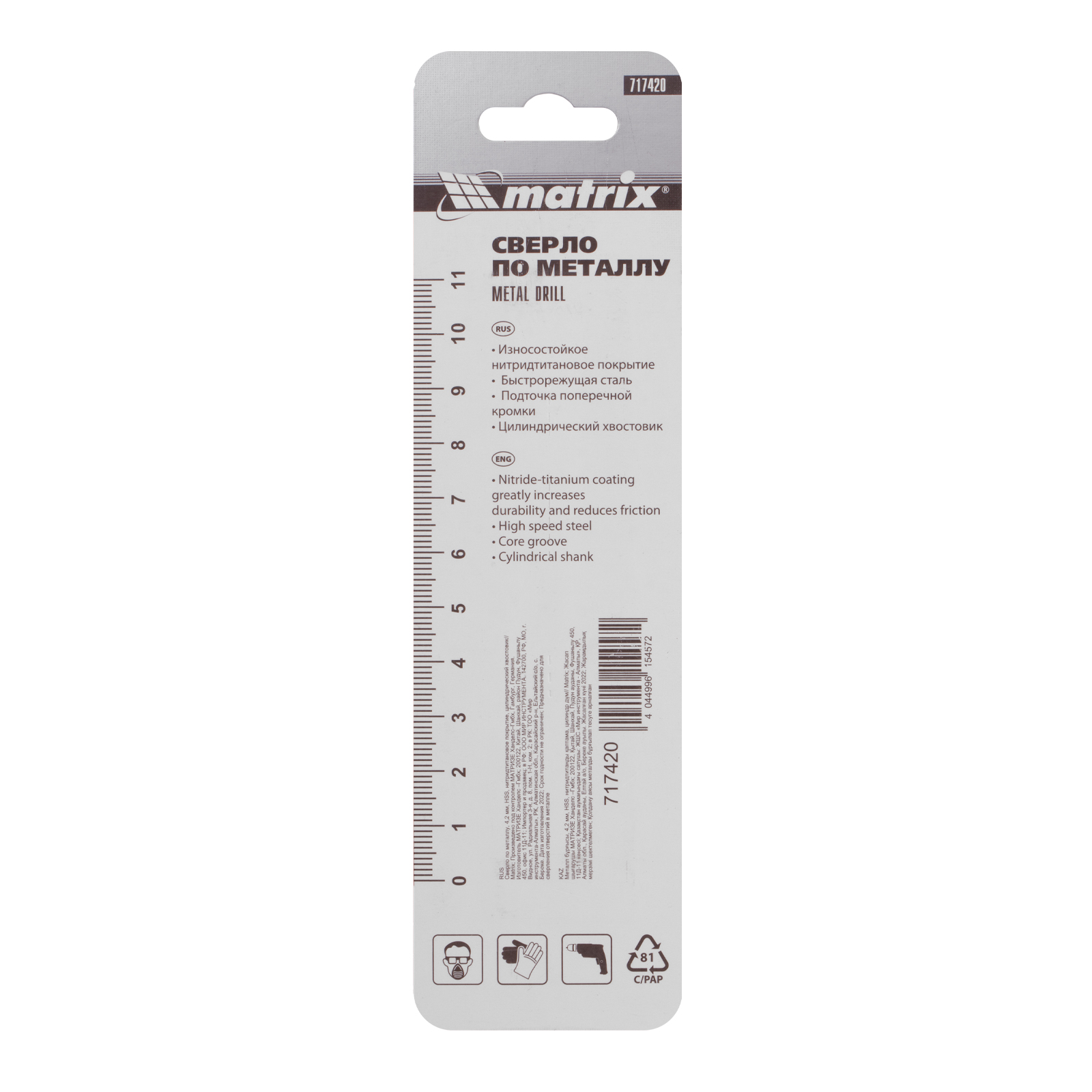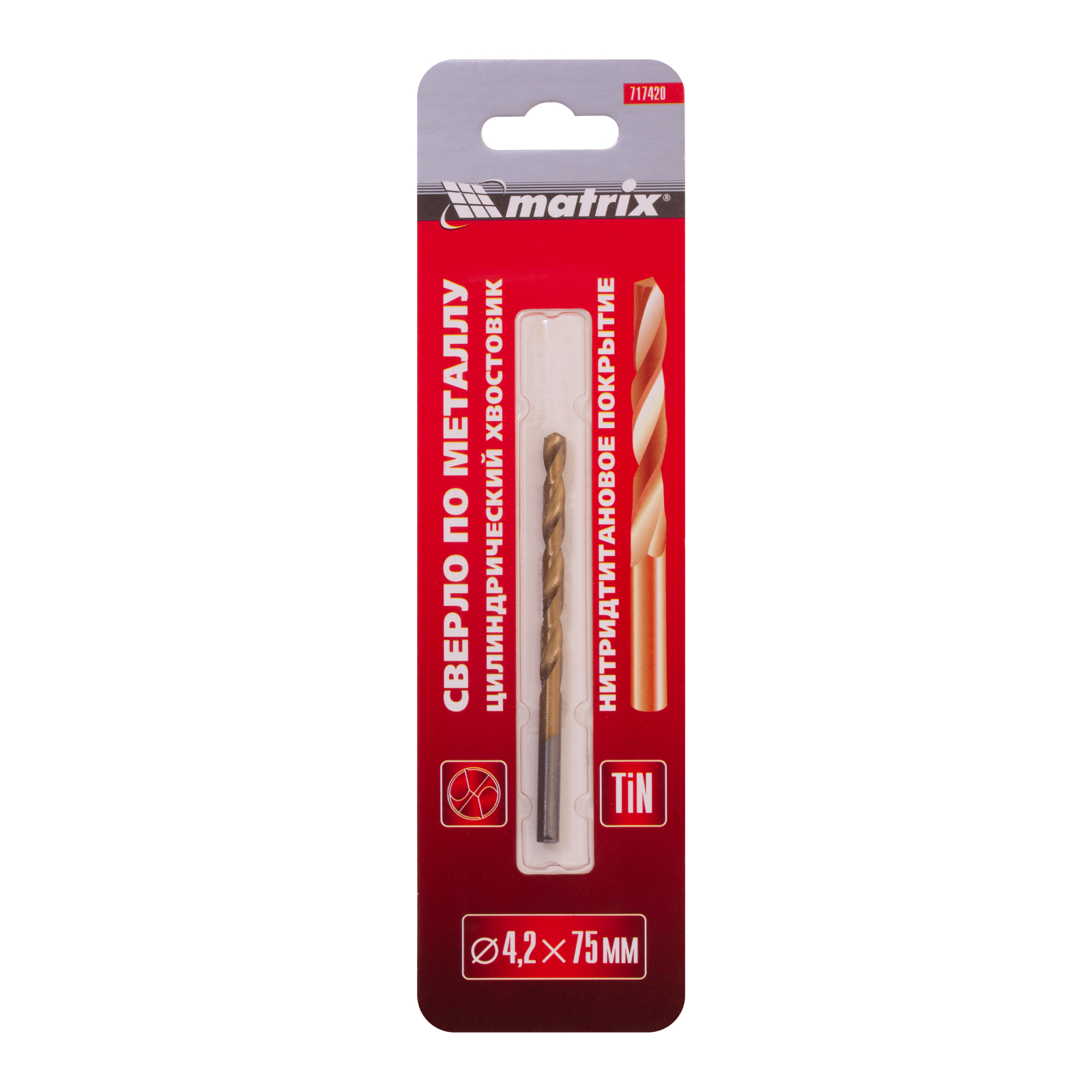 Сверло Matrix 717420 диаметром 4,2 мм, из стали HSS, с нитридтитановым покрытием и цилиндрическим хвостовиком, предназначено для получения отверстий в металле. Угол заточки 118° оптимален для работы с черными металлами, сталью, чугуном и твердой бронзой. Сверло выдерживает интенсивные нагрузки и подходит для профессионального использования.