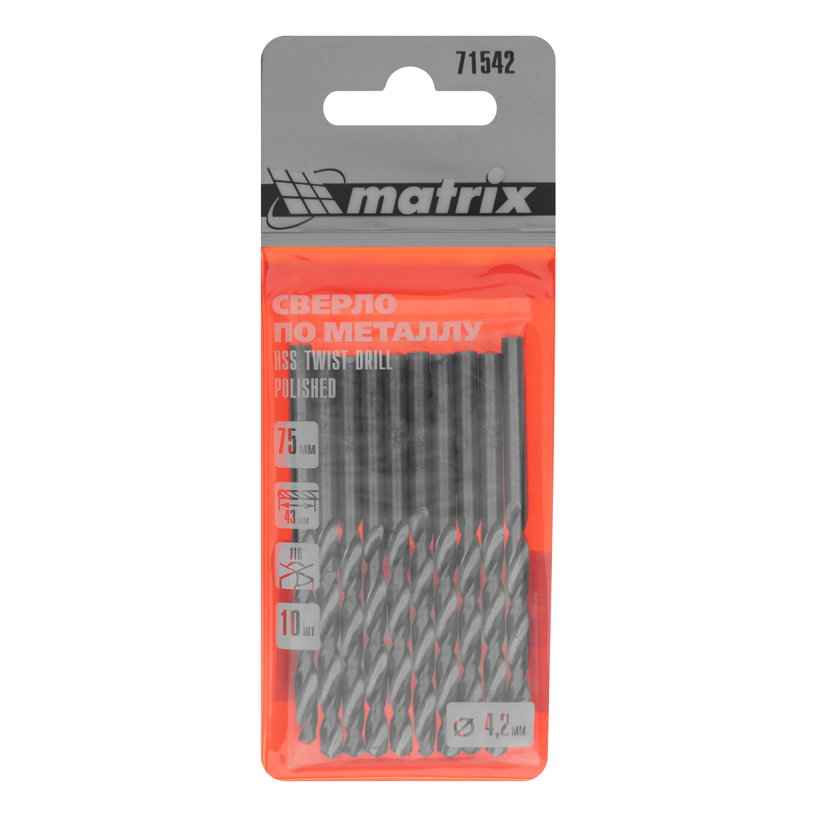 Полированное сверло по металлу Matrix 71542 из стали HSS, с цилиндрическим хвостовиком, 10 шт. в упаковке, используется для получения отверстий диаметром 4,2 мм. Угол заточки составляет 118°, поэтому сверло оптимально для работы с черными металлами, сталью, чугуном и твердой бронзой.