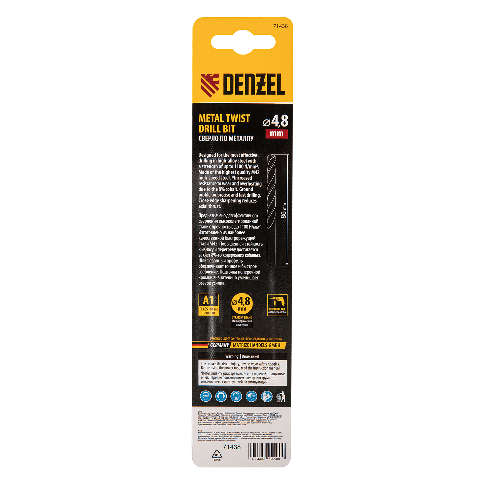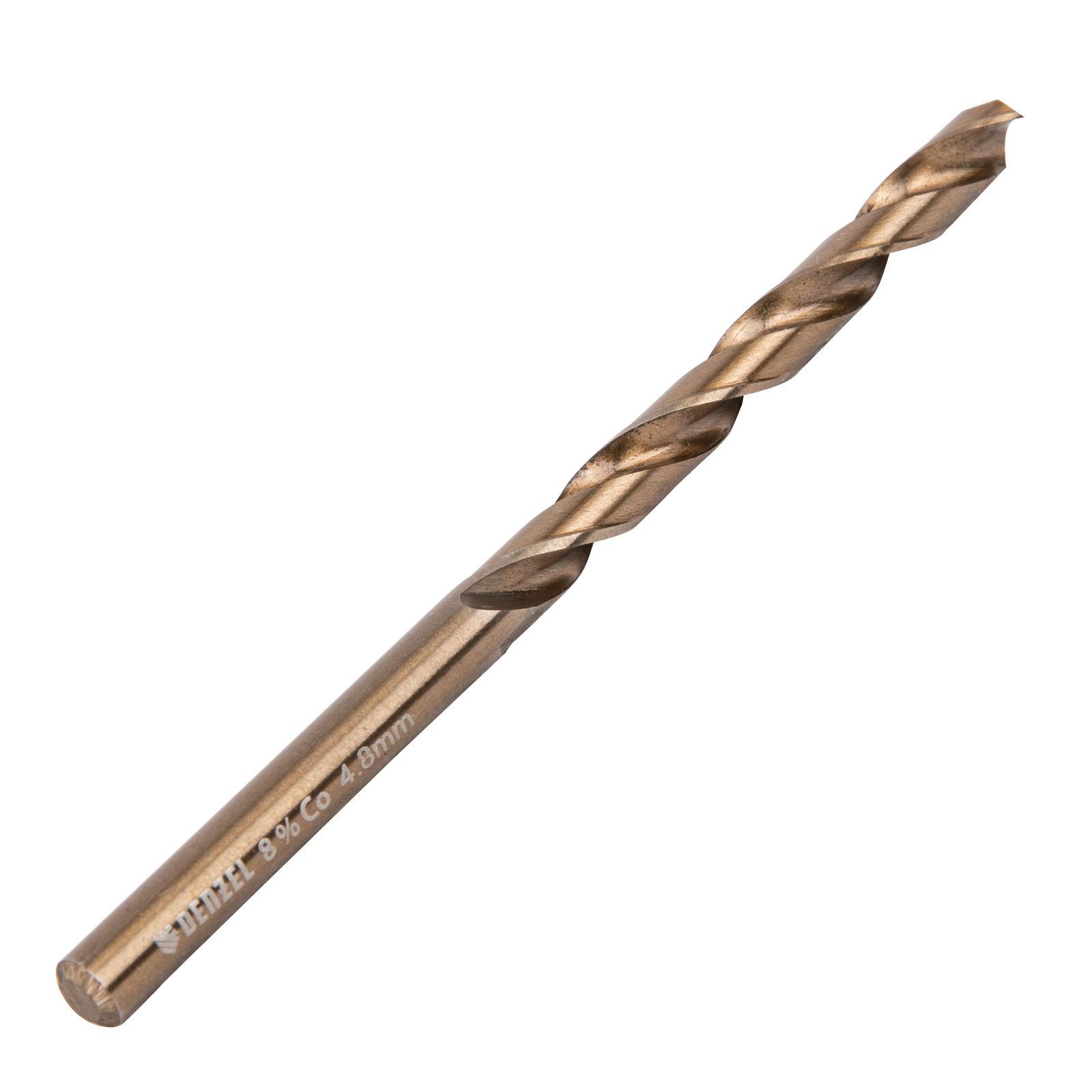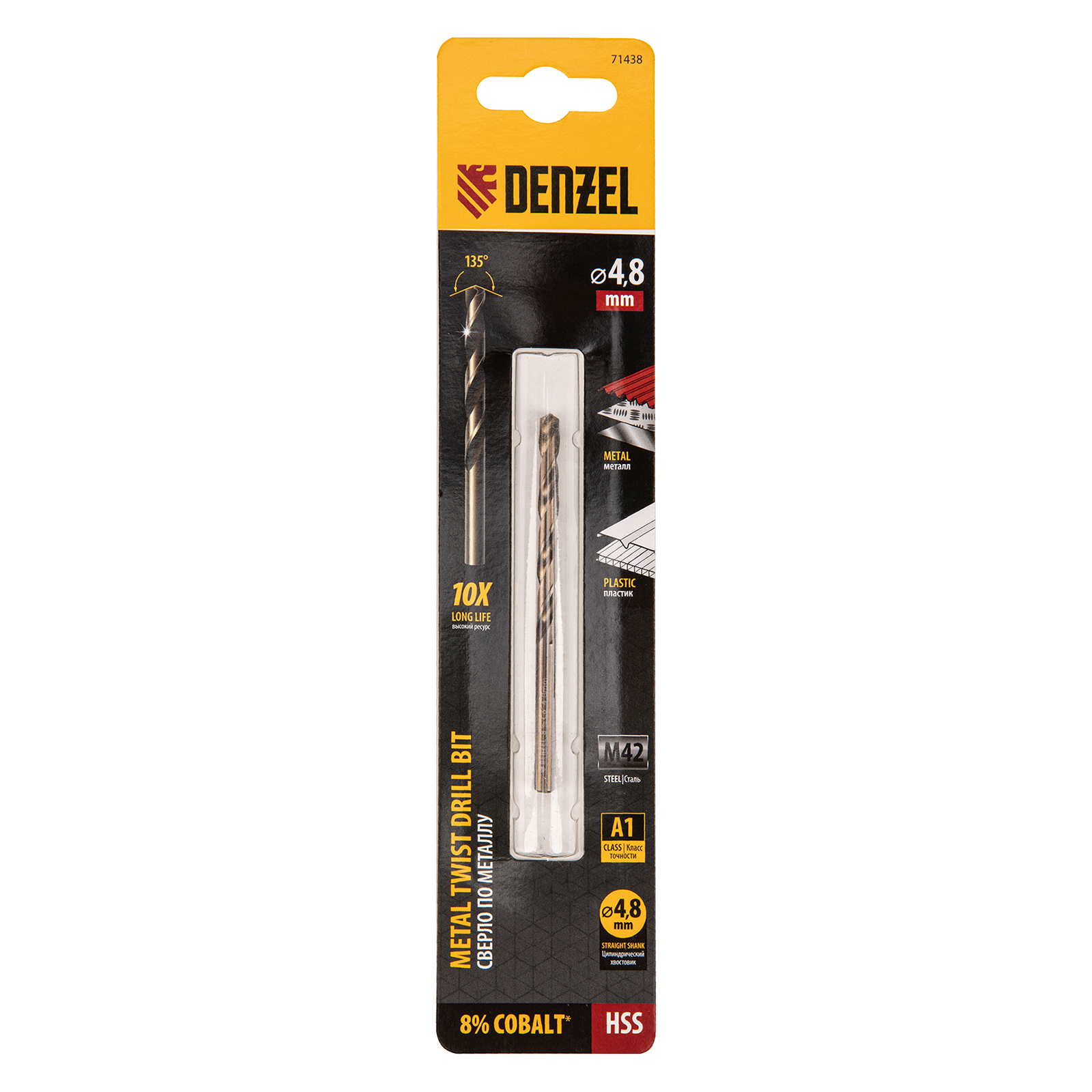 Кобальтовое сверло по металлу Denzel 71438 диаметром 4,8 мм, из стали HSS Co-8%, позволяет получать отверстия высокой точности в нержавеющей стали, цветных металлах, легированных и нелегированных сталях с пределом прочности до 1100 Н/мм2, а также в жестком пластике. Угол заточки 135° обеспечивает повышенную точность и чистоту сверления.