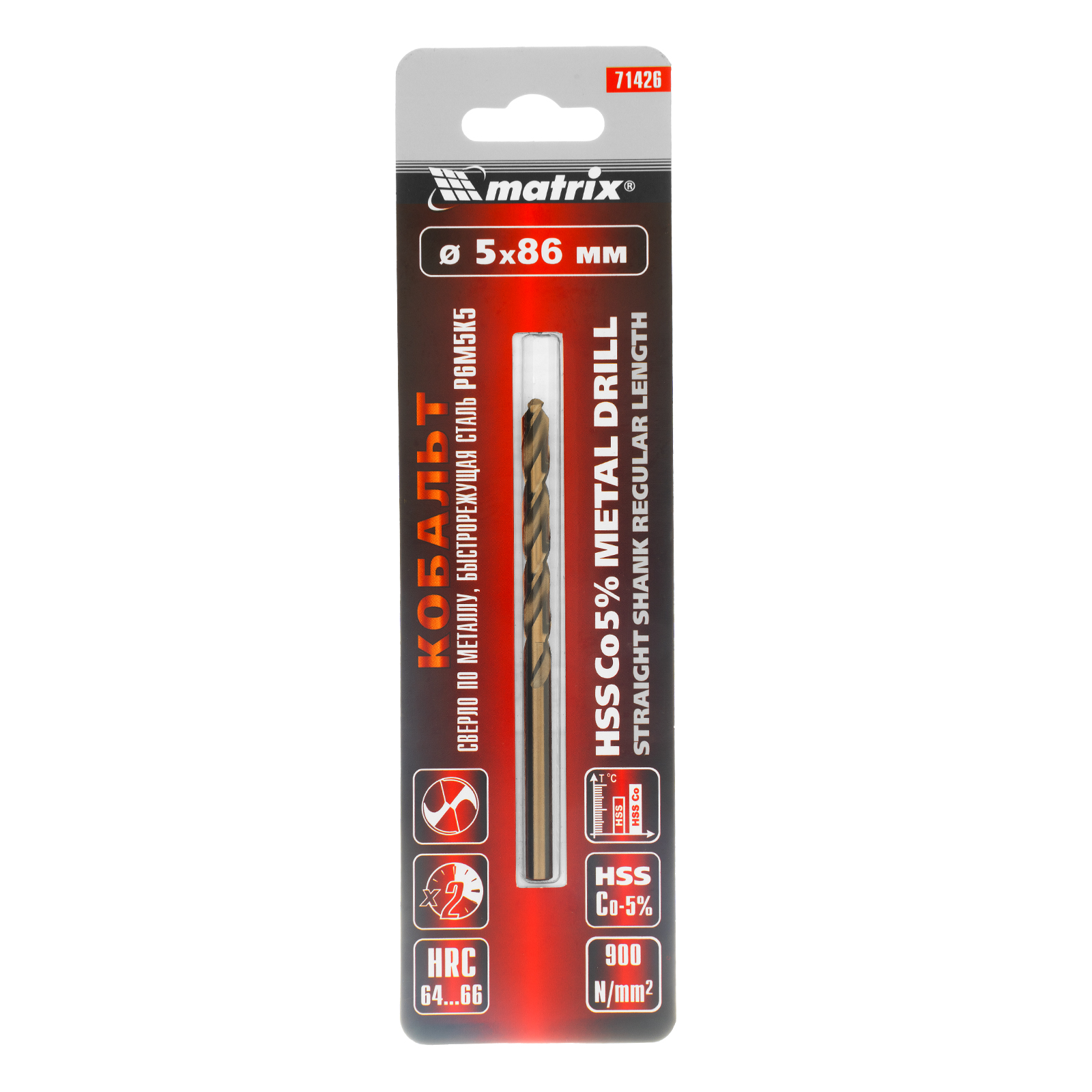 Сверло Matrix 71426 диаметром 5 мм, из стали HSS Co-5%, имеет угол заточки 135°, оптимальный для сверления легированных и цветных металлов. Подходит для профессионального использования на строительной площадке.