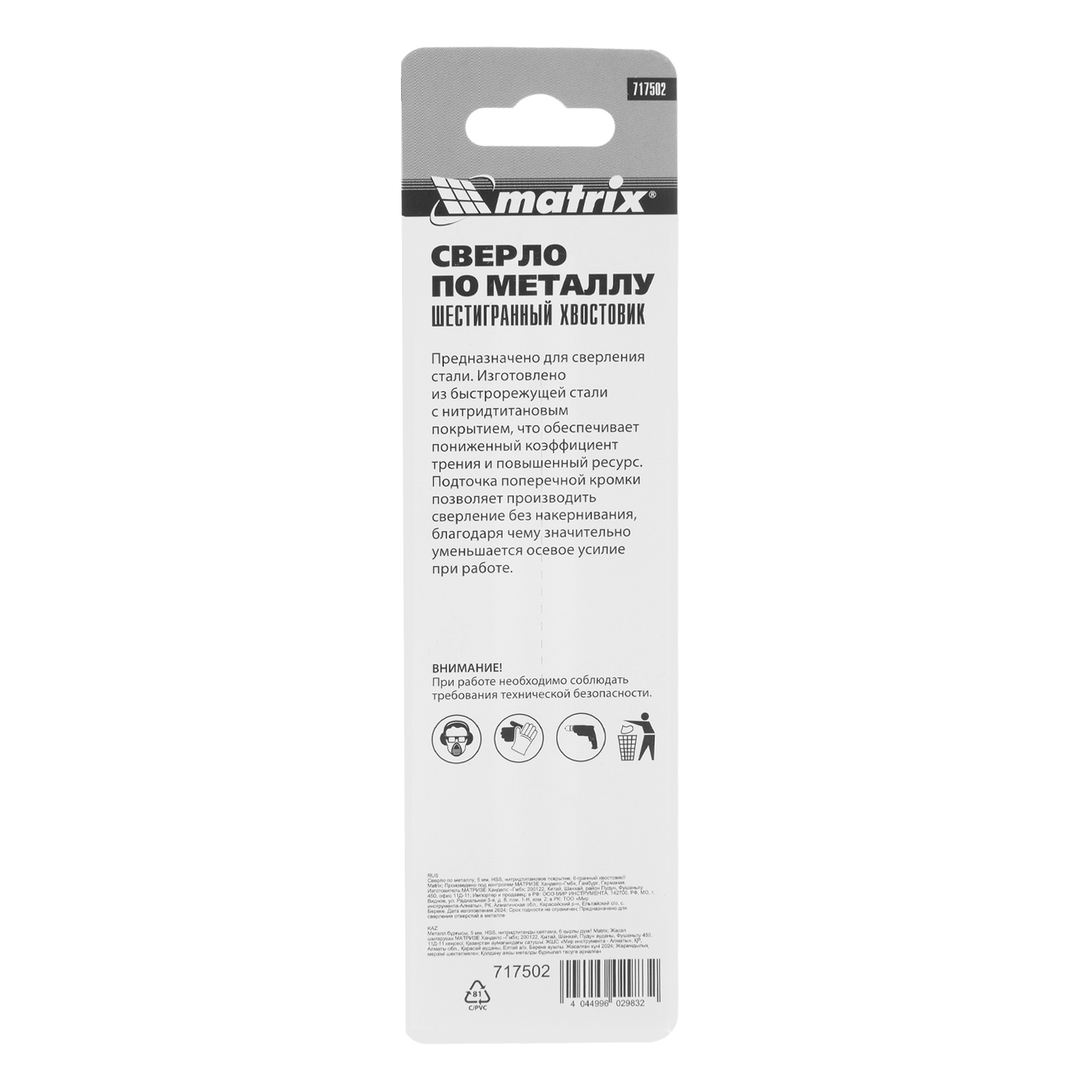 Сверло по металлу Matrix 717502 диаметром 5 мм, из стали HSS, с нитридтитановым покрытием и 6-гранным хвостовиком, предназначено для получения отверстий в черном металле, стали, чугуне и твердой бронзе. Устанавливается в патрон дрели.