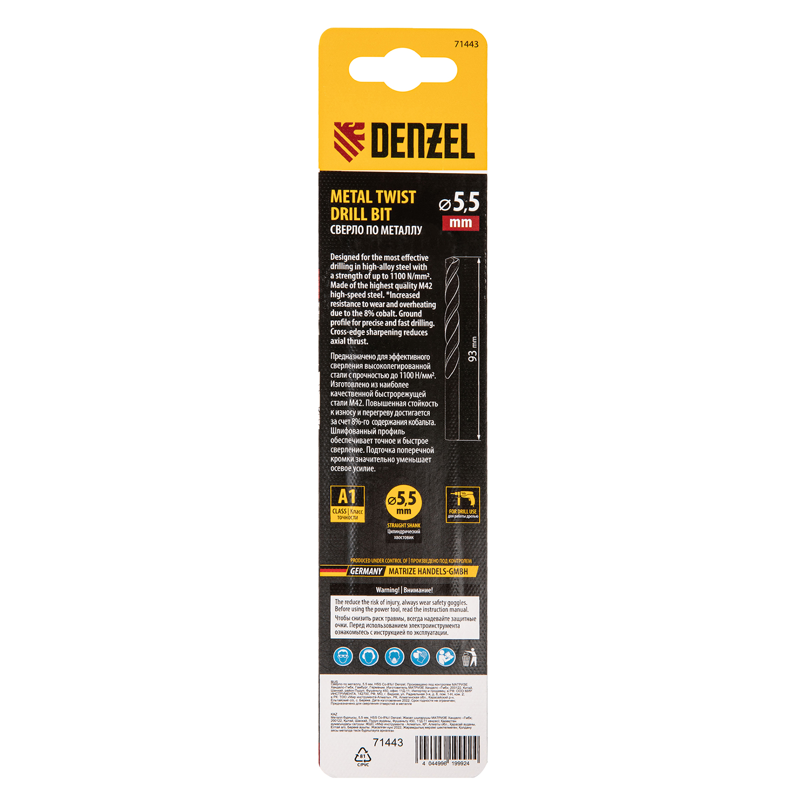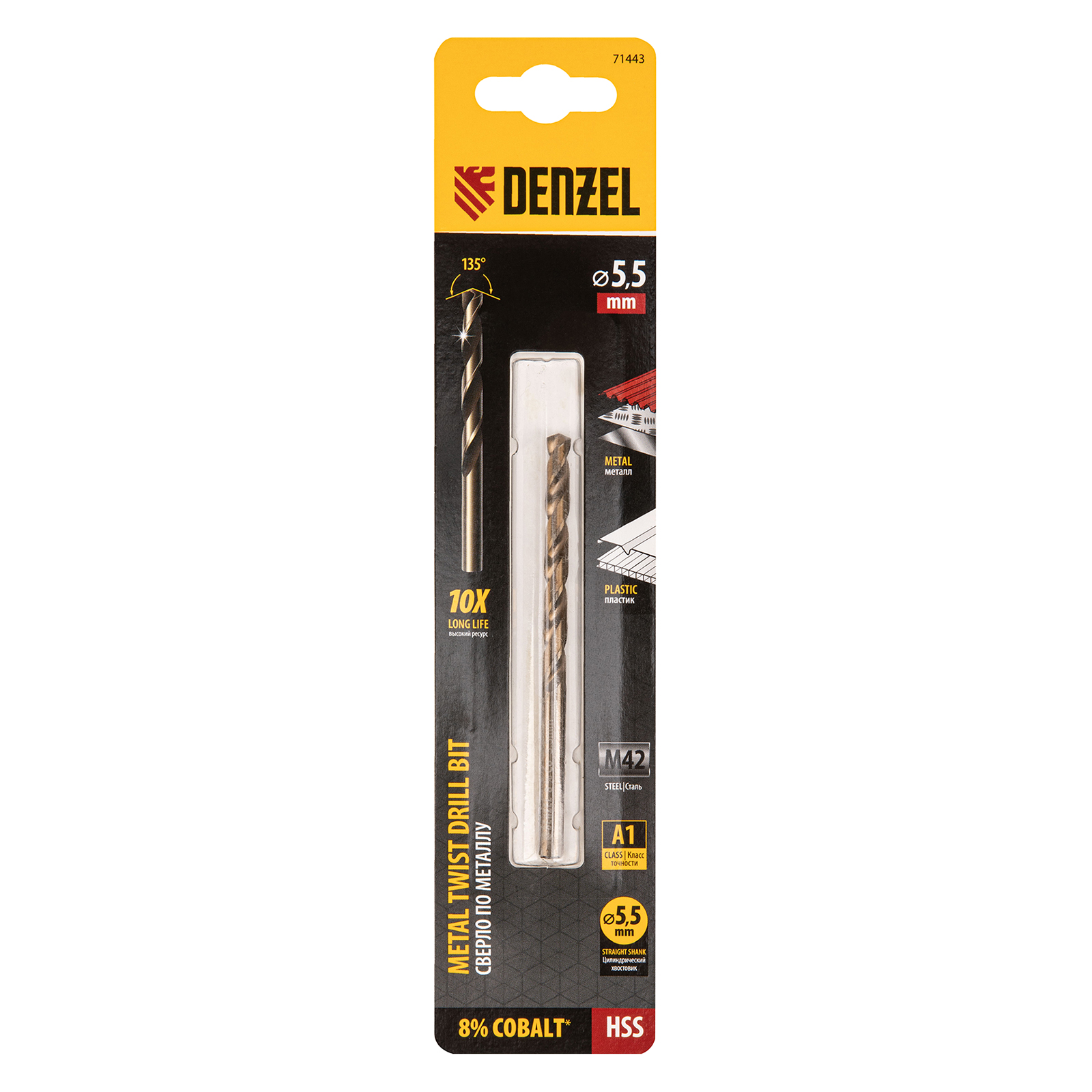 Кобальтовое сверло по металлу Denzel 71443 диаметром 5,5 мм, из стали HSS Co-8%, позволяет получать отверстия высокой точности в нержавеющей стали, цветных металлах, легированных и нелегированных сталях с пределом прочности до 1100 Н/мм2, а также в жестком пластике. Угол заточки 135° обеспечивает повышенную точность и чистоту сверления.