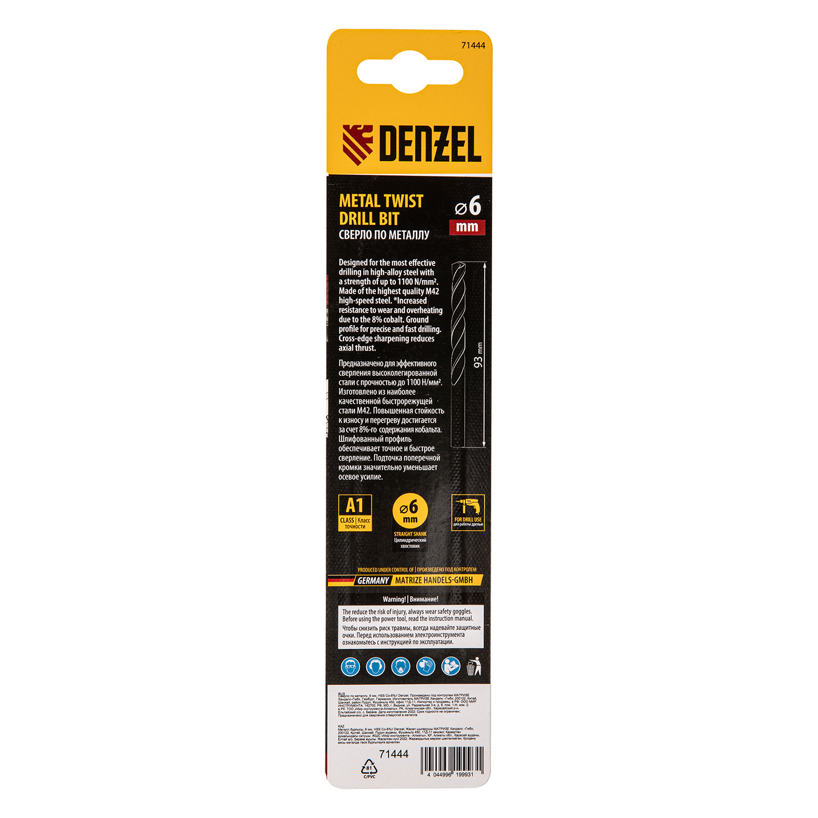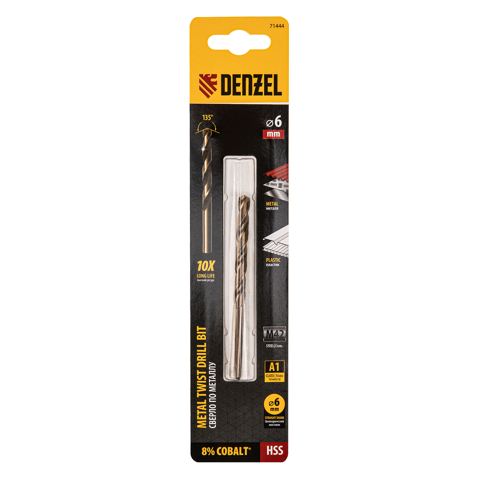 Кобальтовое сверло по металлу Denzel 71444 диаметром 6 мм, из стали HSS Co-8%, позволяет получать отверстия высокой точности в нержавеющей стали, цветных металлах, легированных и нелегированных сталях с пределом прочности до 1100 Н/мм2, а также в жестком пластике. Угол заточки 135° обеспечивает повышенную точность и чистоту сверления.