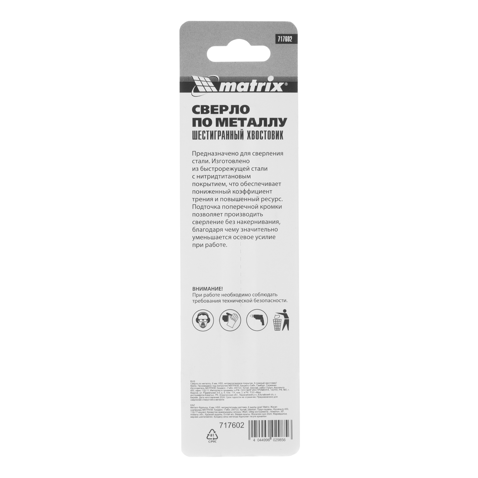 Сверло по металлу Matrix 717602 диаметром 6 мм, из стали HSS, с нитридтитановым покрытием и 6-гранным хвостовиком, предназначено для получения отверстий в черном металле, стали, чугуне и твердой бронзе. Устанавливается в патрон дрели.