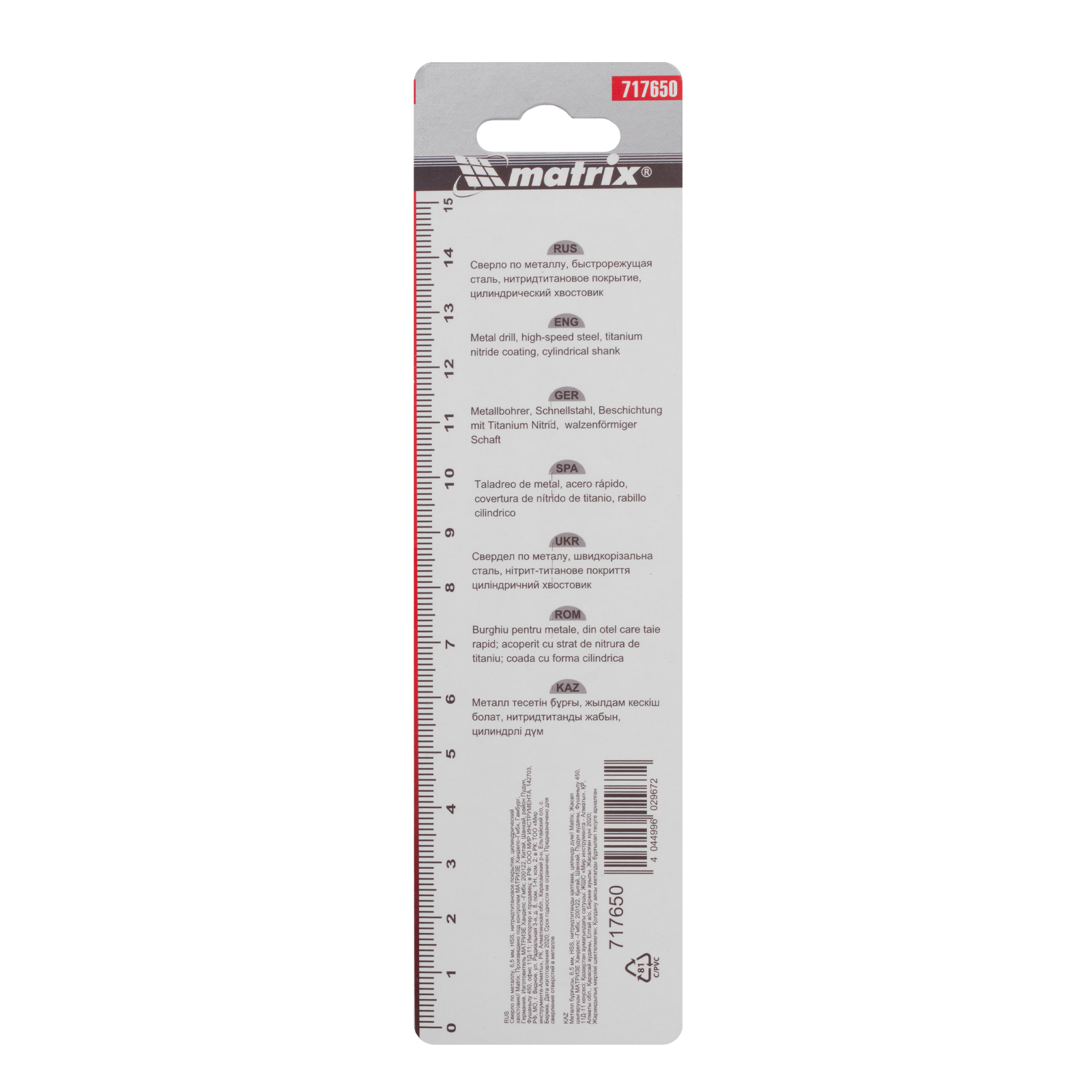 Сверло Matrix 717650 диаметром 6,5 мм, из стали HSS, с нитридтитановым покрытием и цилиндрическим хвостовиком, предназначено для получения отверстий в металле. Угол заточки 118° оптимален для работы с черными металлами, сталью, чугуном и твердой бронзой. Сверло выдерживает интенсивные нагрузки и подходит для профессионального использования.