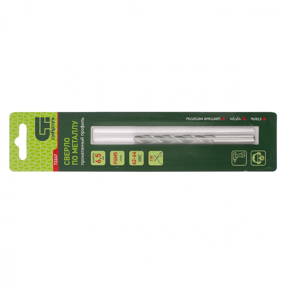 Сверло по металлу Сибртех 72247 диаметром 6,5 мм, имеет угол заточки 118°, оптимальный для получения отверстий в черных и тяжелых металлах, в том числе стали, чугуне и твердой бронзе. Отличается наиболее выгодной стоимостью по сравнению с другими моделями из стали P6M5. Используется для выполнения монтажно-сборочных работ, будет полезно в быту.