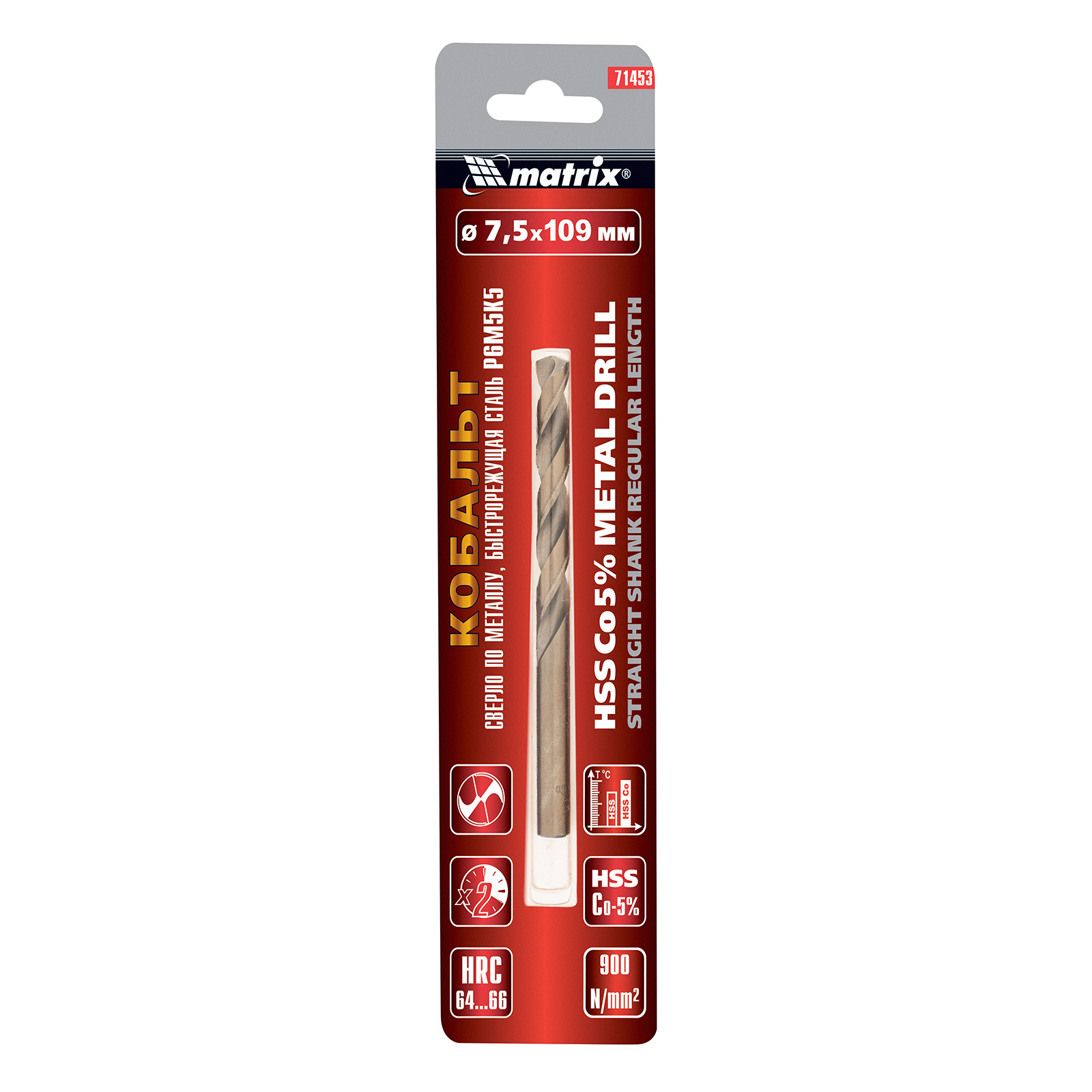 Сверло Matrix 71453 диаметром 7,5 мм, из стали HSS Co-5%, имеет угол заточки 135°, оптимальный для сверления легированных и цветных металлов. Подходит для профессионального использования на строительной площадке.