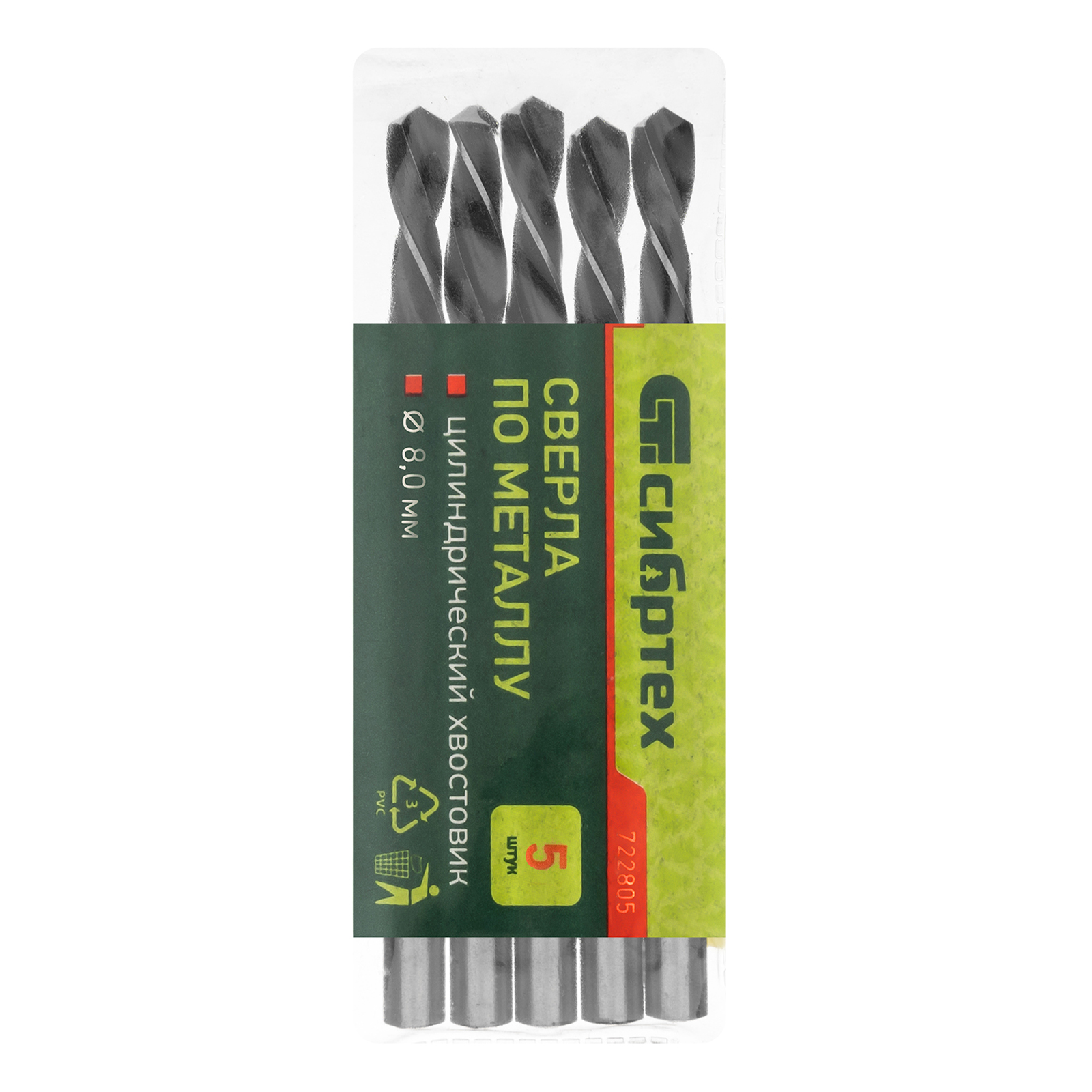 Сверло по металлу Сибртех 722805 из быстрорежущей стали, с цилиндрическим хвостовиком, 5 шт. в упаковке, имеет угол заточки 118° и используется для получения отверстий диаметром 8,0 мм в цветных и тяжелых металлах. Инструмент применяется в профессиональных и бытовых целях.