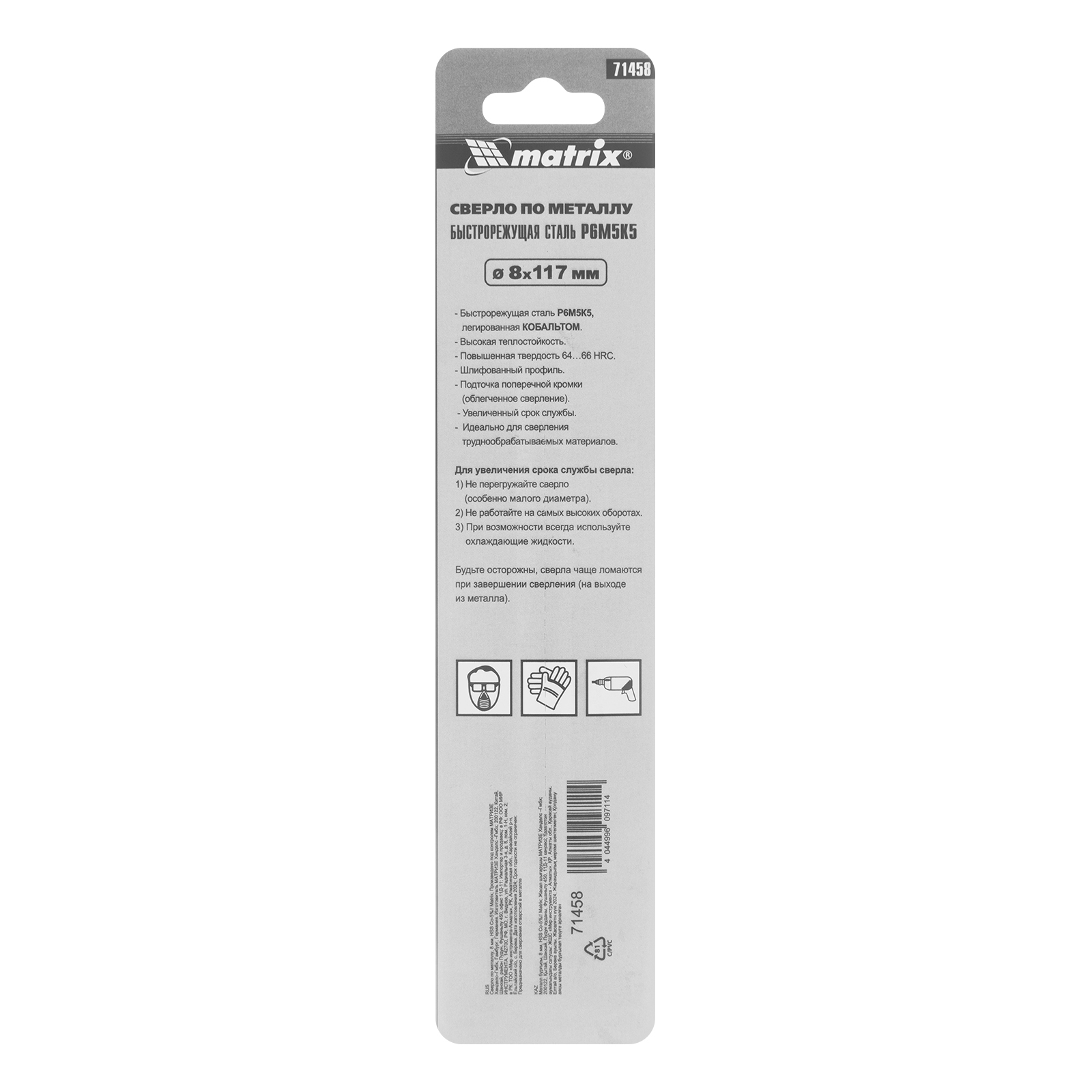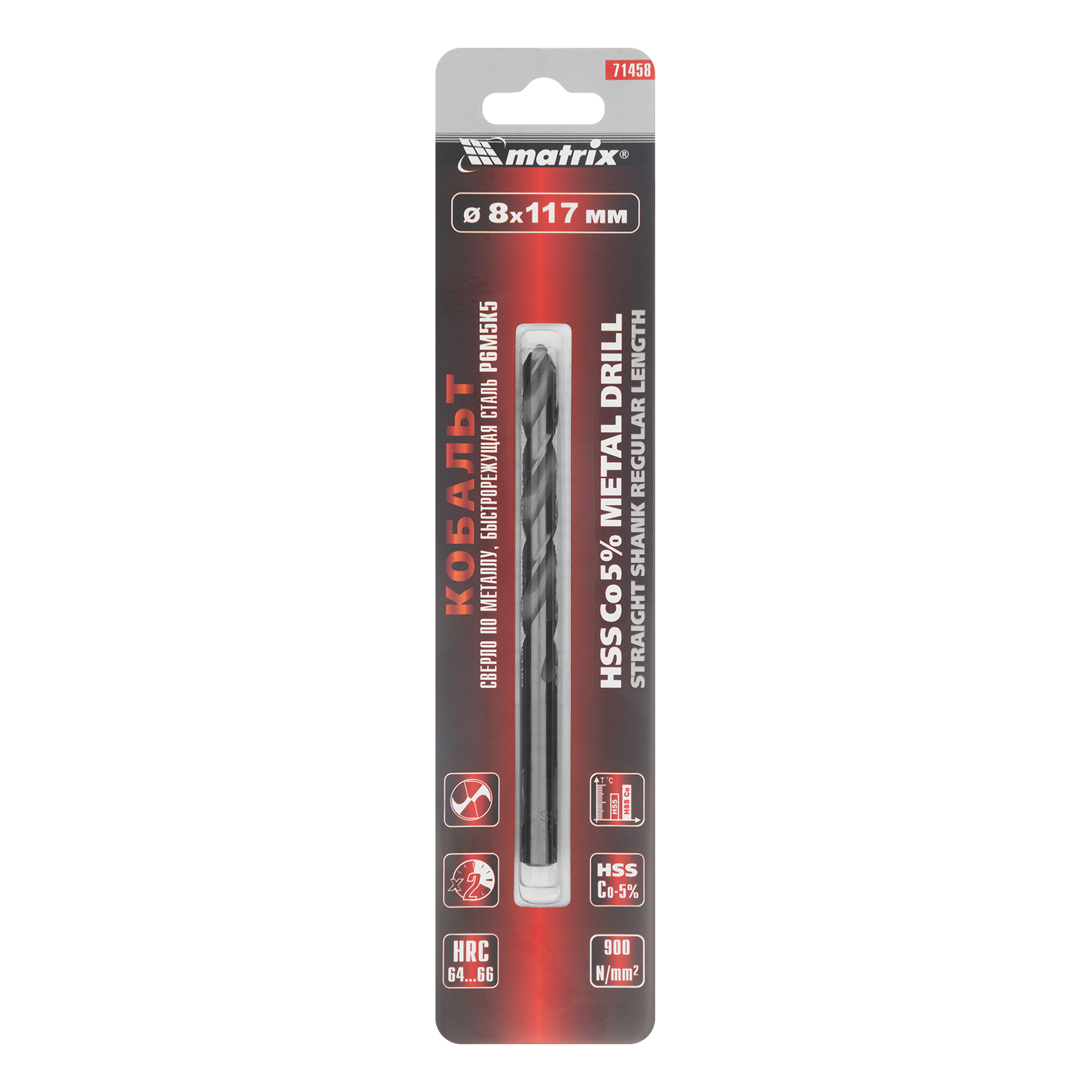 Сверло Matrix 71458 диаметром 8 мм, из стали HSS Co-5%, имеет угол заточки 135°, оптимальный для сверления легированных и цветных металлов. Подходит для профессионального использования на строительной площадке.