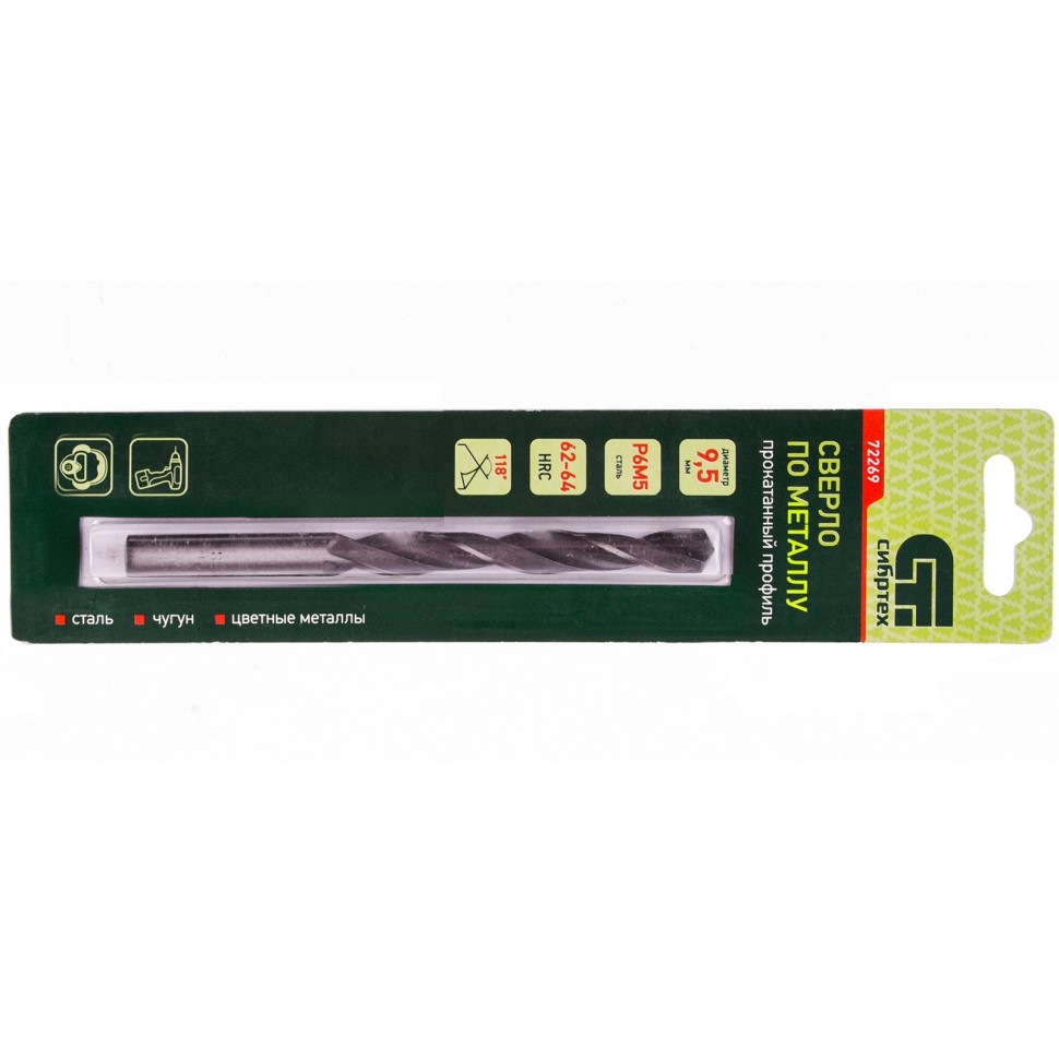 Сверло по металлу Сибртех 72269 диаметром 9,5 мм, имеет угол заточки 118°, оптимальный для получения отверстий в черных и тяжелых металлах, в том числе стали, чугуне и твердой бронзе. Отличается наиболее выгодной стоимостью по сравнению с другими моделями из стали P6M5. Используется для выполнения монтажно-сборочных работ, будет полезно в быту.