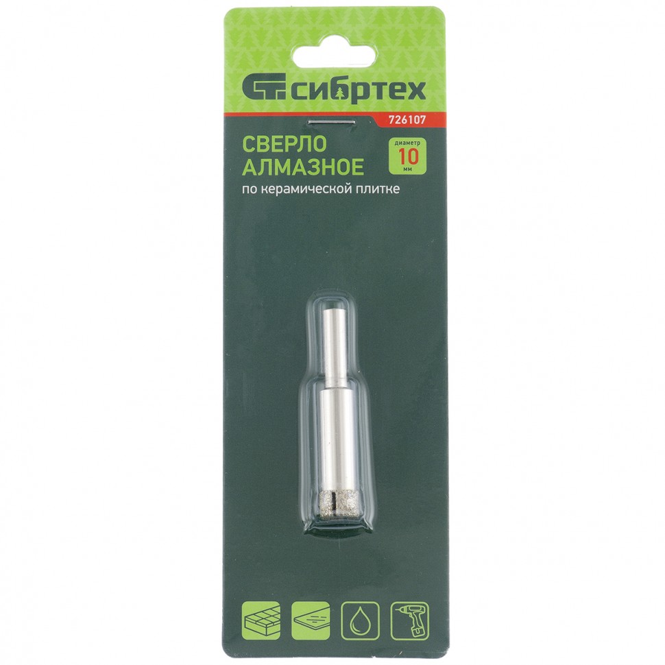 Сверло Сибртех 726127 размером 12 х 55 мм, с цилиндрическим хвостовиком, используется для получения ровных отверстий без сколов в стекле и керамической плитке. Устанавливается в патрон дрели или шуруповерта, работающих в диапазоне 350-700 об/мин. Во время работы рекомендуется применять водяное охлаждение — это существенно увеличит ресурс оснастки. Использование кондуктора Matrix 72833 позволяет точно позиционировать сверло и облегчает засверливание. Оснастка подходит для выполнения работ небольшого объема и рекомендована для использования в быту.