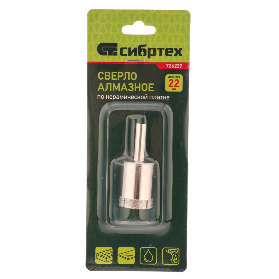 Сверло Сибртех 726227 размером 22 х 55 мм, с цилиндрическим хвостовиком, используется для получения ровных отверстий без сколов в стекле и керамической плитке. Устанавливается в патрон дрели или шуруповерта, работающих в диапазоне 350-700 об/мин. Во время работы рекомендуется применять водяное охлаждение — это существенно увеличит ресурс оснастки. Использование кондуктора (арт. 72830) позволяет точно позиционировать сверло и облегчает засверливание. Оснастка подходит для выполнения работ небольшого объема и рекомендована для использования в быту.