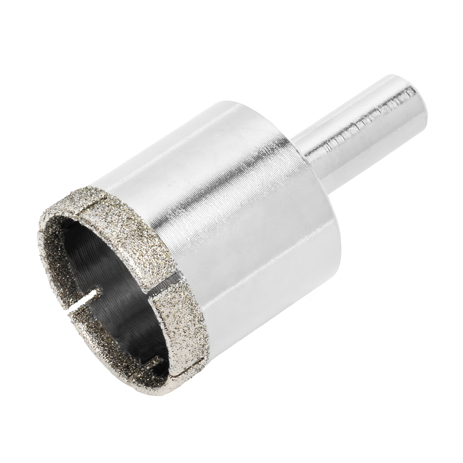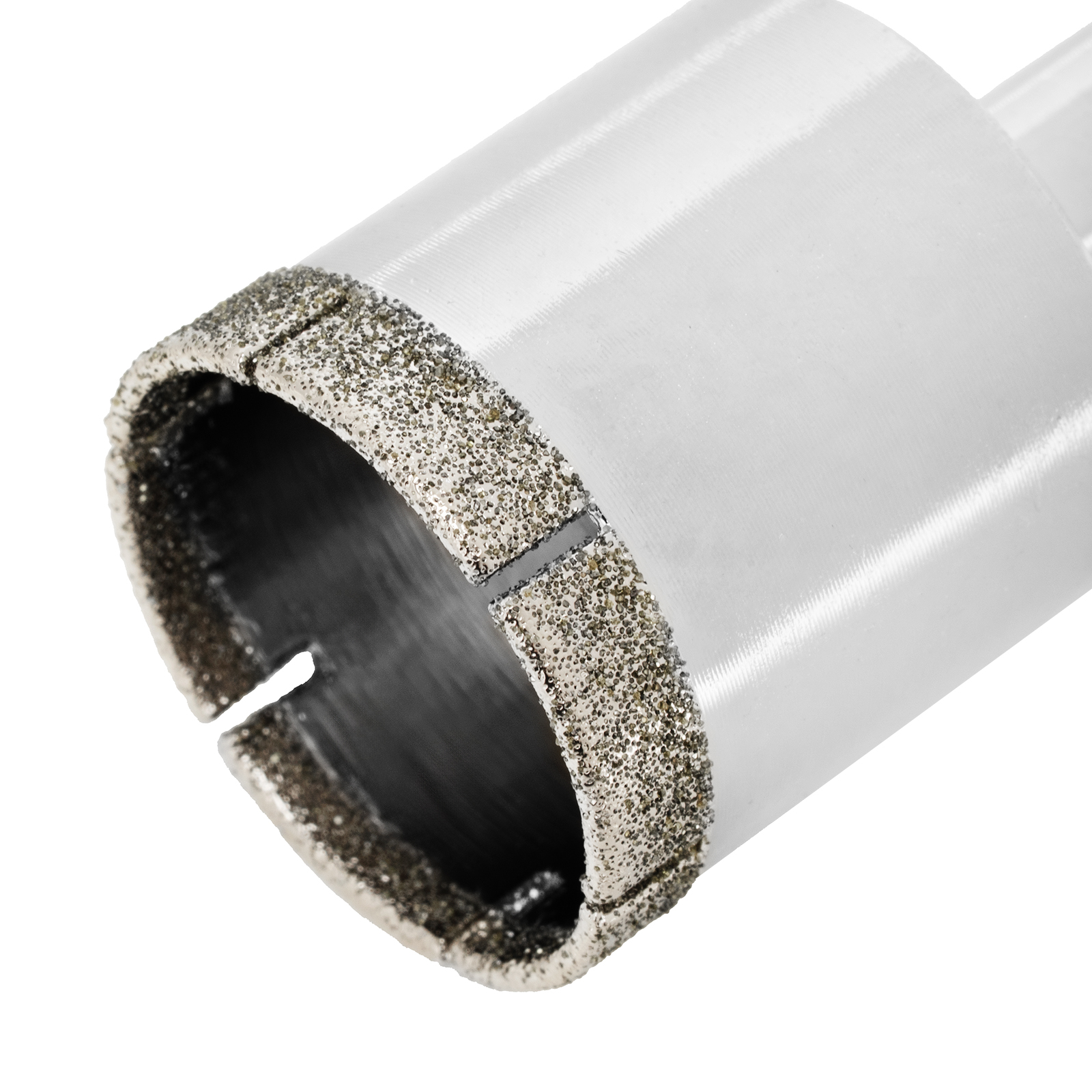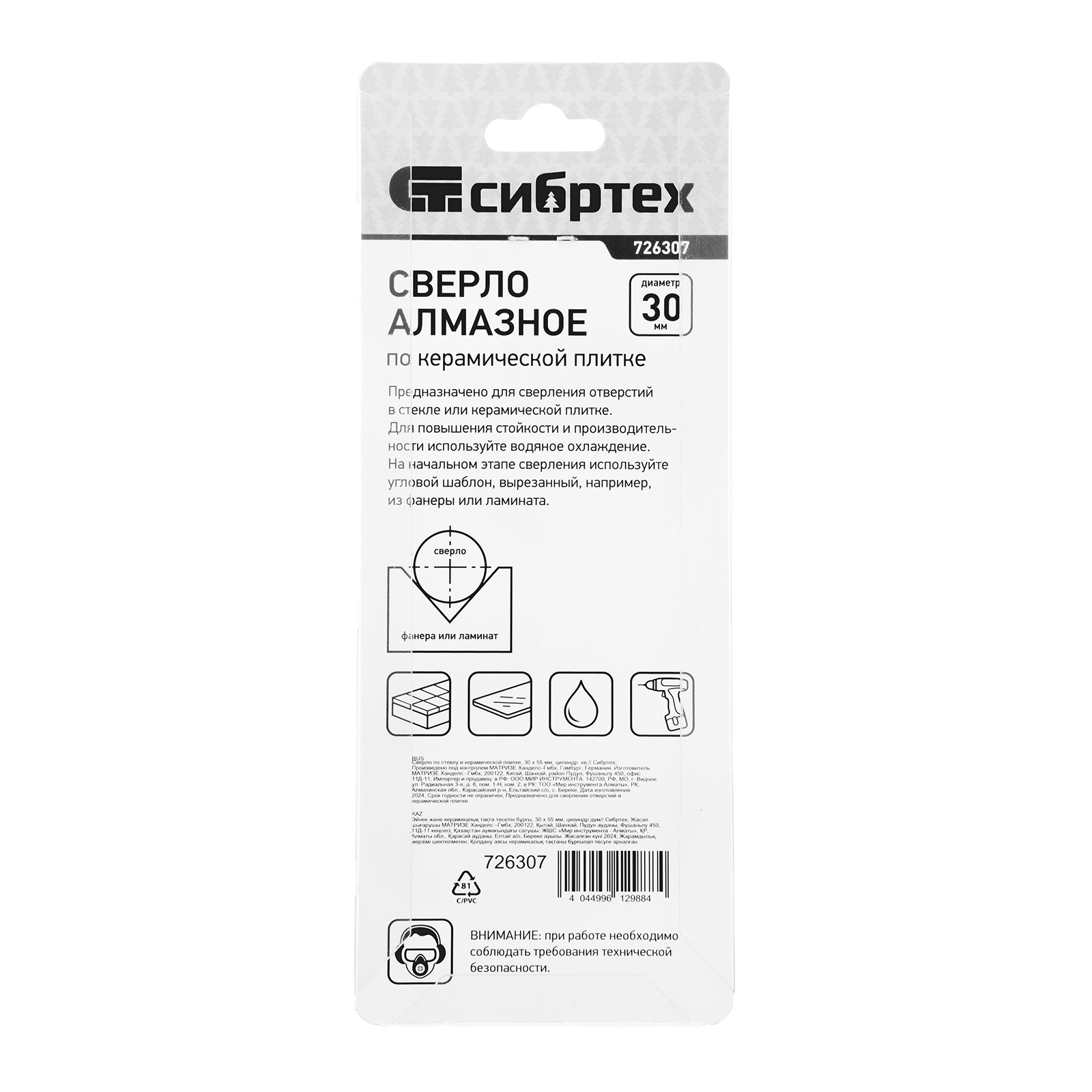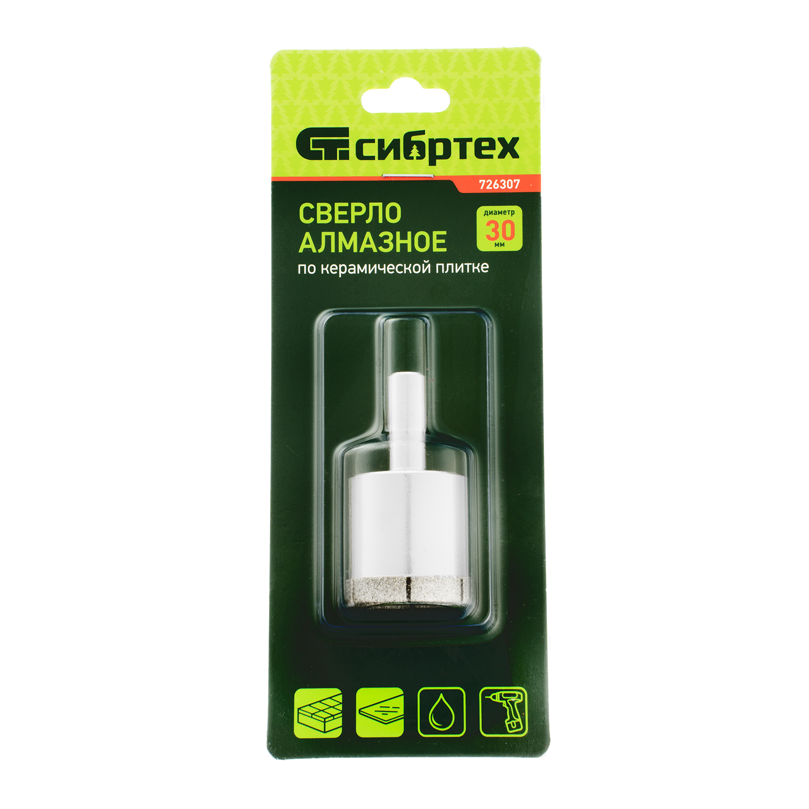 Сверло Сибртех 726307 размером 30 х 55 мм, с цилиндрическим хвостовиком, используется для получения ровных отверстий без сколов в стекле и керамической плитке. Устанавливается в патрон дрели или шуруповерта, работающих в диапазоне 350-700 об/мин. Во время работы рекомендуется применять водяное охлаждение — это существенно увеличит ресурс оснастки. Использование кондуктора (арт. 72830) позволяет точно позиционировать сверло и облегчает засверливание. Оснастка подходит для выполнения работ небольшого объема и рекомендована для использования в быту.