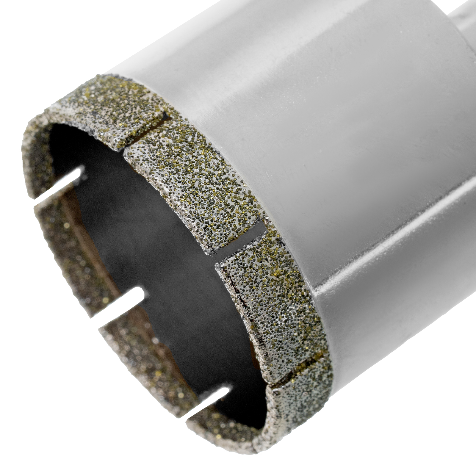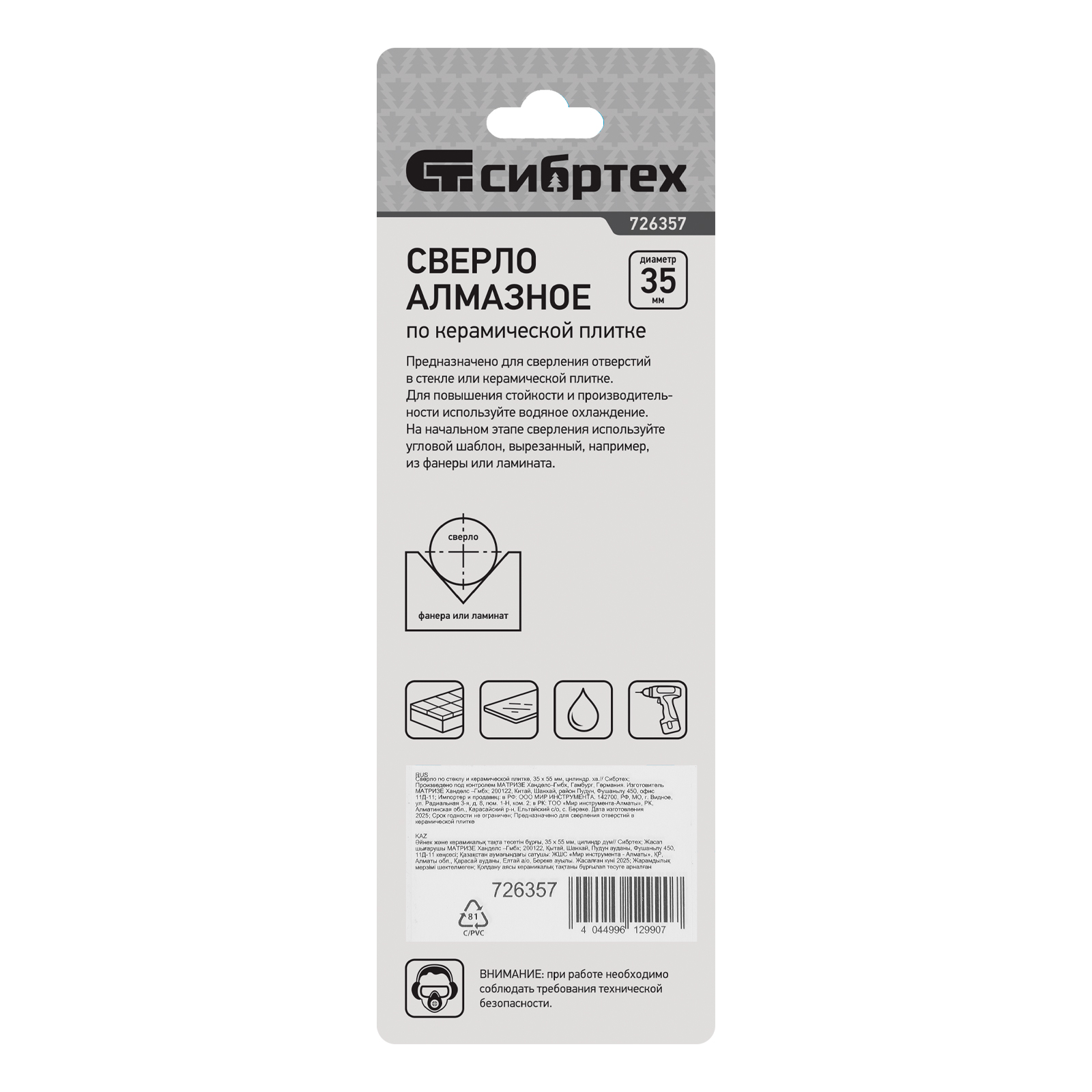 Сверло Сибртех 726357 размером 35 х 55 мм, с цилиндрическим хвостовиком, используется для получения ровных отверстий без сколов в стекле и керамической плитке. Устанавливается в патрон дрели или шуруповерта, работающих в диапазоне 350-700 об/мин. Во время работы рекомендуется применять водяное охлаждение — это существенно увеличит ресурс оснастки. Использование кондуктора (арт. 72830) позволяет точно позиционировать сверло и облегчает засверливание. Оснастка подходит для выполнения работ небольшого объема и рекомендована для использования в быту.
