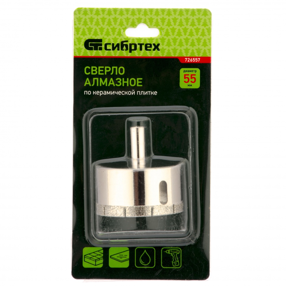 Сверло Сибртех 726557 размером 55 х 55 мм, с цилиндрическим хвостовиком, используется для получения ровных отверстий без сколов в стекле и керамической плитке. Устанавливается в патрон дрели или шуруповерта, работающих в диапазоне 350-700 об/мин. Во время работы рекомендуется применять водяное охлаждение — это существенно увеличит ресурс оснастки. Использование кондуктора (арт. 72830) позволяет точно позиционировать сверло и облегчает засверливание. Оснастка подходит для выполнения работ небольшого объема и рекомендована для использования в быту.