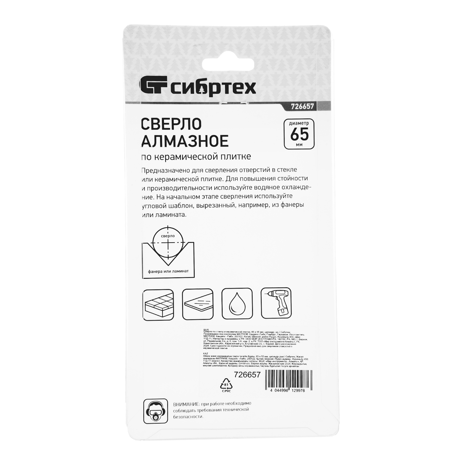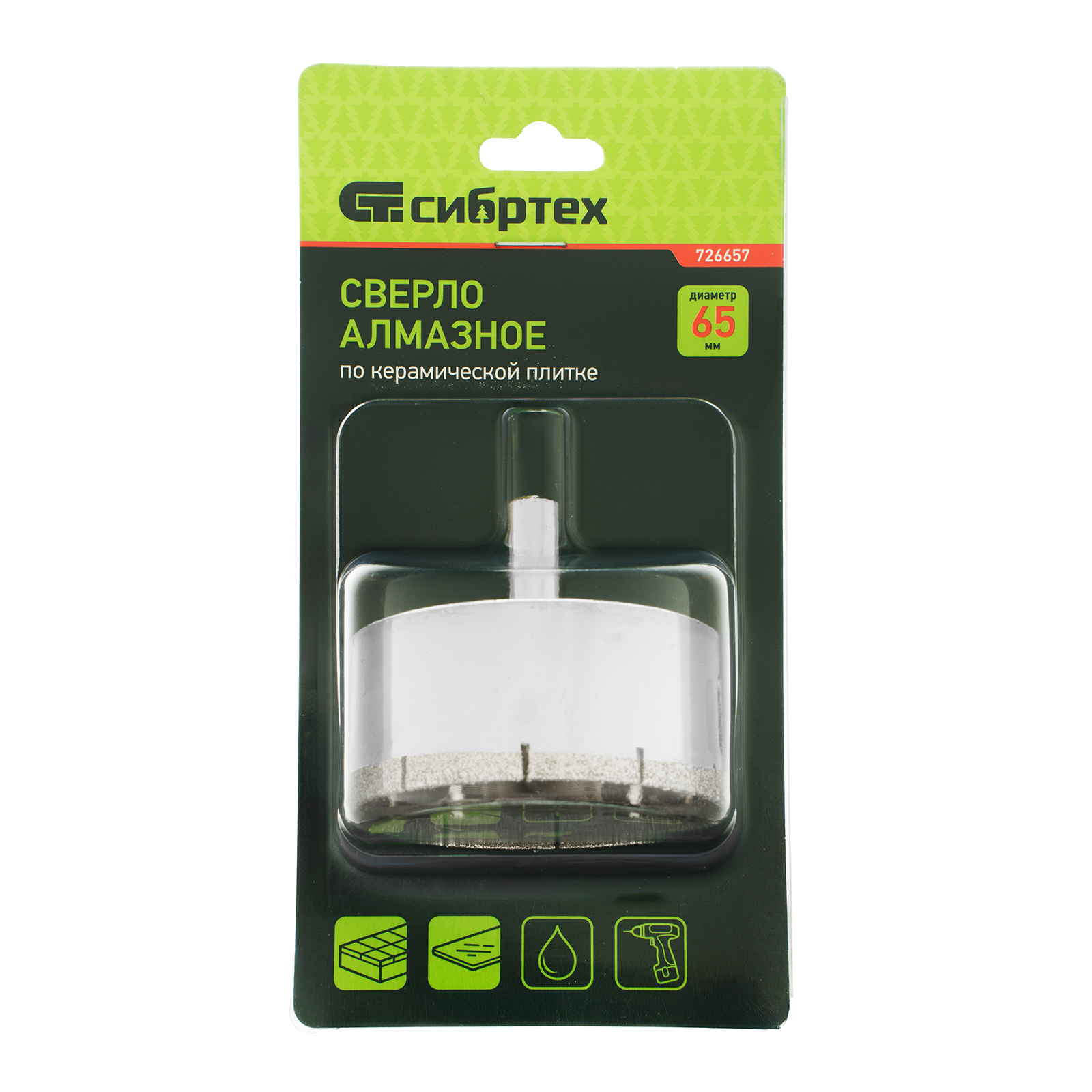 Сверло Сибртех 726657 размером 65 х 55 мм, с цилиндрическим хвостовиком, используется для получения ровных отверстий без сколов в стекле и керамической плитке. Устанавливается в патрон дрели или шуруповерта, работающих в диапазоне 350-700 об/мин. Во время работы рекомендуется применять водяное охлаждение — это существенно увеличит ресурс оснастки. Использование кондуктора (арт. 72830) позволяет точно позиционировать сверло и облегчает засверливание. Оснастка подходит для выполнения работ небольшого объема и рекомендована для использования в быту.
