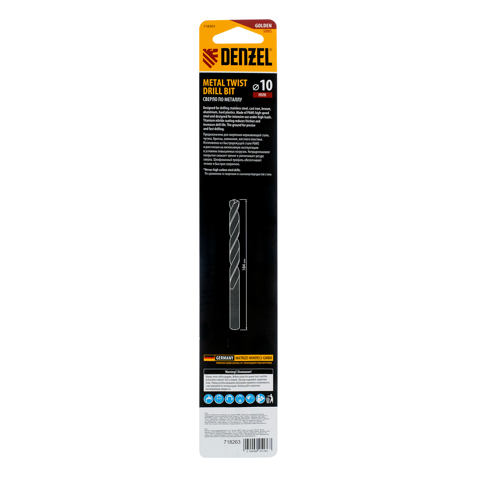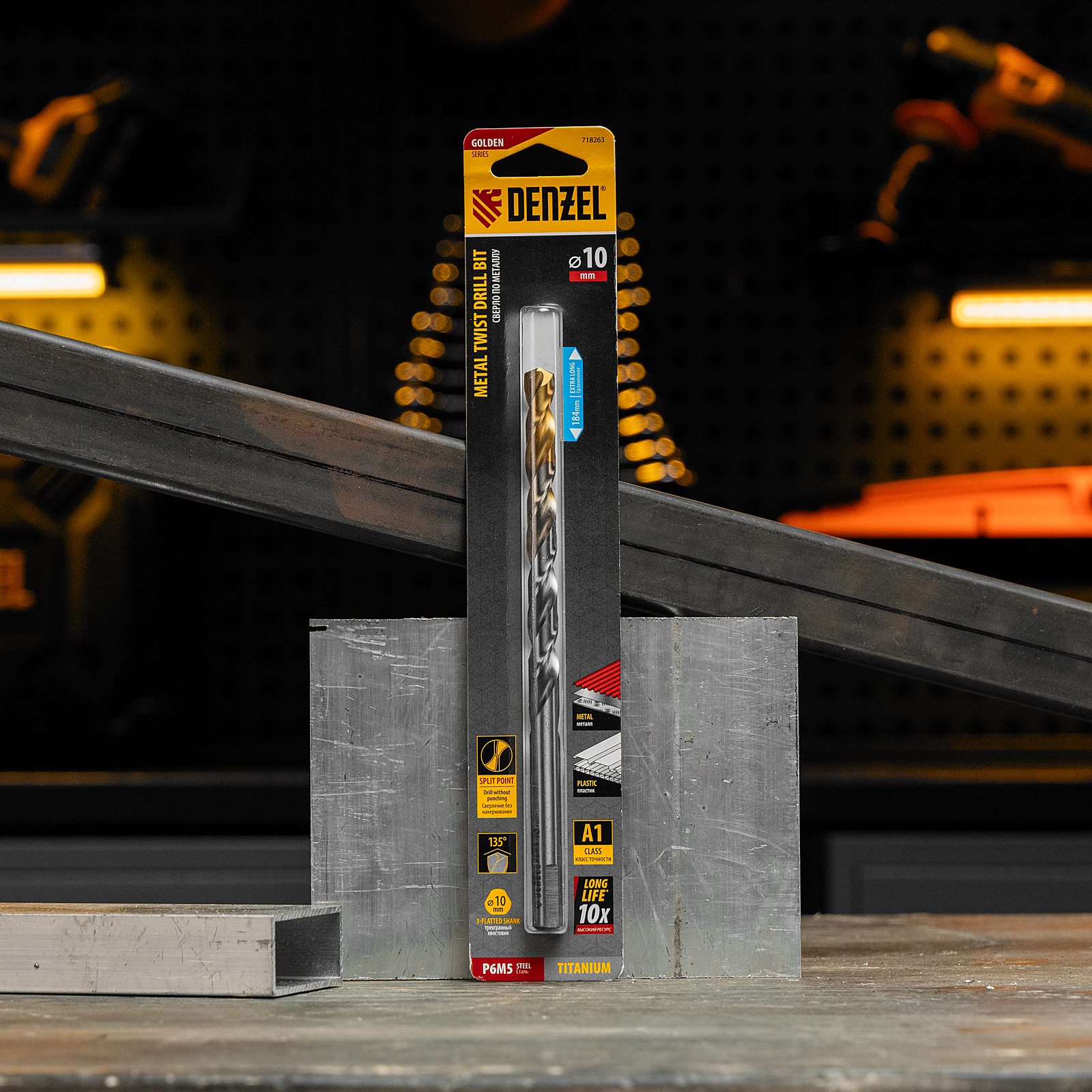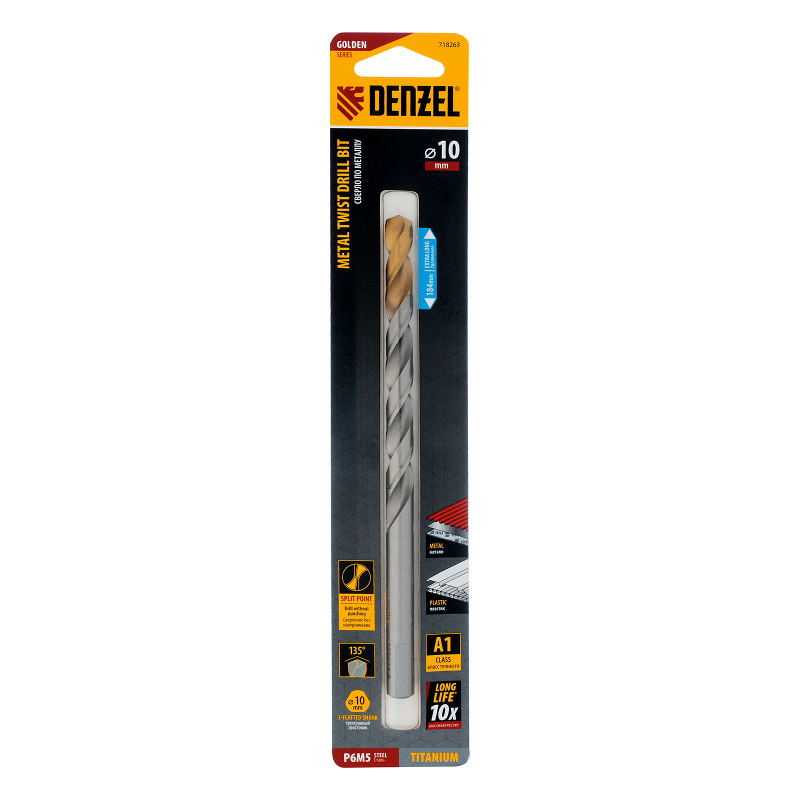 Удлиненное спиральное сверло по металлу Denzel Golden Tip 718263 из стали P6M5, размером 10 х 184 мм, предназначено для получения отверстий в легированных и цветных металлах — меди, алюминии, мягкой бронзе, титане, латуни. Оснастка позволяет эффективно справляться с этими задачами благодаря оптимальному углу заточки 135°. Класс точности A гарантирует высокое качество работ, а удлиненный профиль позволяет сверлить глубокие отверстия. Сверло используется для проведения монтажно-сборочных работ.