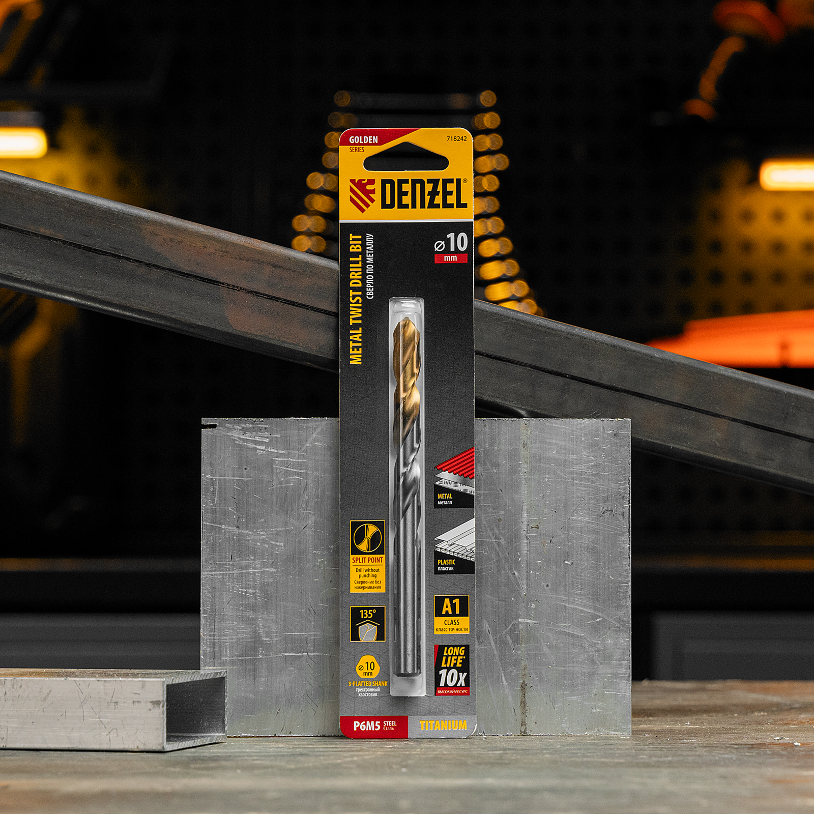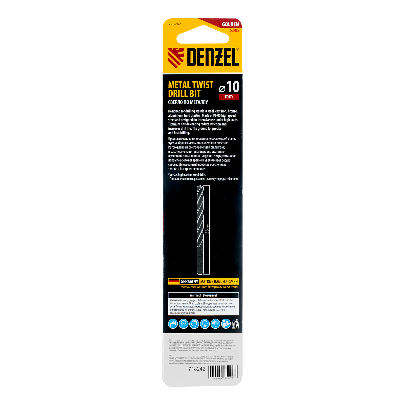 Спиральное сверло по металлу Denzel Golden Tip 718242 из стали P6M5, размером 10 х 133 мм, предназначено для получения отверстий в легированных и цветных металлах — меди, алюминии, мягкой бронзе, титане, латуни. Оснастка позволяет эффективно справляться с поставленными задачами благодаря оптимальному углу заточки 135°. Класс точности A гарантирует высокое качество полученных отверстий. Сверло используется для проведения монтажно-сборочных работ.