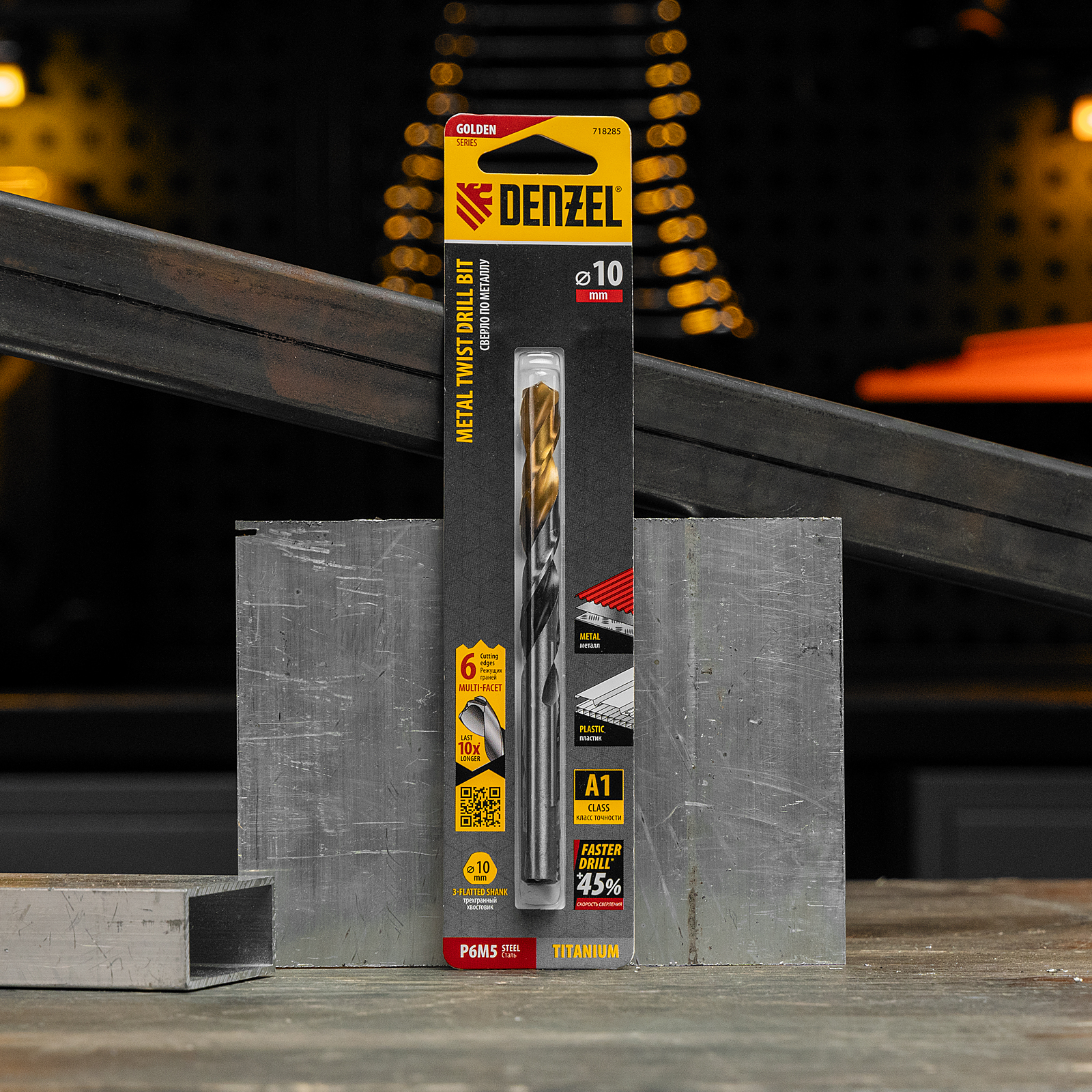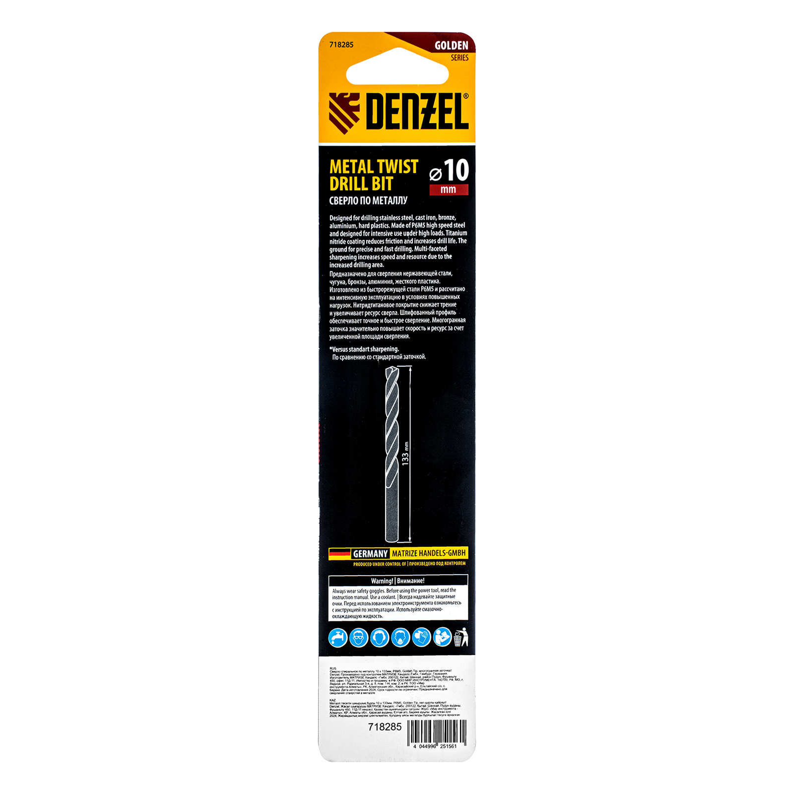 Спиральное сверло по металлу Denzel Golden Tip 718285 из стали P6M5, размером 10 х 133 мм, с многогранной заточкой, предназначено для получения отверстий в легированных сталях и цветных металлах. Многогранная заточка позволяет получать чистые и ровные отверстия практически без заусенцев. Сверлу присвоен класс точности A, что гарантирует высокое качество работ. Оснастка подходит для бытового и профессионального применения.