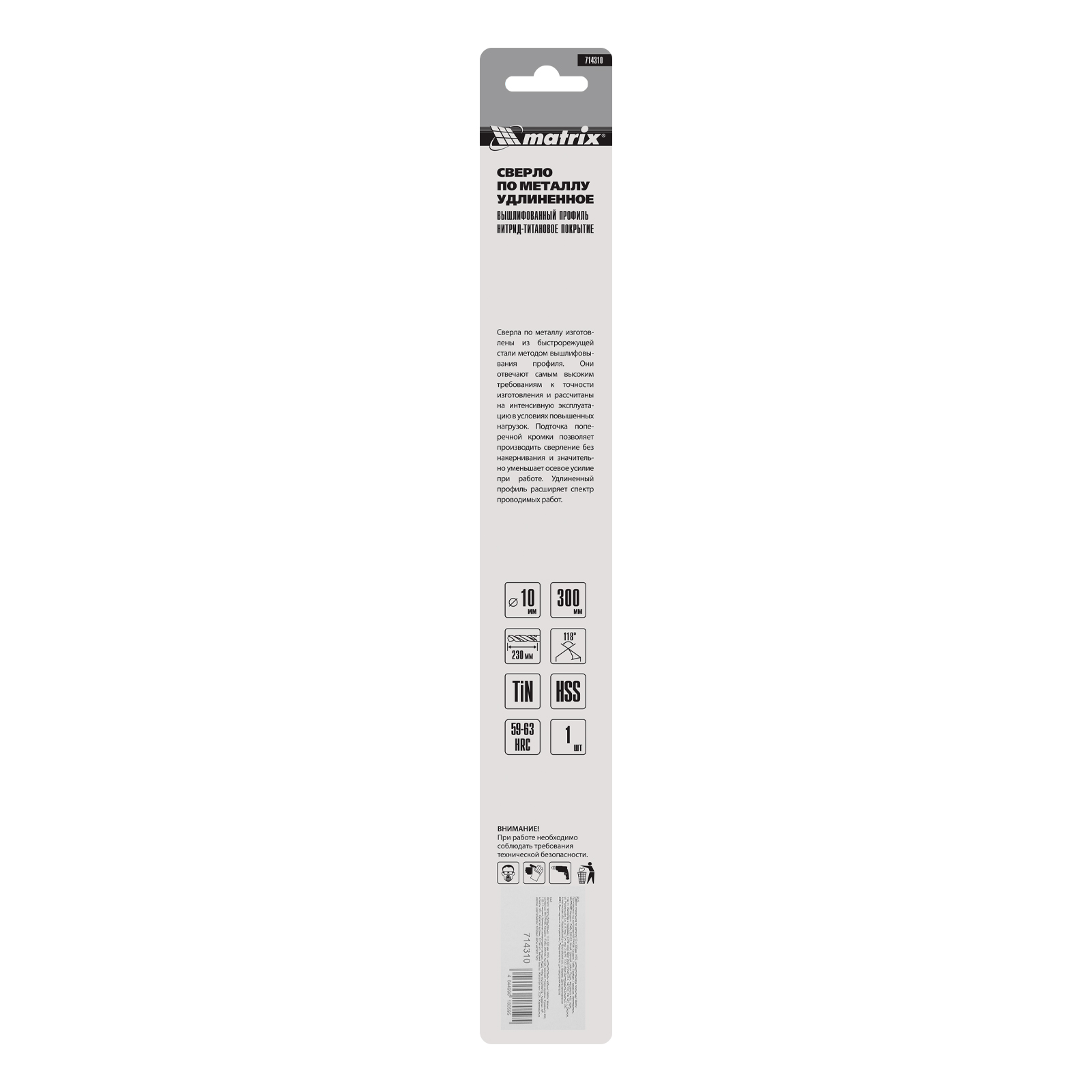 Спиральное сверло Matrix 714310 диаметром 10 мм, из стали HSS, с нитридтитановым покрытием и удлиненным профилем 300 мм, предназначено для получения глубоких отверстий в металле. Угол заточки 118° оптимален для работы с черными металлами, сталью, чугуном и твердой бронзой. Сверло испытывает уменьшенное осевое усилие во время работы, выдерживает интенсивные нагрузки и подходит для профессионального использования.