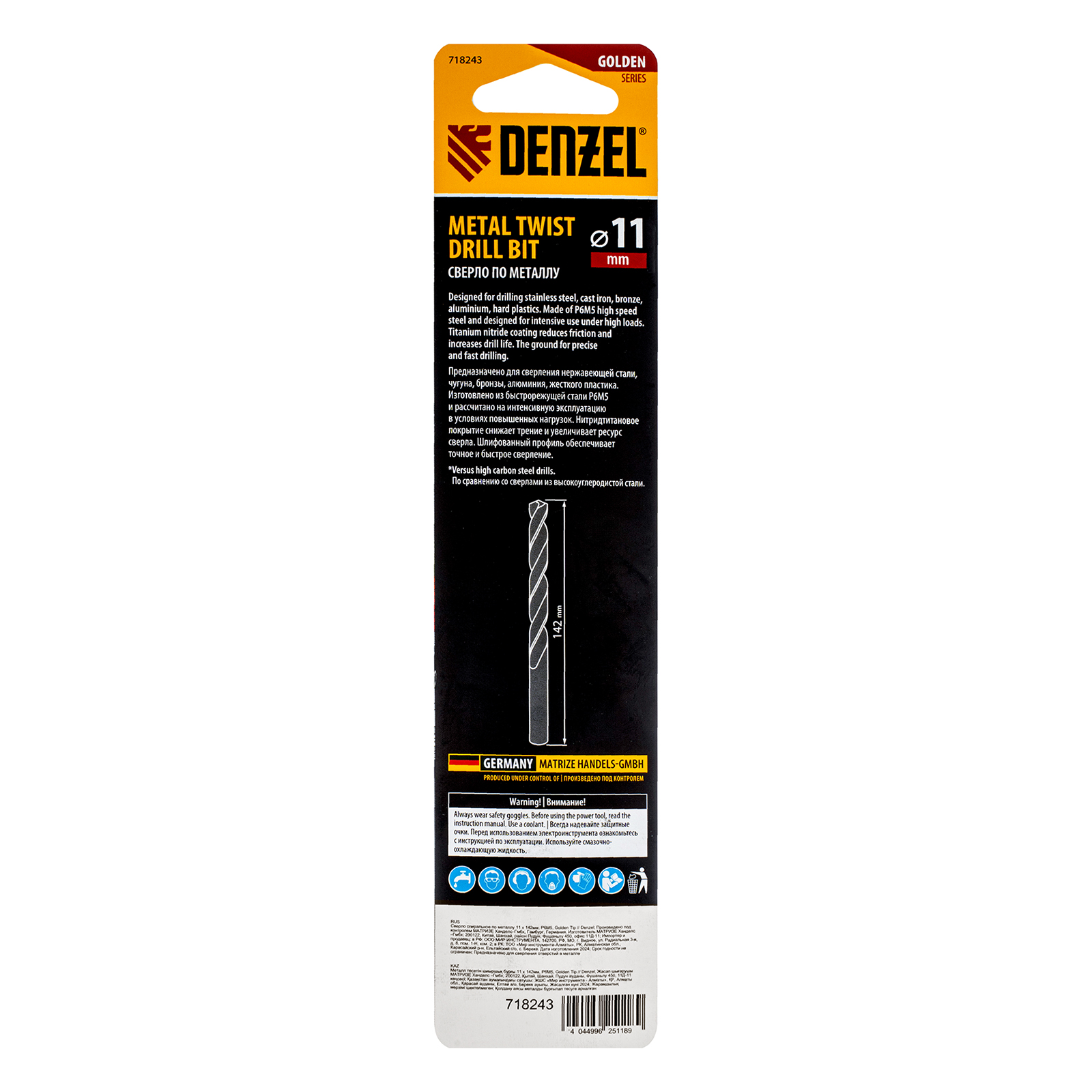 Спиральное сверло по металлу Denzel Golden Tip 718243 из стали P6M5, размером 11 х 142 мм, предназначено для получения отверстий в легированных и цветных металлах — меди, алюминии, мягкой бронзе, титане, латуни. Оснастка позволяет эффективно справляться с поставленными задачами благодаря оптимальному углу заточки 135°. Класс точности A гарантирует высокое качество полученных отверстий. Сверло используется для проведения монтажно-сборочных работ.