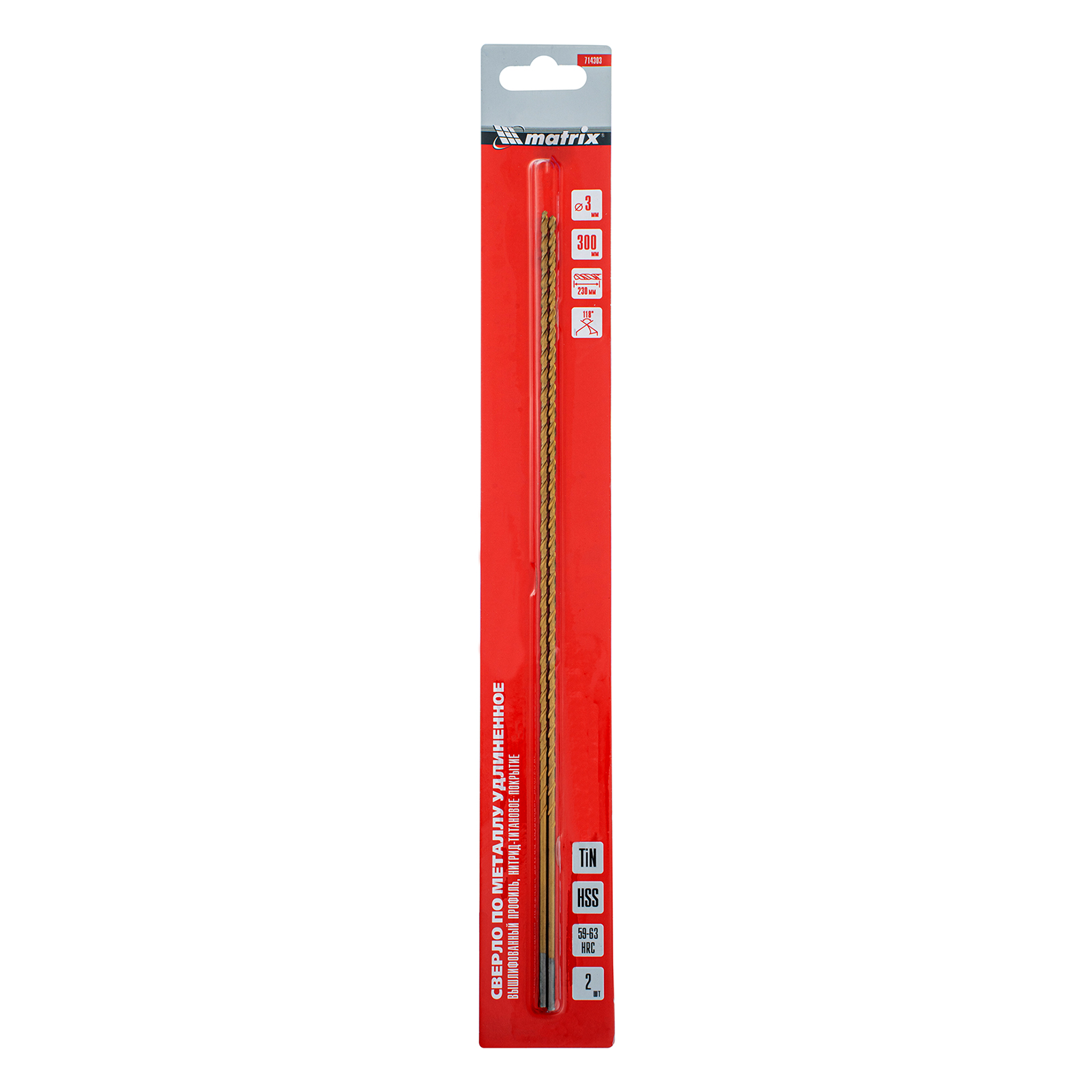 Спиральное сверло Matrix 714303 диаметром 3 мм, из стали HSS, с нитридтитановым покрытием и удлиненным профилем 300 мм, 2 шт. в упаковке, предназначено для получения глубоких отверстий в металле. Угол заточки 118° оптимален для работы с черными металлами, сталью, чугуном и твердой бронзой. Сверло испытывает уменьшенное осевое усилие во время работы, выдерживает интенсивные нагрузки и подходит для профессионального использования.