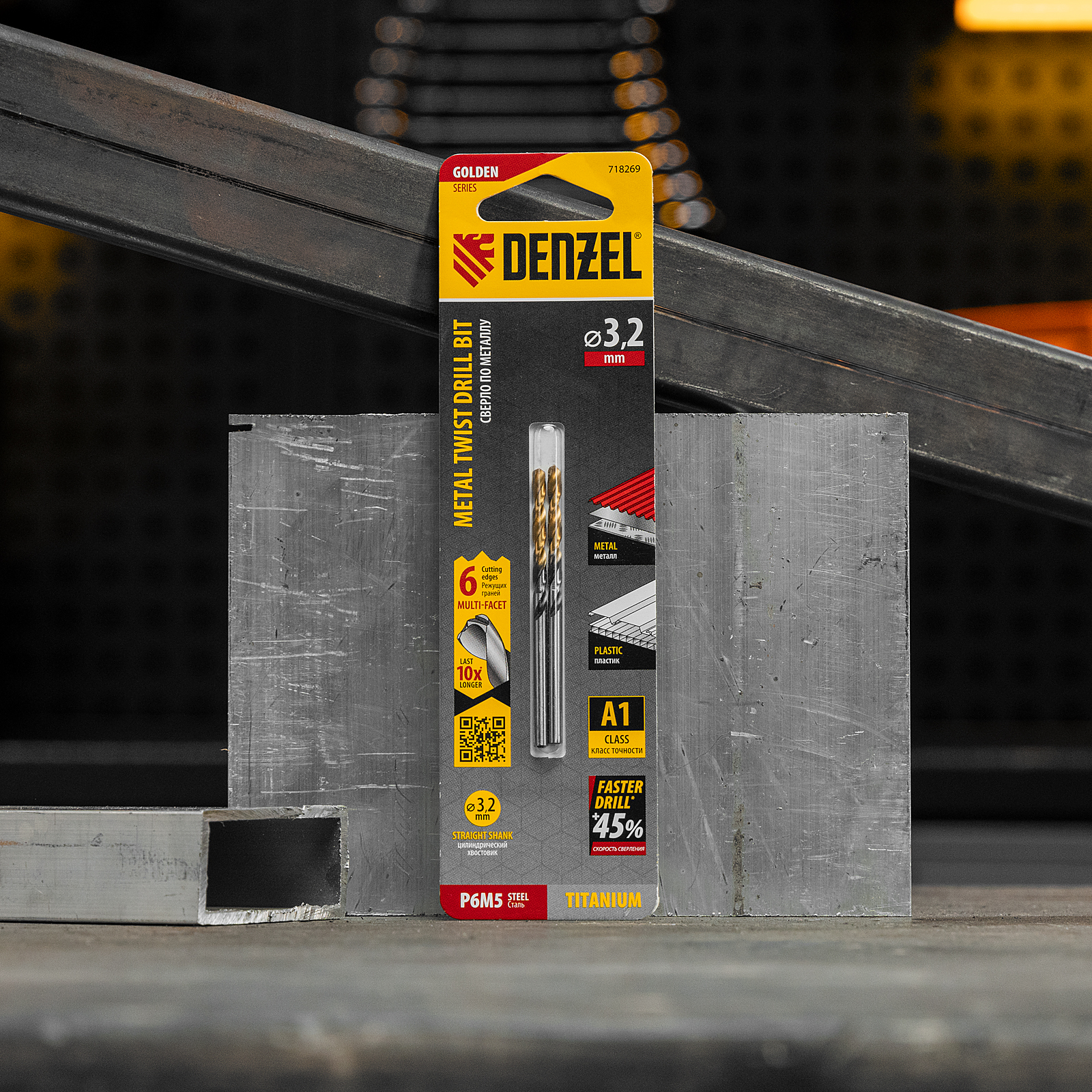Спиральное сверло по металлу Denzel Golden Tip 718269 из стали P6M5, размером 3,2 х 65 мм, с многогранной заточкой, 2 штуки в упаковке, предназначено для получения отверстий в легированных сталях и цветных металлах. Многогранная заточка позволяет получать чистые и ровные отверстия практически без заусенцев. Сверлу присвоен класс точности A, что гарантирует высокое качество работ. Оснастка подходит для бытового и профессионального применения.
