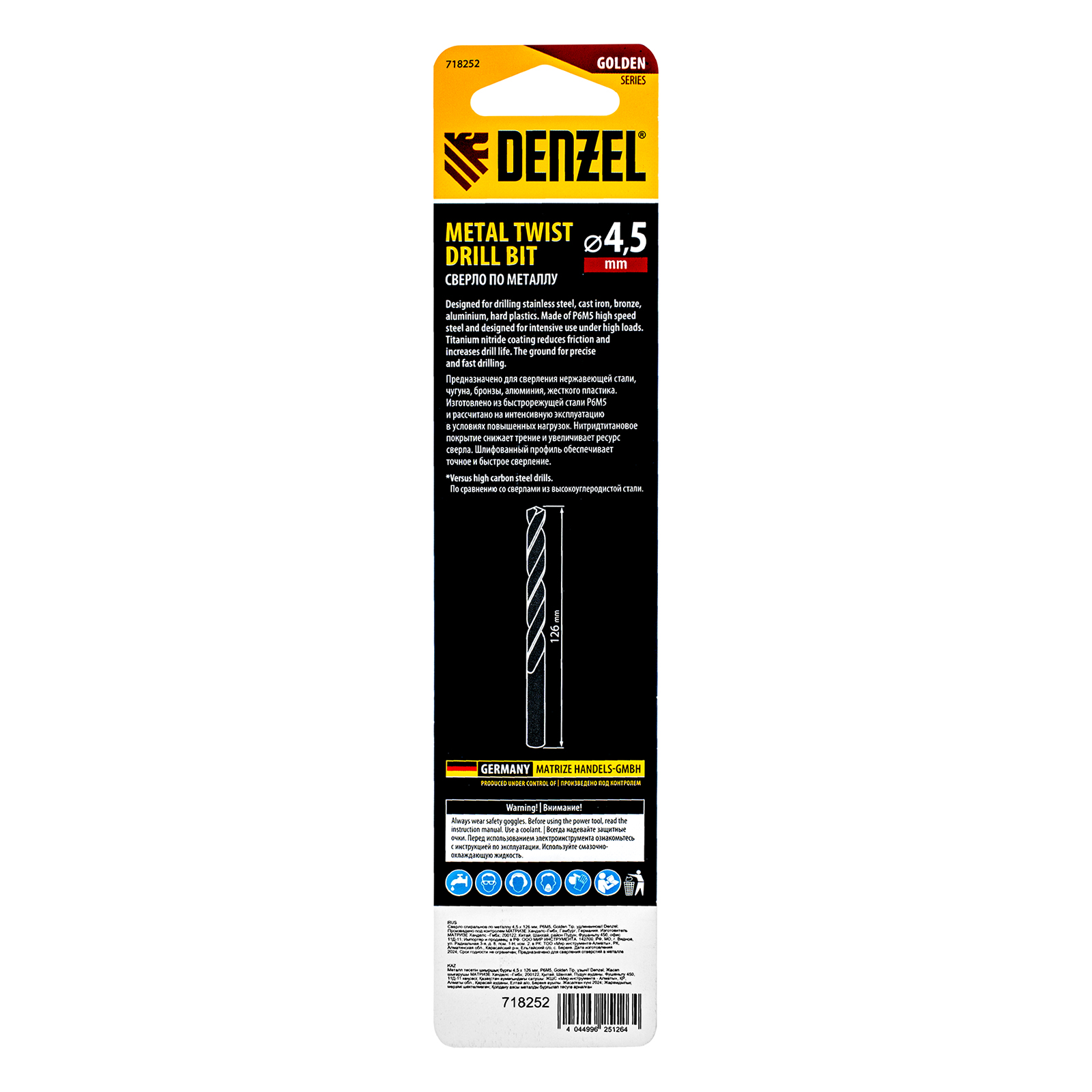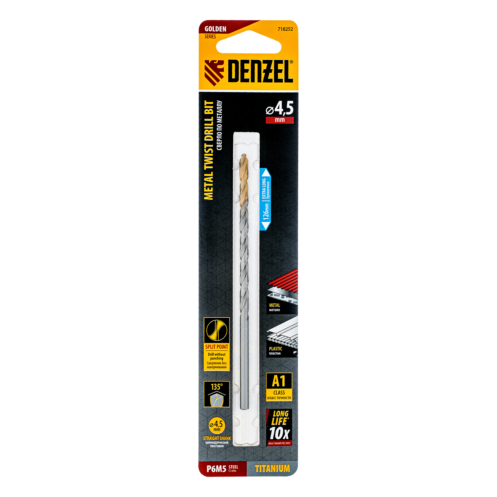 Удлиненное спиральное сверло по металлу Denzel Golden Tip 718252 из стали P6M5, размером 4,5 х 126 мм, предназначено для получения отверстий в легированных и цветных металлах — меди, алюминии, мягкой бронзе, титане, латуни. Оснастка позволяет эффективно справляться с этими задачами благодаря оптимальному углу заточки 135°. Класс точности A гарантирует высокое качество работ, а удлиненный профиль позволяет сверлить глубокие отверстия. Сверло используется для проведения монтажно-сборочных работ.