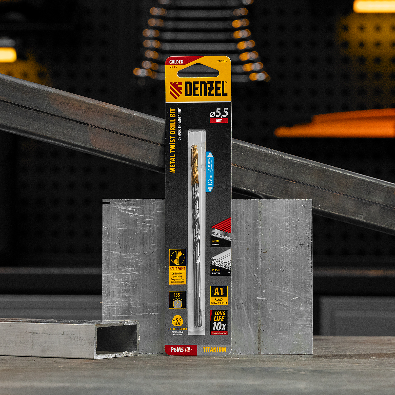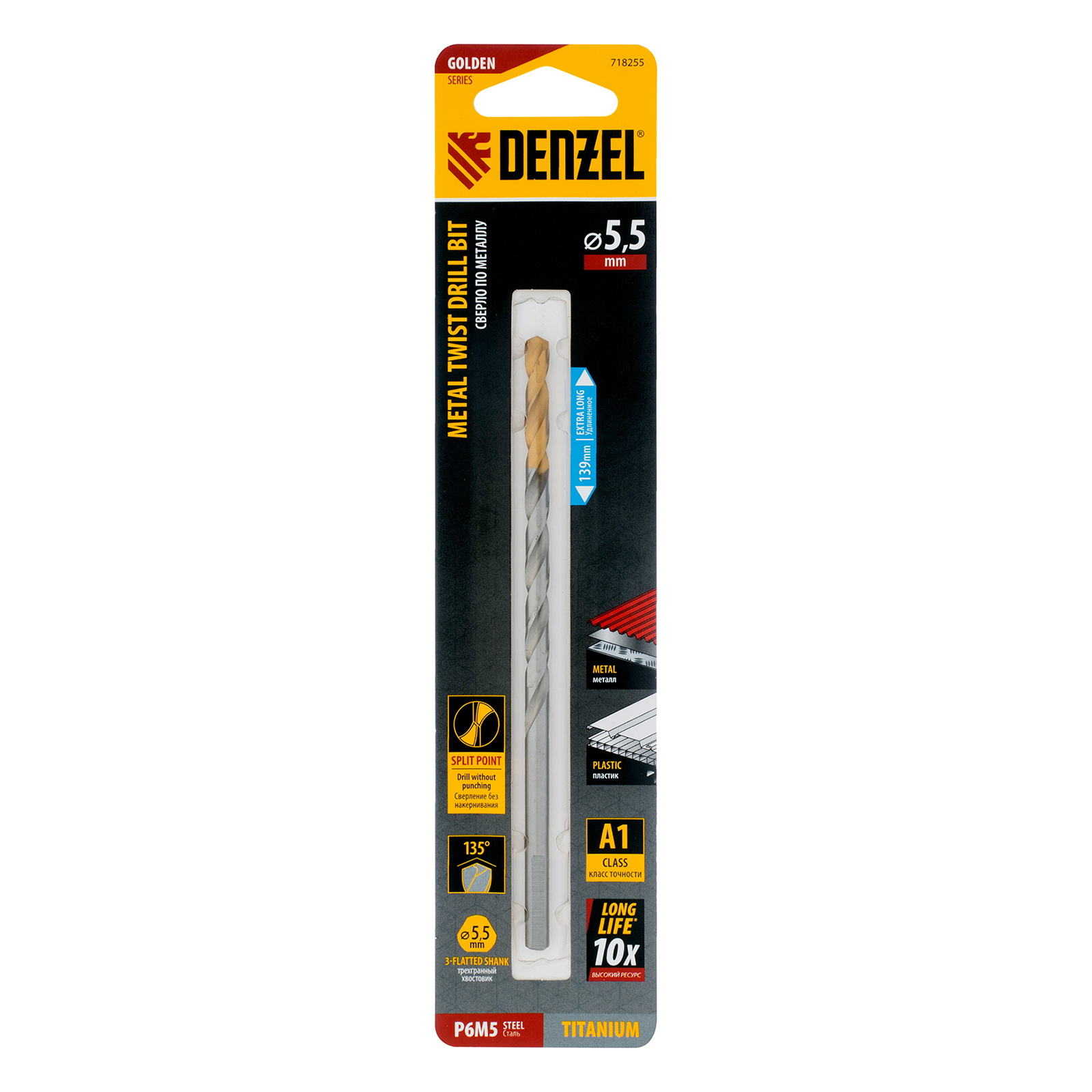 Удлиненное спиральное сверло по металлу Denzel Golden Tip 718255 из стали P6M5, размером 5,5 х 139 мм, предназначено для получения отверстий в легированных и цветных металлах — меди, алюминии, мягкой бронзе, титане, латуни. Оснастка позволяет эффективно справляться с этими задачами благодаря оптимальному углу заточки 135°. Класс точности A гарантирует высокое качество работ, а удлиненный профиль позволяет сверлить глубокие отверстия. Сверло используется для проведения монтажно-сборочных работ.
