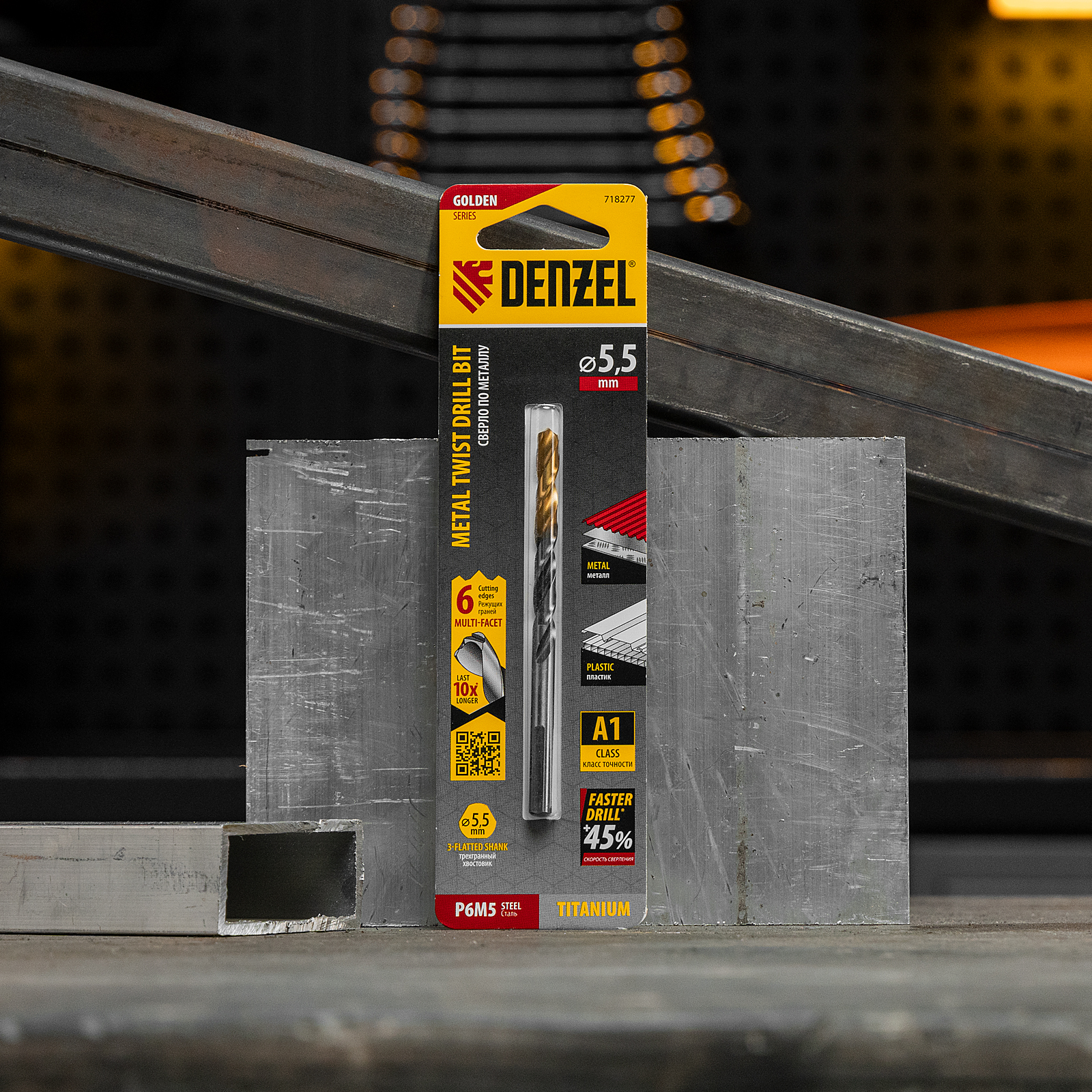 Спиральное сверло по металлу Denzel Golden Tip 718277 из стали P6M5, размером 5,5 х 93 мм, с многогранной заточкой, предназначено для получения отверстий в легированных сталях и цветных металлах. Многогранная заточка позволяет получать чистые и ровные отверстия практически без заусенцев. Сверлу присвоен класс точности A, что гарантирует высокое качество работ. Оснастка подходит для бытового и профессионального применения.