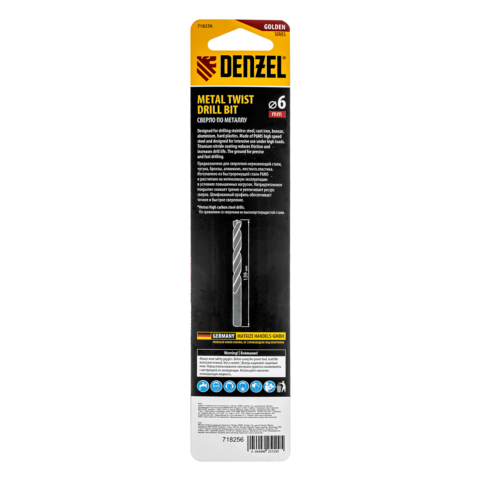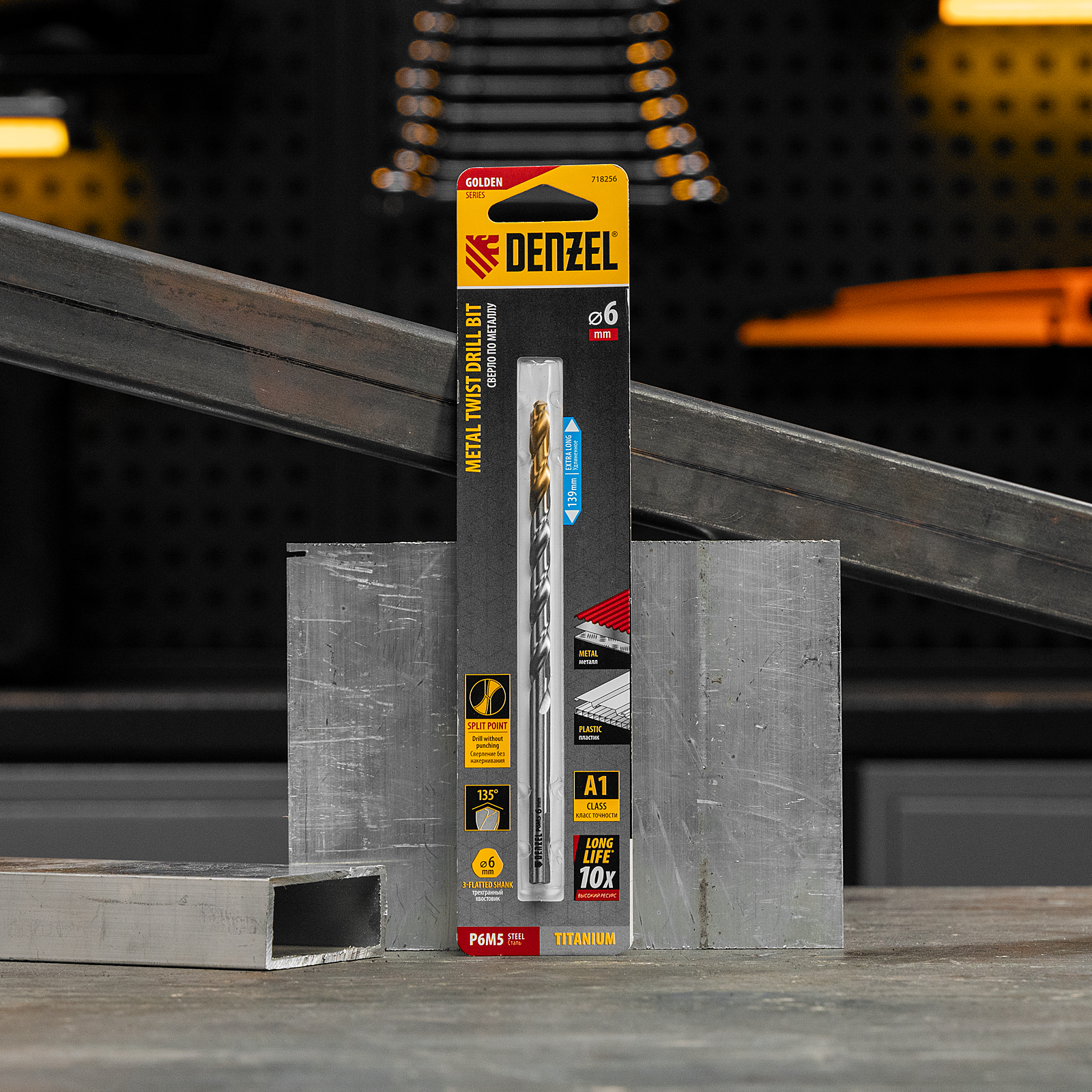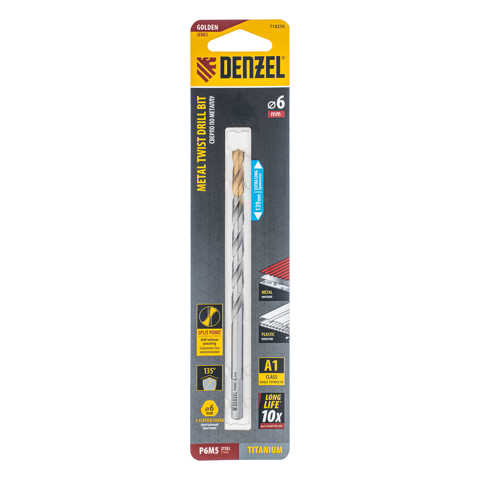 Удлиненное спиральное сверло по металлу Denzel Golden Tip 718256 из стали P6M5, размером 6 х 139 мм, предназначено для получения отверстий в легированных и цветных металлах — меди, алюминии, мягкой бронзе, титане, латуни. Оснастка позволяет эффективно справляться с этими задачами благодаря оптимальному углу заточки 135°. Класс точности A гарантирует высокое качество работ, а удлиненный профиль позволяет сверлить глубокие отверстия. Сверло используется для проведения монтажно-сборочных работ.