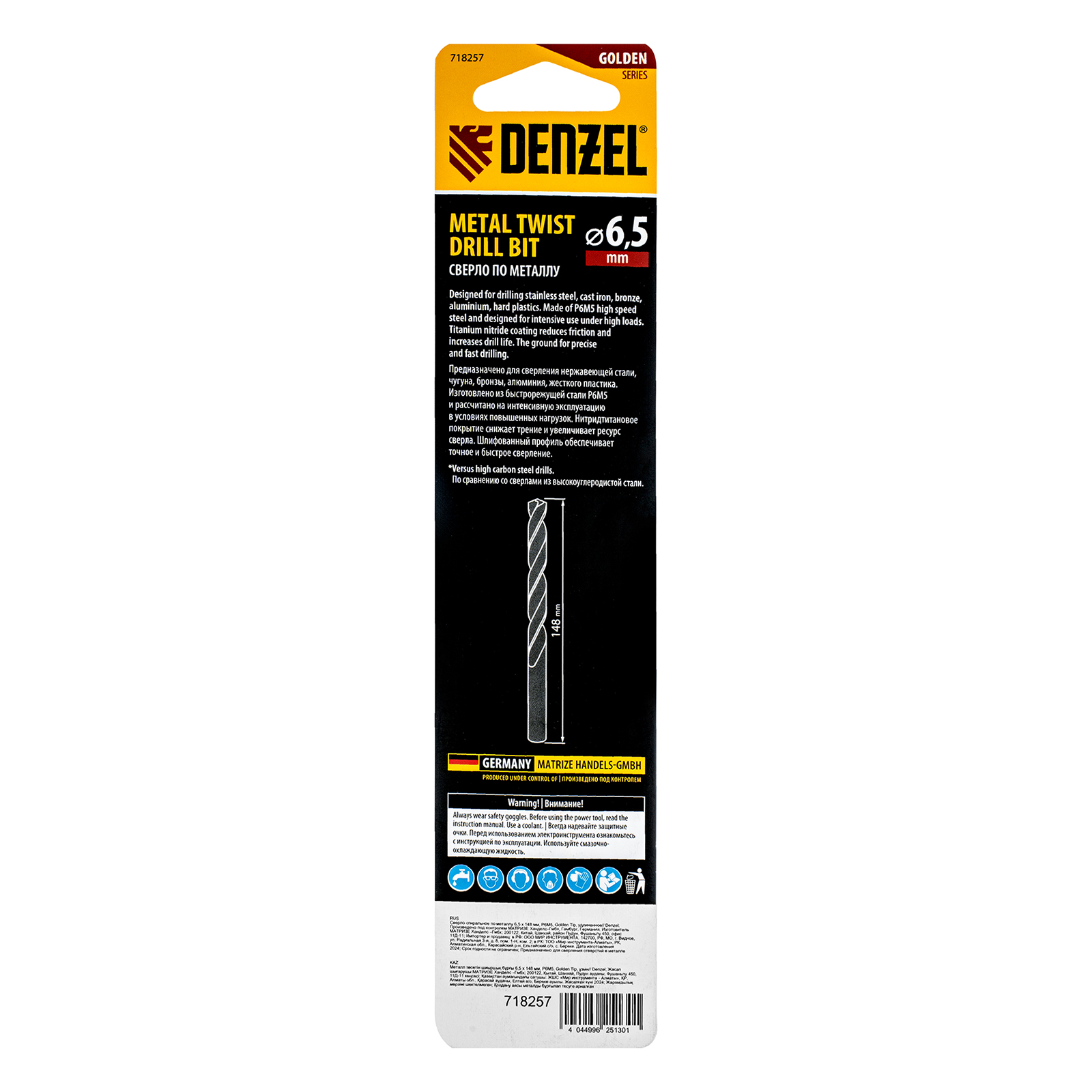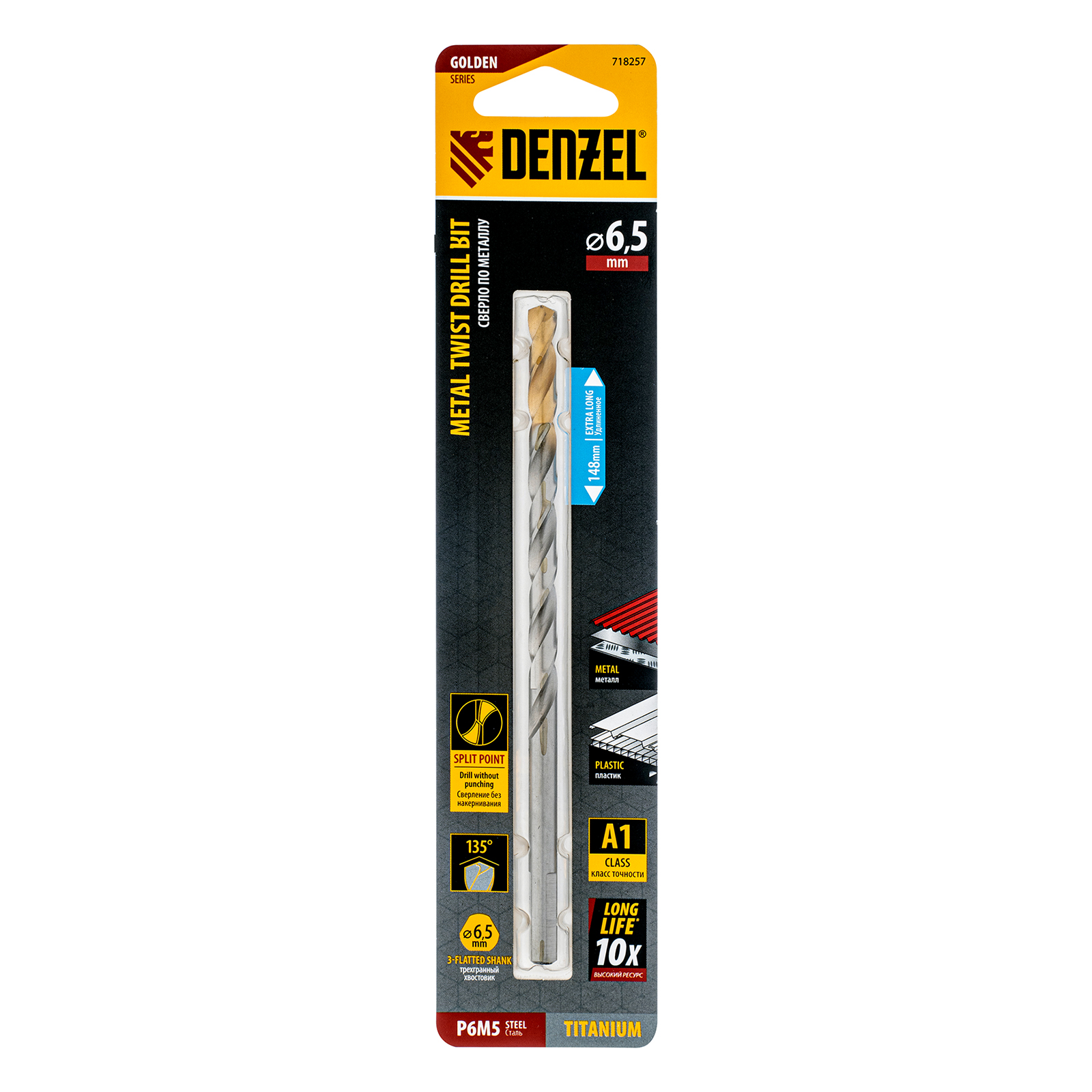 Удлиненное спиральное сверло по металлу Denzel Golden Tip 718257 из стали P6M5, размером 6,5 х 148 мм, предназначено для получения отверстий в легированных и цветных металлах — меди, алюминии, мягкой бронзе, титане, латуни. Оснастка позволяет эффективно справляться с этими задачами благодаря оптимальному углу заточки 135°. Класс точности A гарантирует высокое качество работ, а удлиненный профиль позволяет сверлить глубокие отверстия. Сверло используется для проведения монтажно-сборочных работ.
