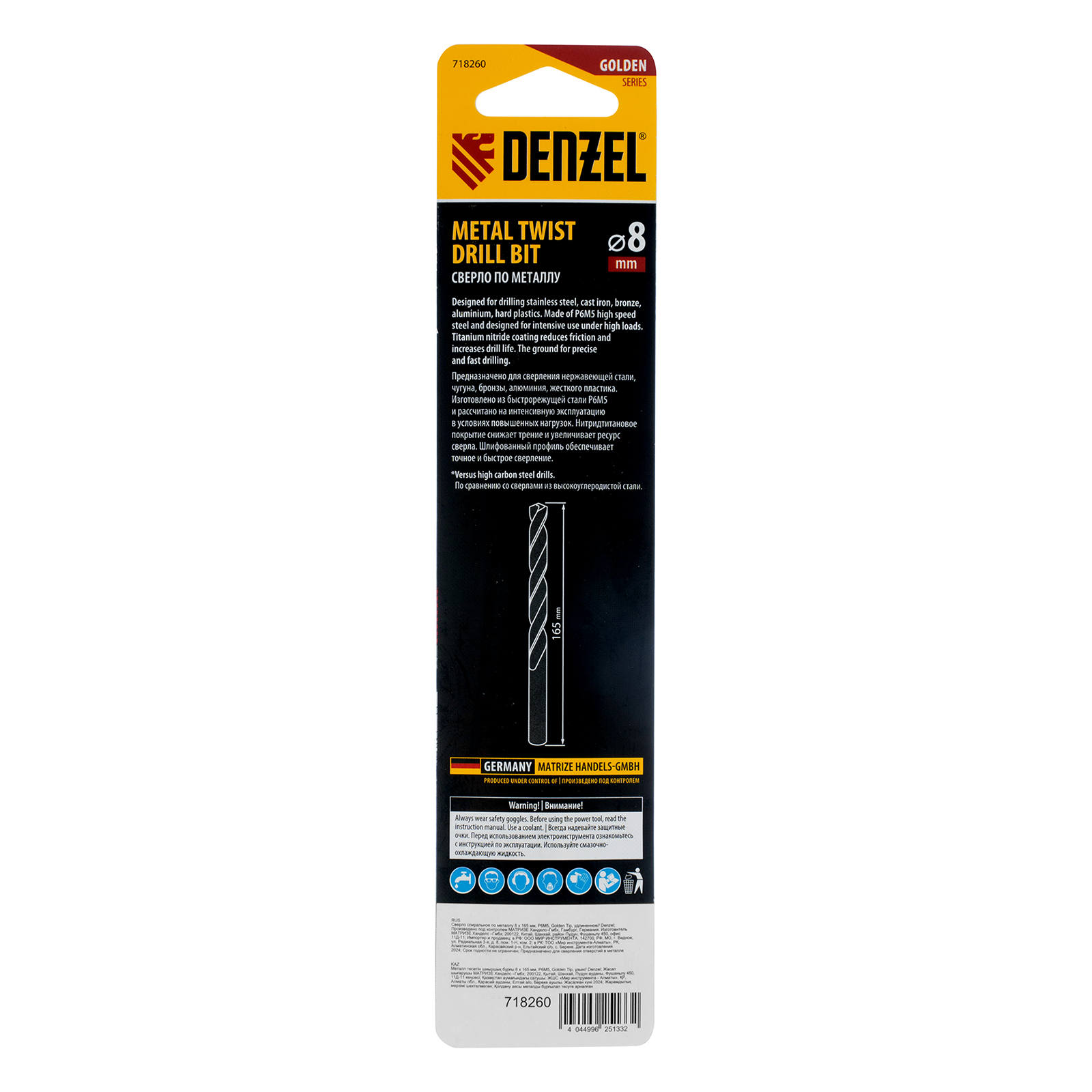 Удлиненное спиральное сверло по металлу Denzel Golden Tip 718260 из стали P6M5, размером 8 х 165 мм, предназначено для получения отверстий в легированных и цветных металлах — меди, алюминии, мягкой бронзе, титане, латуни. Оснастка позволяет эффективно справляться с этими задачами благодаря оптимальному углу заточки 135°. Класс точности A гарантирует высокое качество работ, а удлиненный профиль позволяет сверлить глубокие отверстия. Сверло используется для проведения монтажно-сборочных работ.