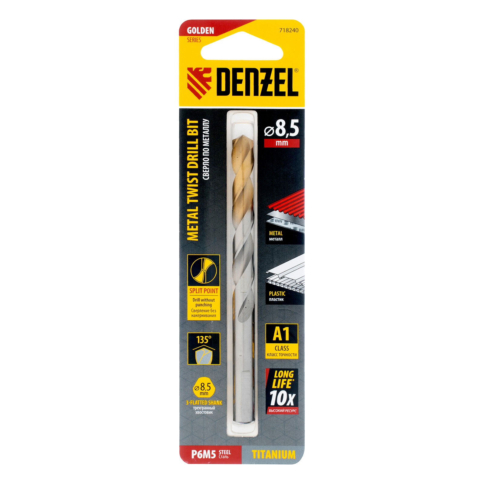 Спиральное сверло по металлу Denzel Golden Tip 718240 из стали P6M5, размером 8,5 х 117 мм, предназначено для получения отверстий в легированных и цветных металлах — меди, алюминии, мягкой бронзе, титане, латуни. Оснастка позволяет эффективно справляться с поставленными задачами благодаря оптимальному углу заточки 135°. Класс точности A гарантирует высокое качество полученных отверстий. Сверло используется для проведения монтажно-сборочных работ.