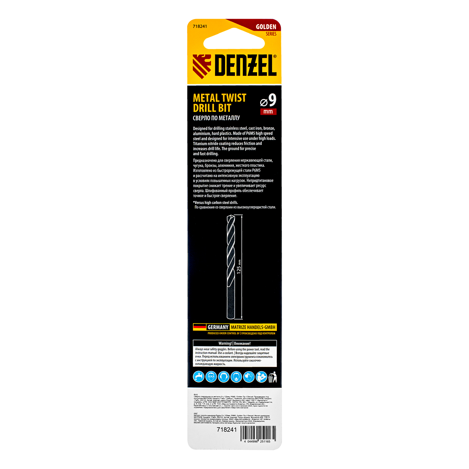 Спиральное сверло по металлу Denzel Golden Tip 718241 из стали P6M5, размером 9 х 125 мм, предназначено для получения отверстий в легированных и цветных металлах — меди, алюминии, мягкой бронзе, титане, латуни. Оснастка позволяет эффективно справляться с поставленными задачами благодаря оптимальному углу заточки 135°. Класс точности A гарантирует высокое качество полученных отверстий. Сверло используется для проведения монтажно-сборочных работ.