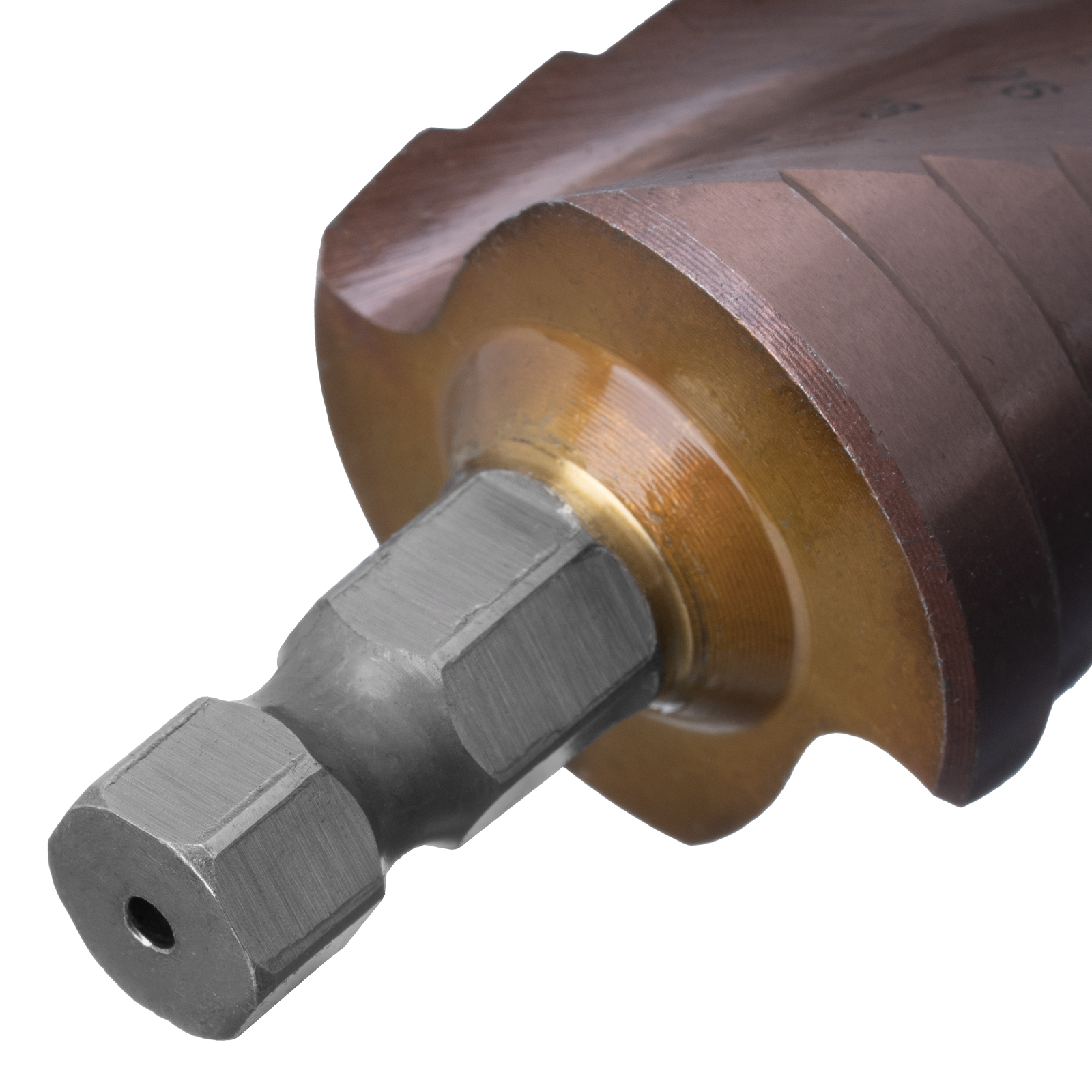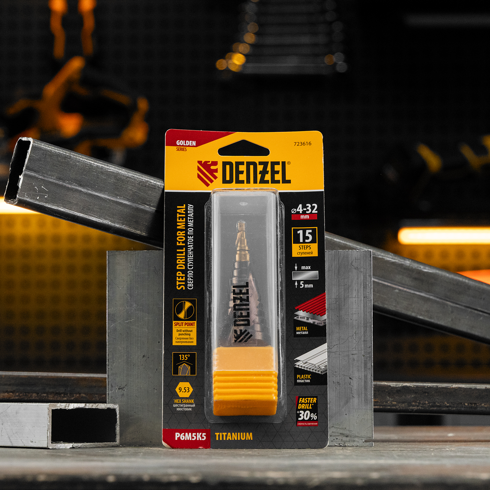 Ступенчатое сверло Denzel 723616 из стали P6M5K5, с 6-гранным хвостовиком, предназначено для сверления отверстий диаметром от 4 до 32 мм в сталях, цветных металлах и пластике. Избавляет от необходимости иметь при себе целый набор традиционных сверл. Позволяет получать отверстия с ровными краями и уже снятой фаской под гайку или болт. Оснастке присвоен класс точности A1. Сверло пригодится дома и в мастерской.