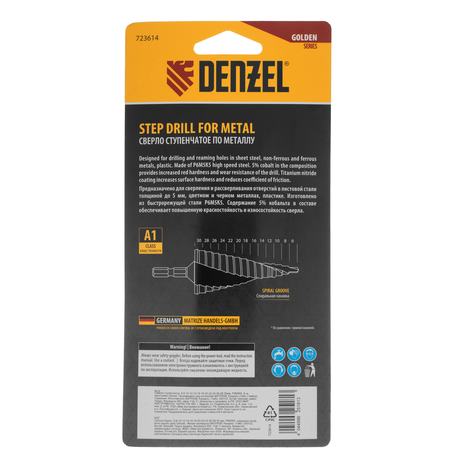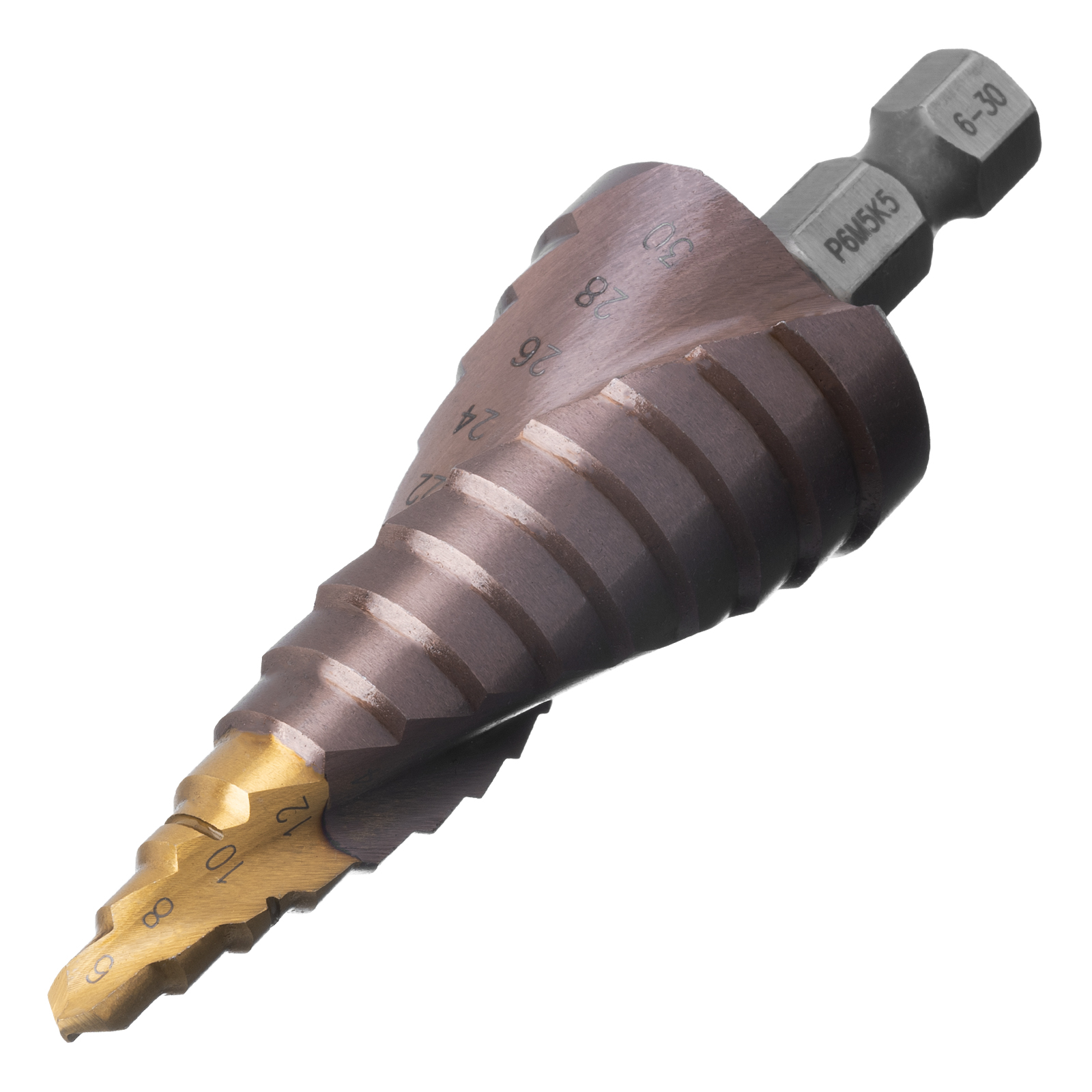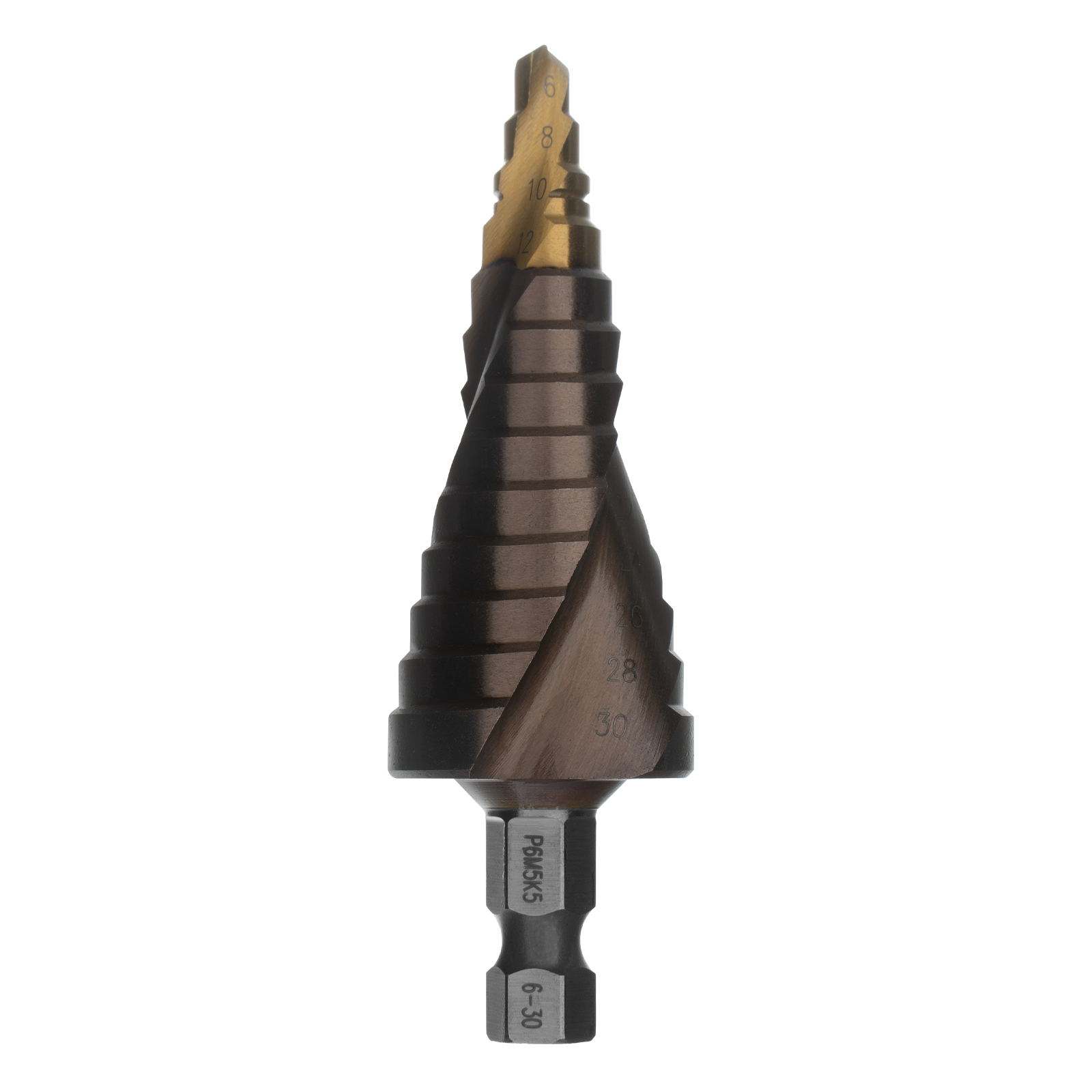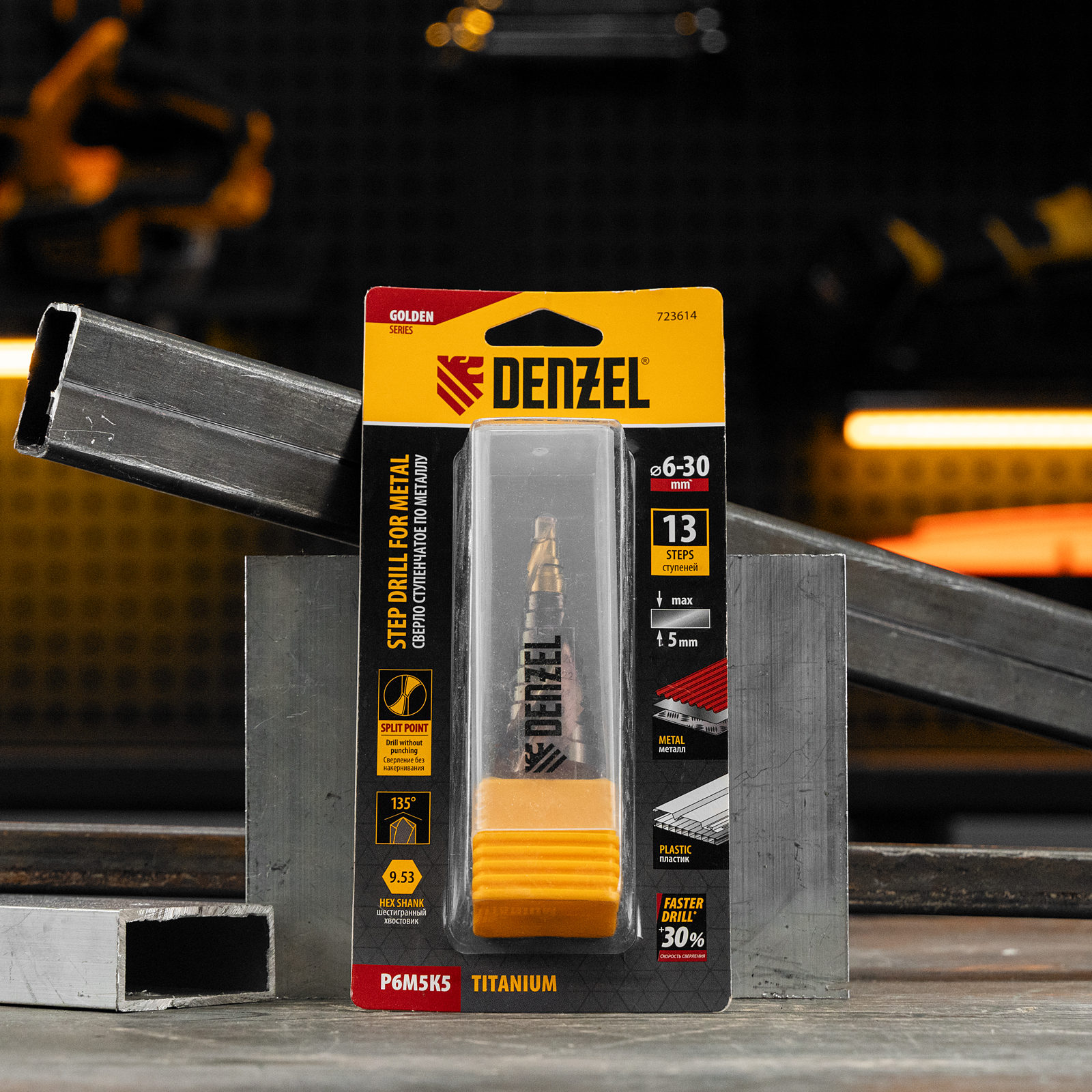 Ступенчатое сверло Denzel 723614 из стали P6M5K5, с 6-гранным хвостовиком, предназначено для сверления отверстий диаметром от 6 до 30 мм в сталях, цветных металлах и пластике. Избавляет от необходимости иметь при себе целый набор традиционных сверл. Позволяет получать отверстия с ровными краями и уже снятой фаской под гайку или болт. Оснастке присвоен класс точности A1. Сверло пригодится дома и в мастерской.
