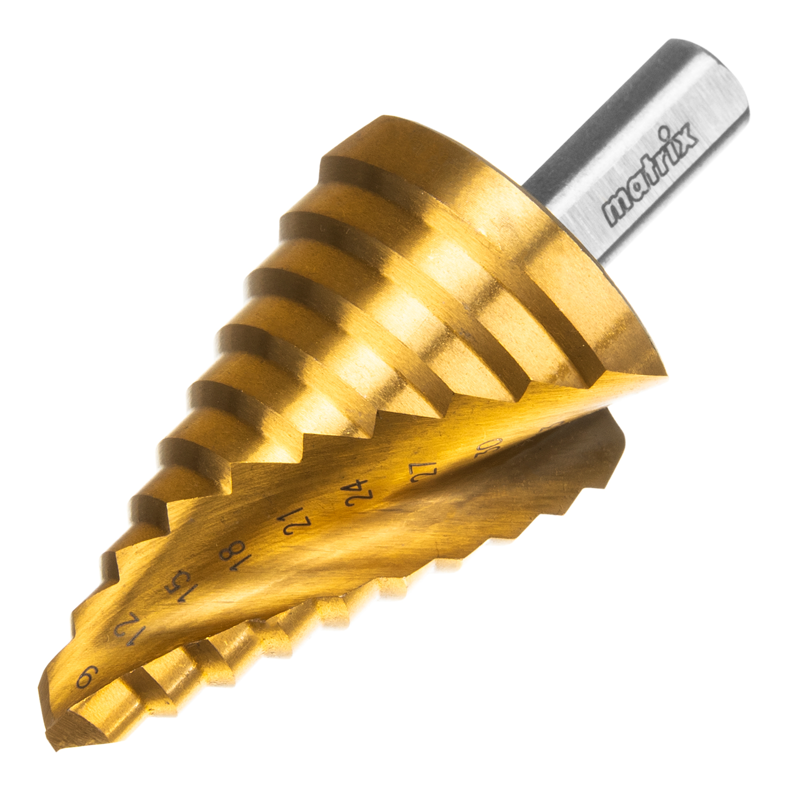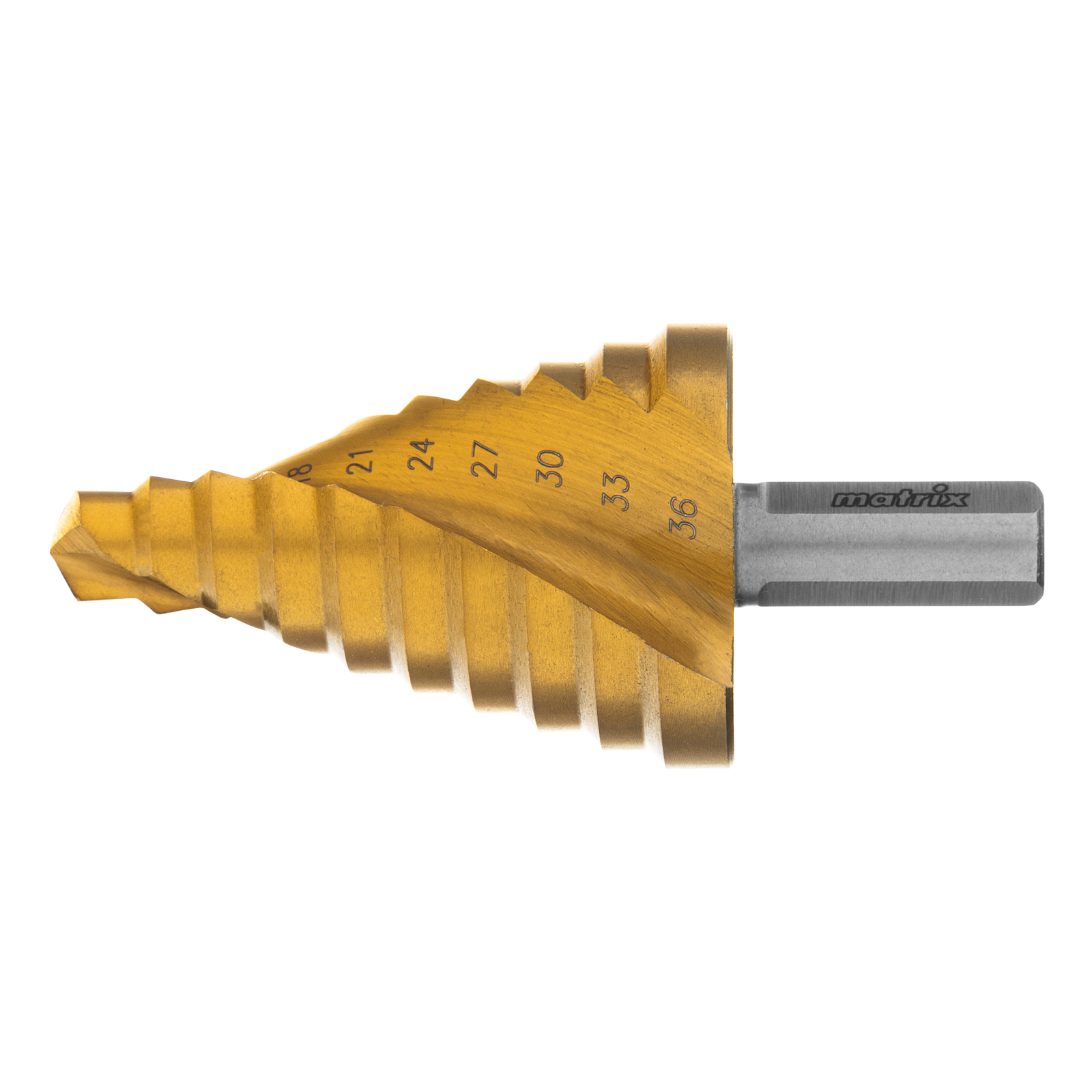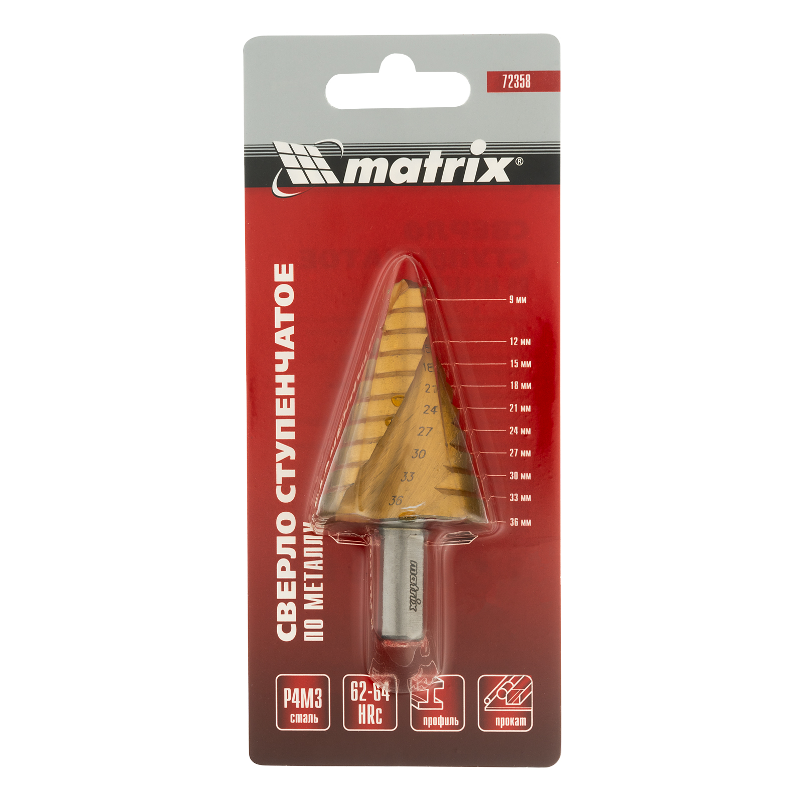 Ступенчатое сверло Matrix 72358 из стали HSS, со спиральным профилем и трехгранным хвостовиком, позволяет получать отверстия диаметром 9-12-15-18-21-24-27-30-33-36 мм в материалах толщиной до 5 мм: стали, цветных металлах, нержавейке и пластике. Благодаря плавному ступенчатому переходу и возможности сразу снять фаску отверстие получается аккуратным и имеет ровные края.