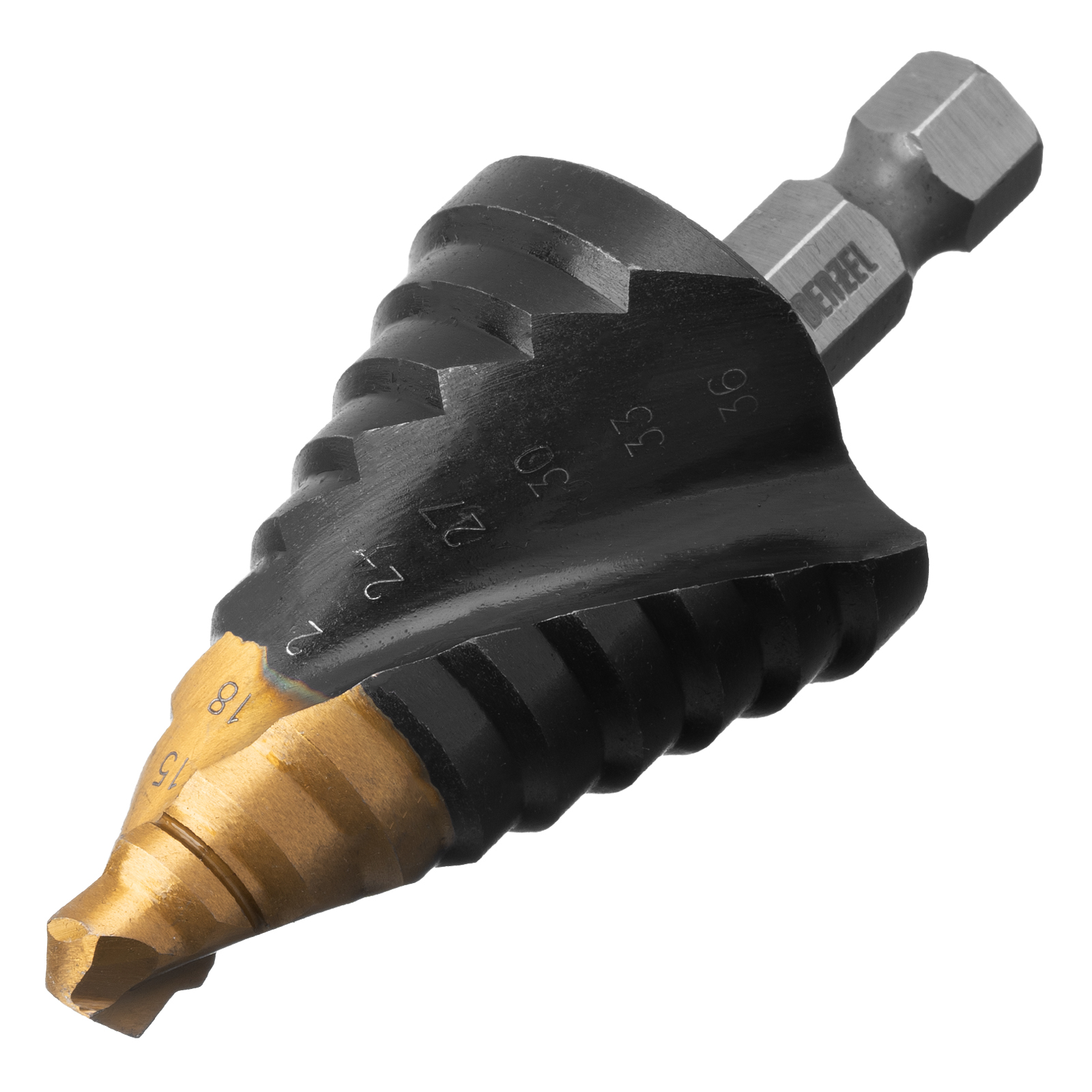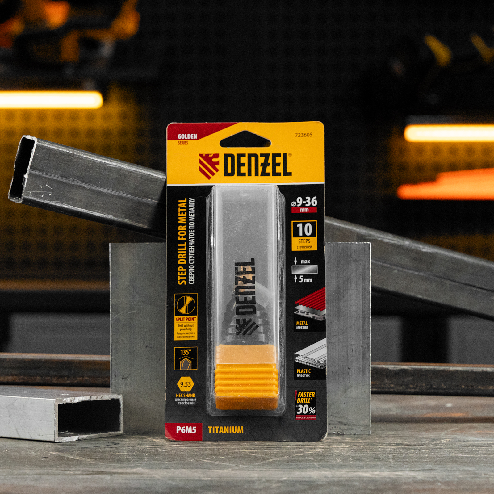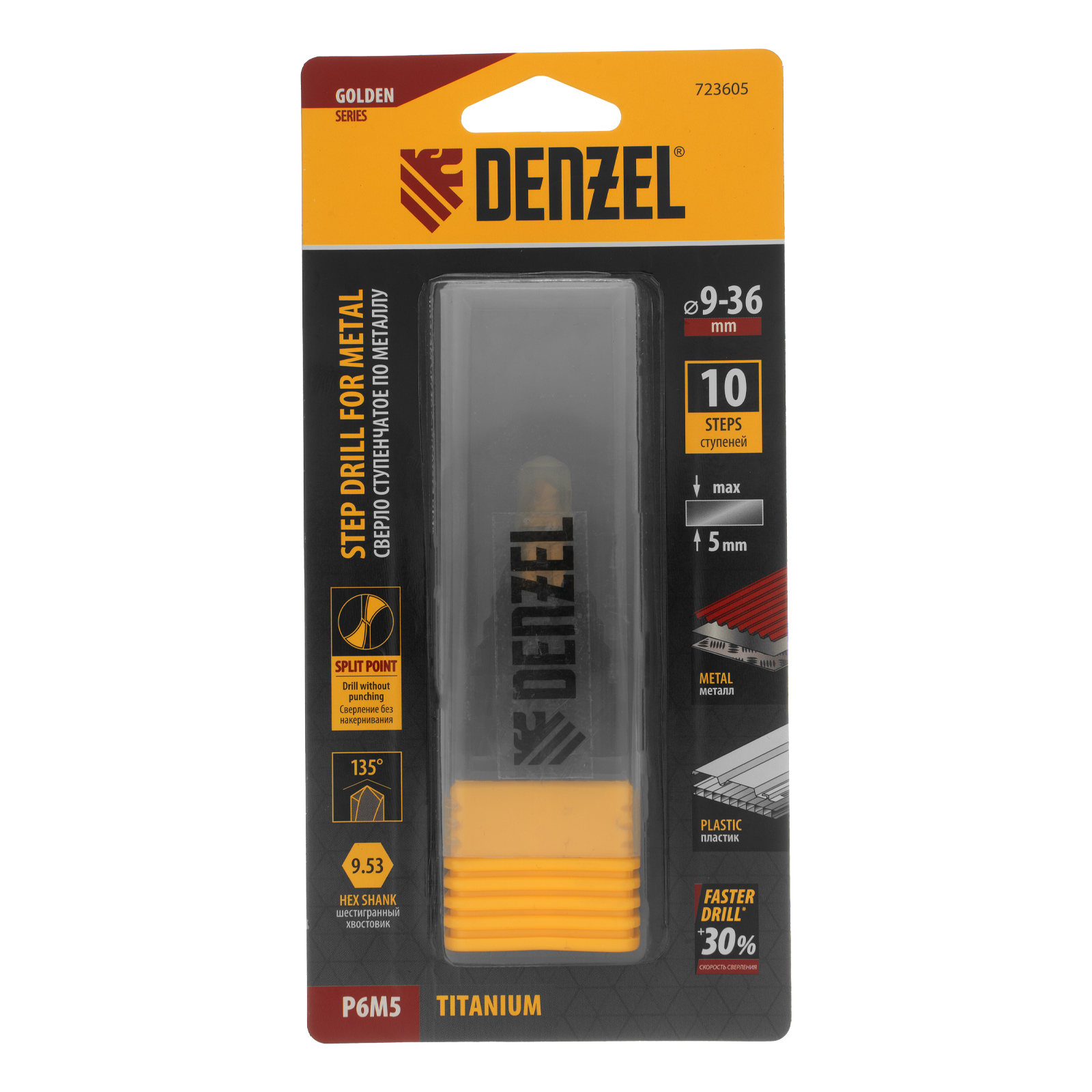 Ступенчатое сверло Denzel 723605 из стали P6M5, с 6-гранным хвостовиком, предназначено для сверления отверстий диаметром от 9 до 36 мм в сталях, цветных металлах и пластике. Избавляет от необходимости иметь при себе целый набор традиционных сверл. Позволяет получать отверстия с ровными краями и уже снятой фаской под гайку или болт. Оснастке присвоен класс точности A1. Сверло пригодится дома и в мастерской.