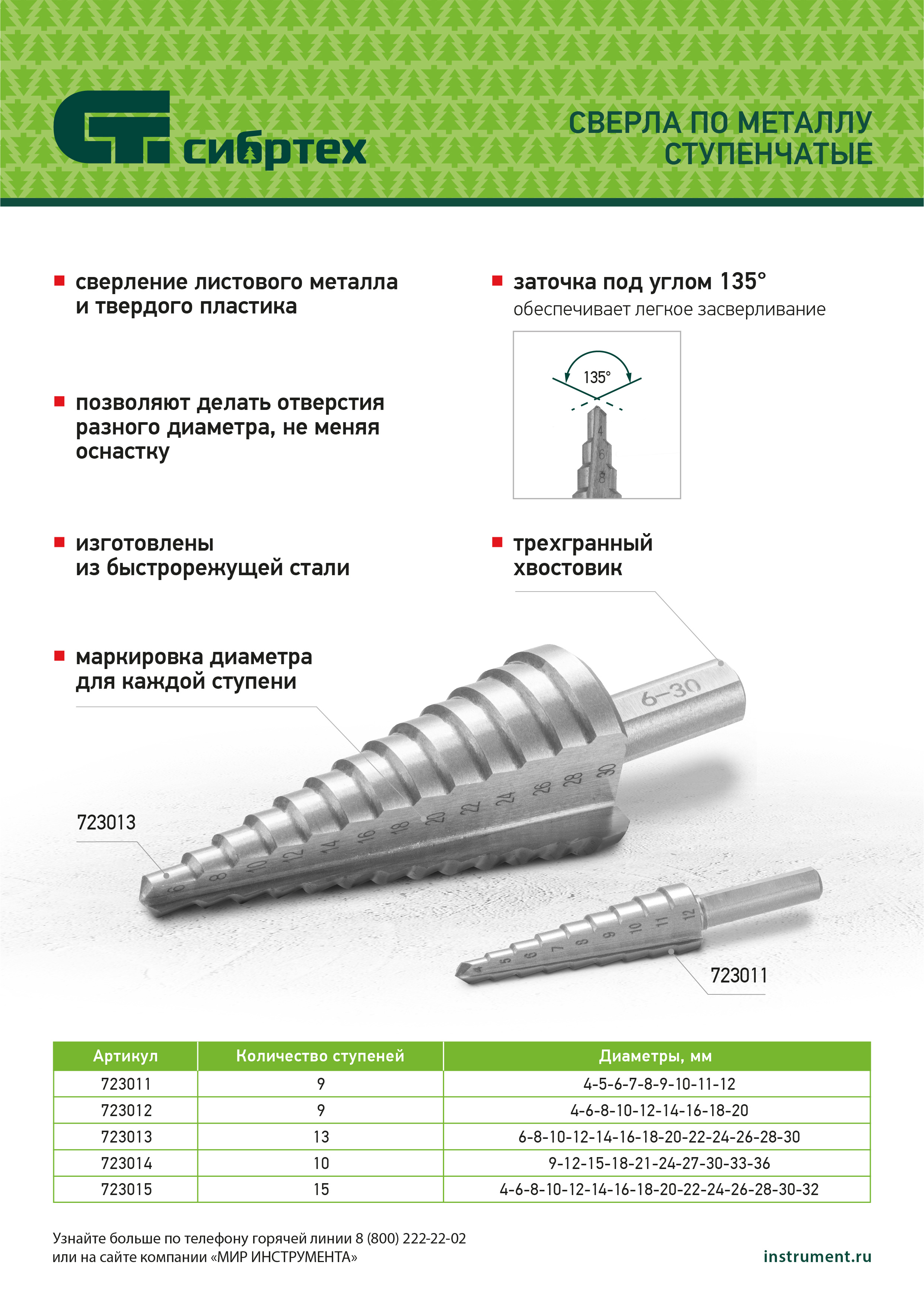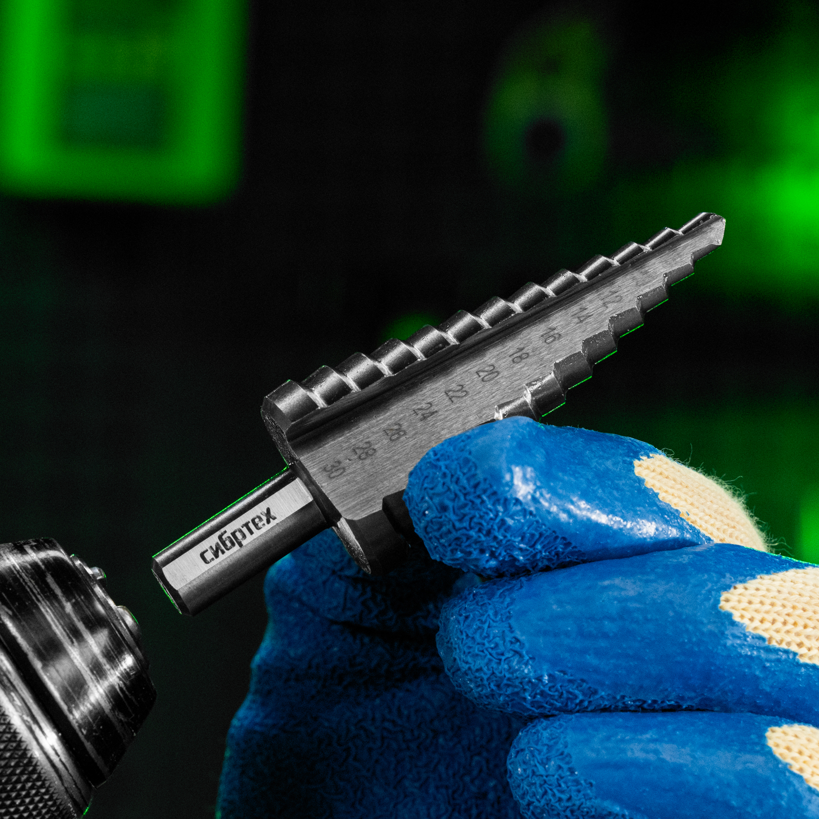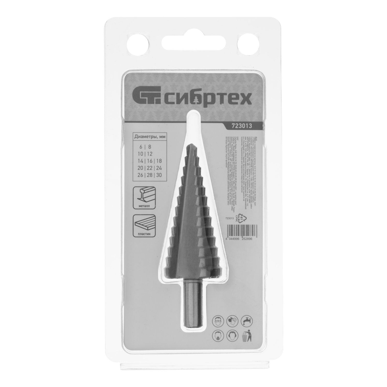 Ступенчатое сверло Сибртех 723013 предназначено для сверления отверстий диаметром от 6 до 30 мм в сталях, цветных металлах и пластике. Избавляет от необходимости иметь при себе целый набор традиционных сверл. Позволяет получать отверстия с ровными краями и уже снятой фаской под гайку или болт. Сверло пригодится дома и в мастерской.
