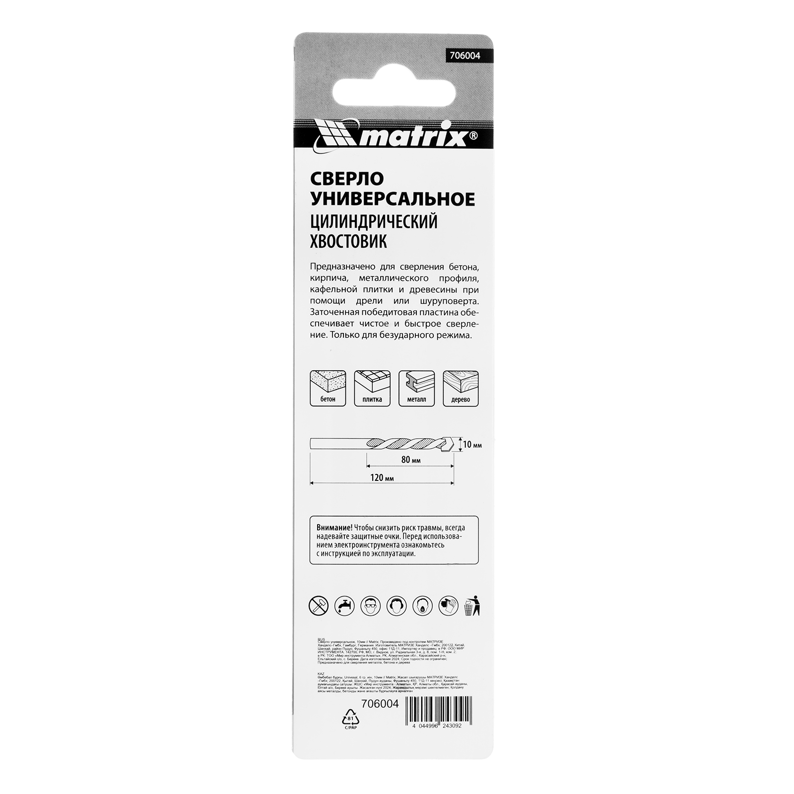 Универсальное сверло Matrix 706004 длиной 120 мм позволяет получать отверстия диаметром 10 мм в древесине, керамической плитке, а также в стали и бетоне с помощью дрели или шуруповерта. Твердосплавная режущая пластина обеспечивает эффективную работу с любыми материалами. Сверло пригодится в мастерской, гараже, а также дома и на даче.