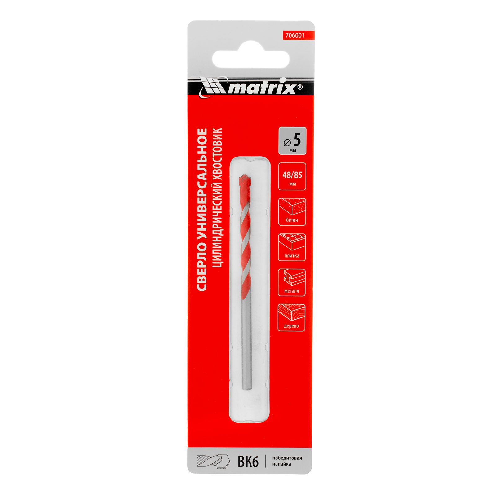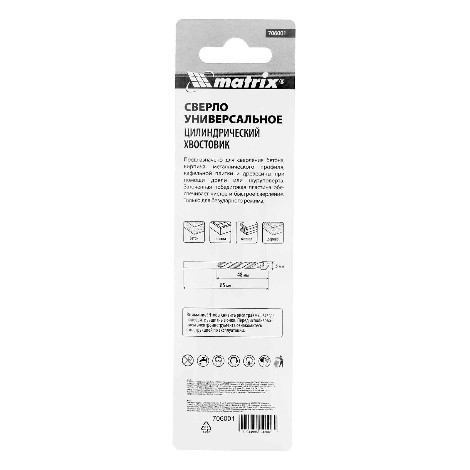 Универсальное сверло Matrix 706001 длиной 85 мм позволяет получать отверстия диаметром 5 мм в древесине, керамической плитке, а также в стали и бетоне с помощью дрели или шуруповерта. Твердосплавная режущая пластина обеспечивает эффективную работу с любыми материалами. Сверло пригодится в мастерской, гараже, а также дома и на даче.