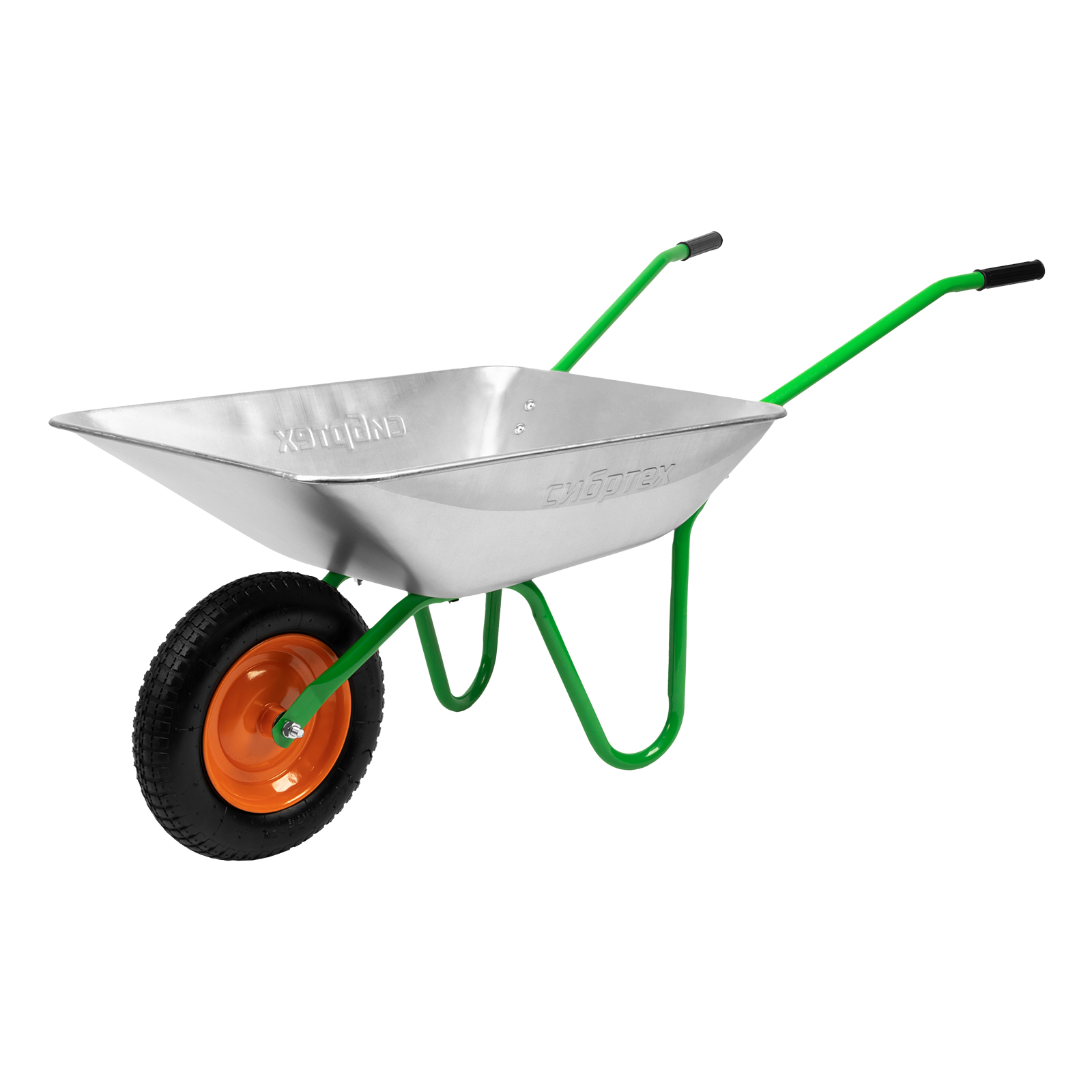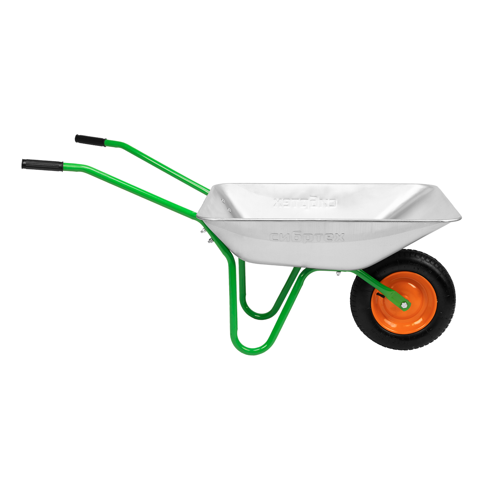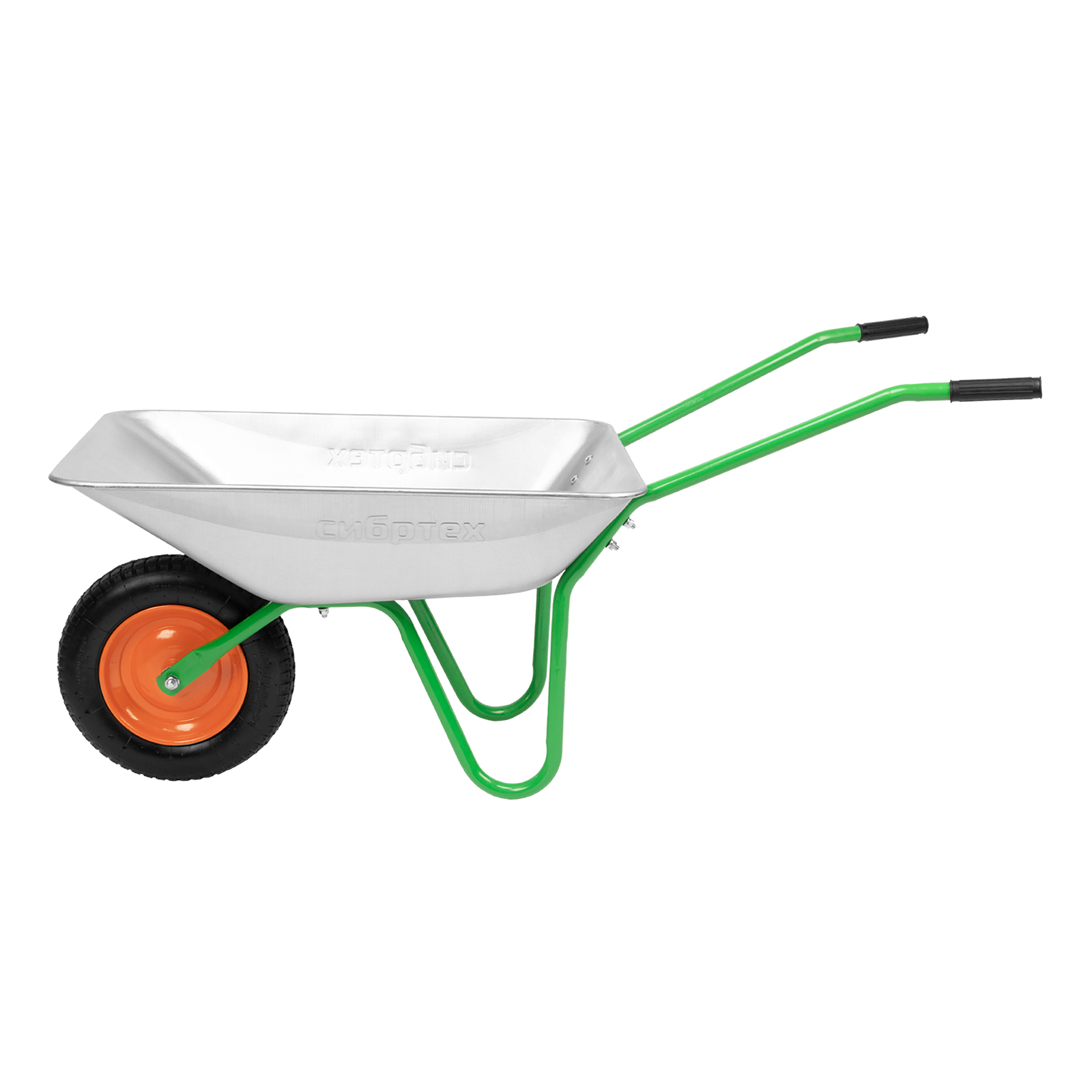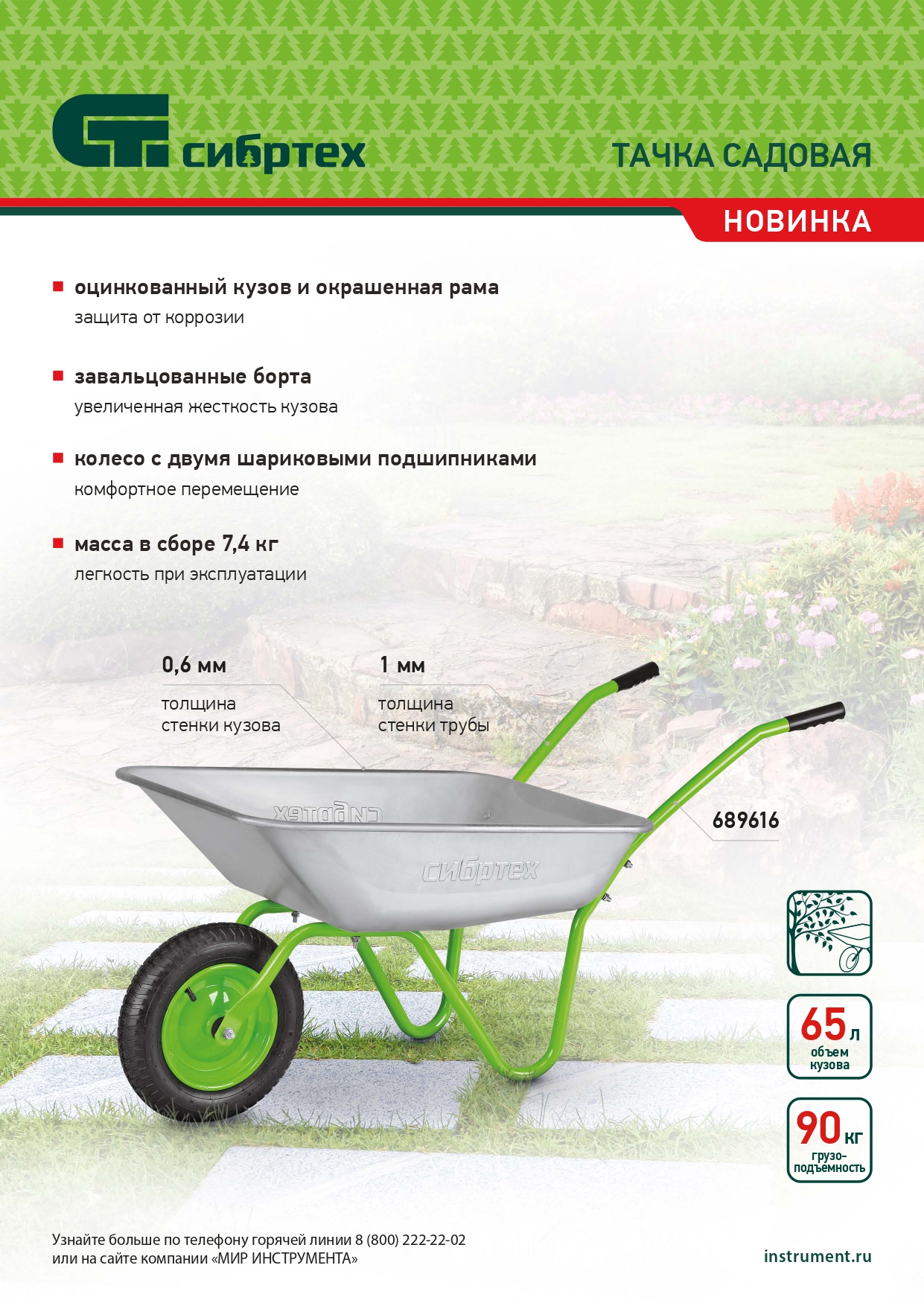 Садовая тачка Сибртех 689616 грузоподъемностью 90 кг, с кузовом объемом 65 л, используется для проведения работ на загородном участке. Рама изготовлена из трубы диаметром 25 мм с толщиной стенок 1 мм, что обеспечивает оптимальный баланс грузоподъемности и веса изделия. Тачка удобна для перемещения веток, листвы, мусора во время уборки в саду и огороде.