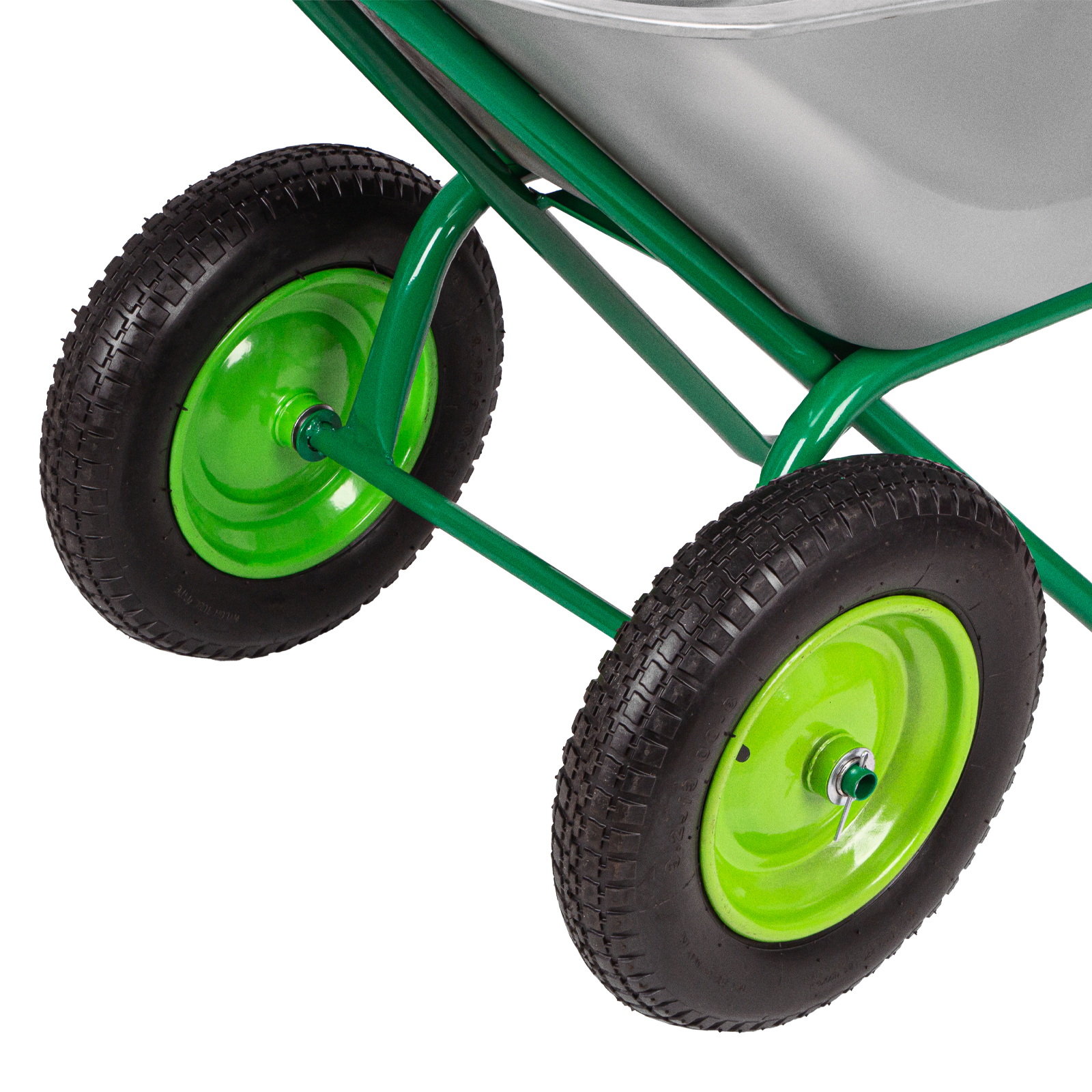 - Мягкий и плавный ход — пневматические колеса поглощают вибрации и упрощают перемещение тачки по неровной поверхности, а шариковые подшипники облегчают их вращение.