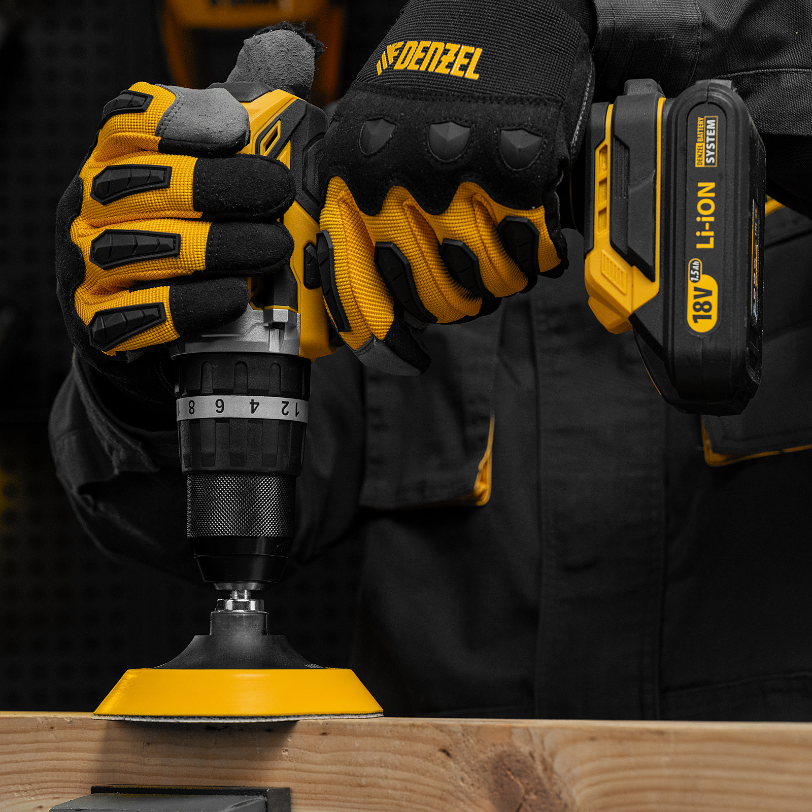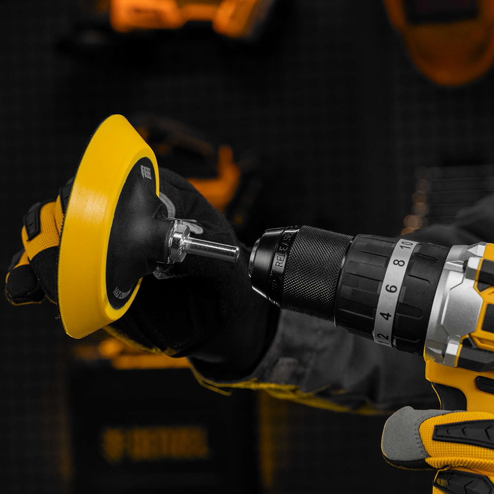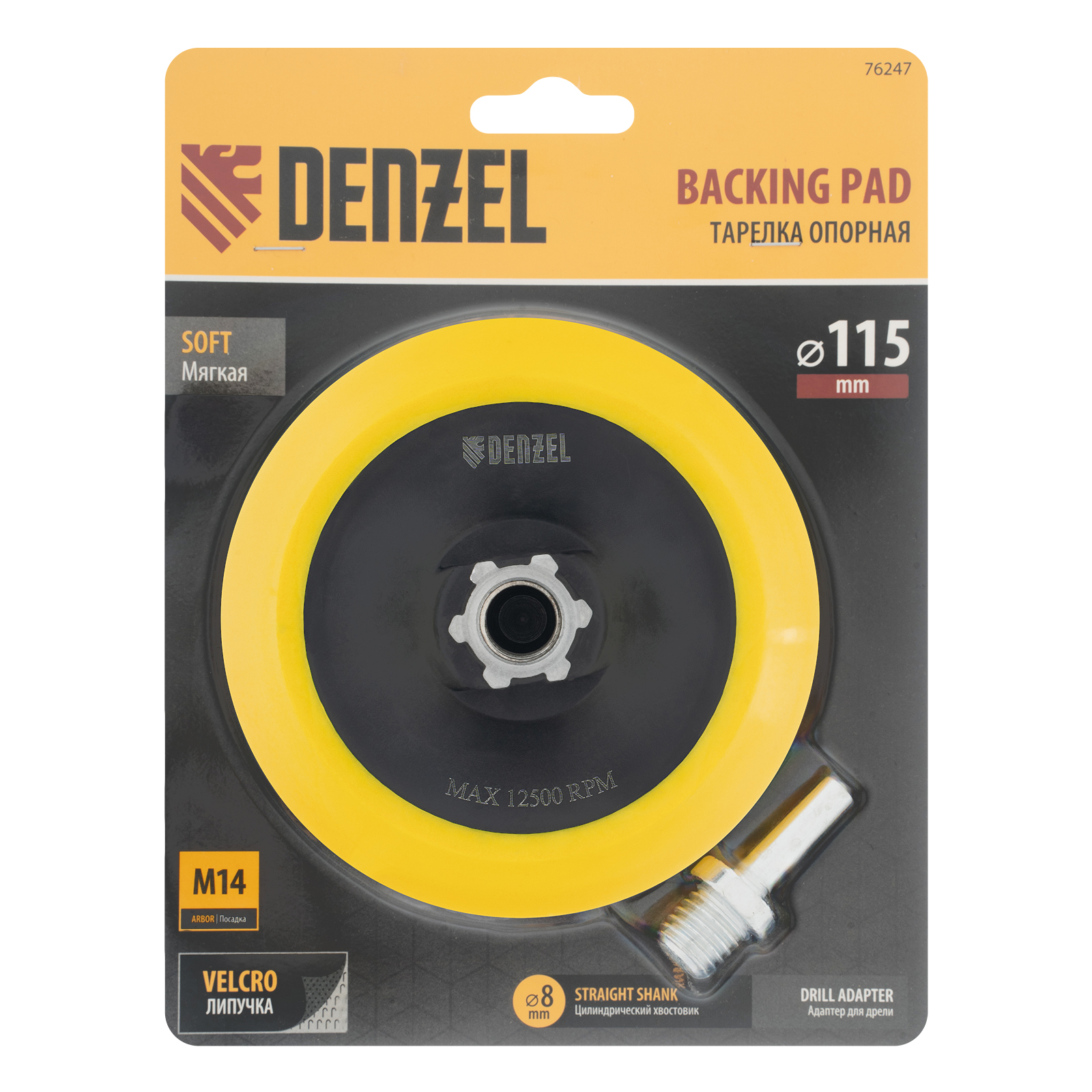 Тарелка опорная Denzel 76247 диаметром 115 мм, с липучкой и адаптером с М14 на d8, мягкая, устанавливается на дрель или углошлифовальную машину (УШМ). Используется для крепления абразивных или полировальных кругов на ворсовой основе, позволяет подготовить поверхность для дальнейшей обработки или придать ей финишную гладкость.