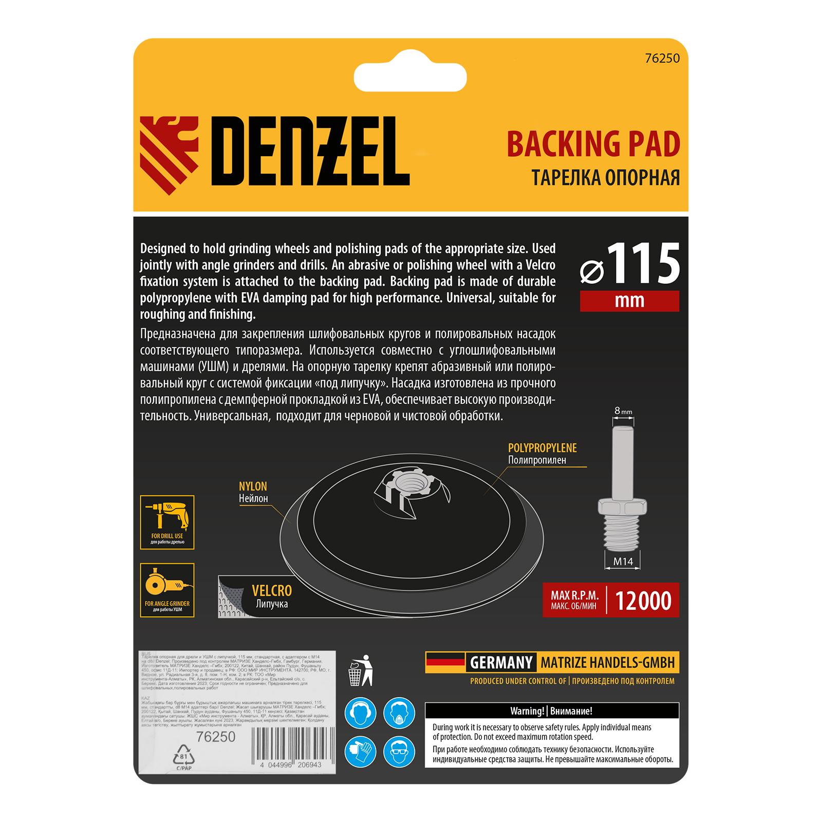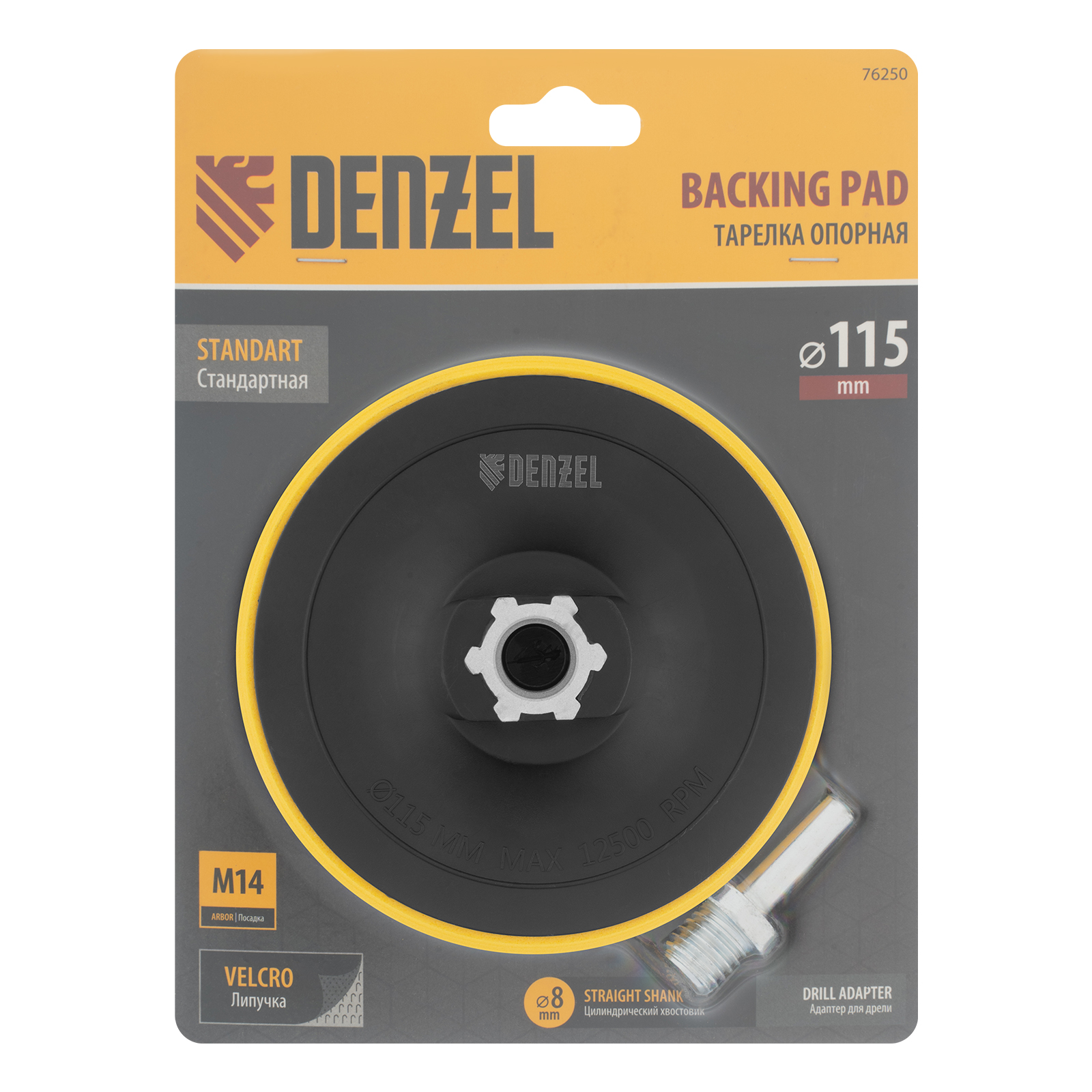 Тарелка опорная Denzel 76250 диаметром 115 мм, с липучкой и адаптером с М14 на d8, стандартная, устанавливается на дрель или углошлифовальную машину (УШМ). Используется для крепления абразивных или полировальных кругов на ворсовой основе, позволяет подготовить поверхность для дальнейшей обработки или придать ей финишную гладкость.