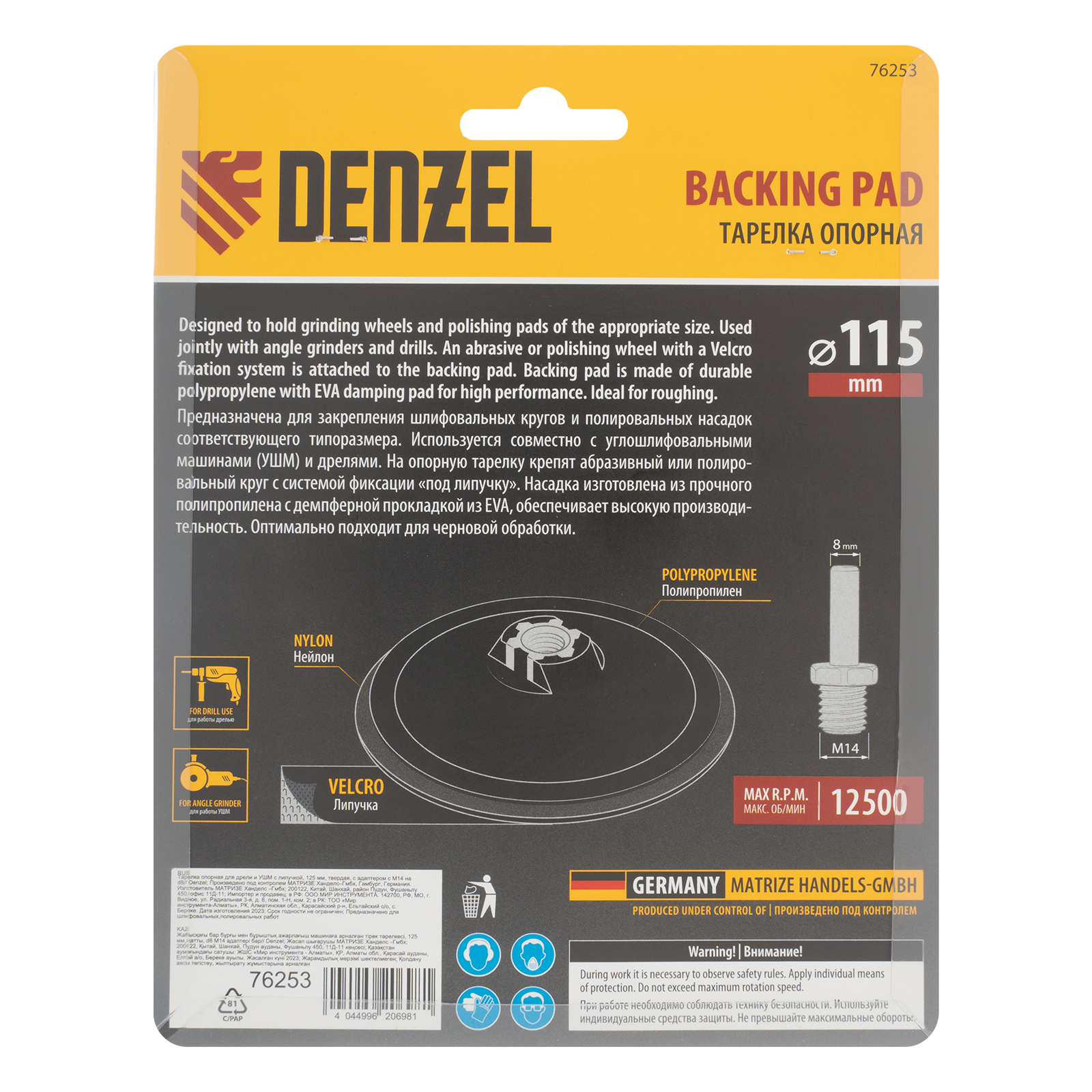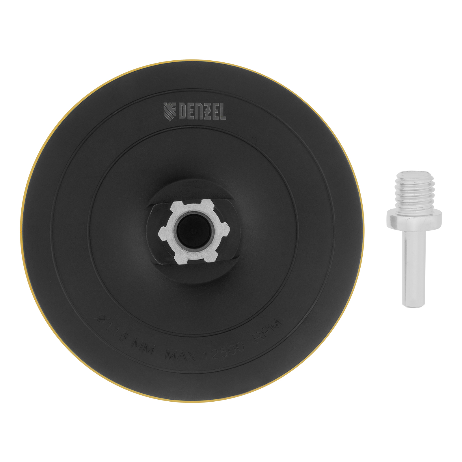 Тарелка опорная Denzel 76253 диаметром 115 мм, с липучкой и адаптером с М14 на d8, твердая, устанавливается на дрель или углошлифовальную машину (УШМ). Используется для крепления абразивных или полировальных кругов на ворсовой основе, позволяет подготовить поверхность для дальнейшей обработки или придать ей финишную гладкость.