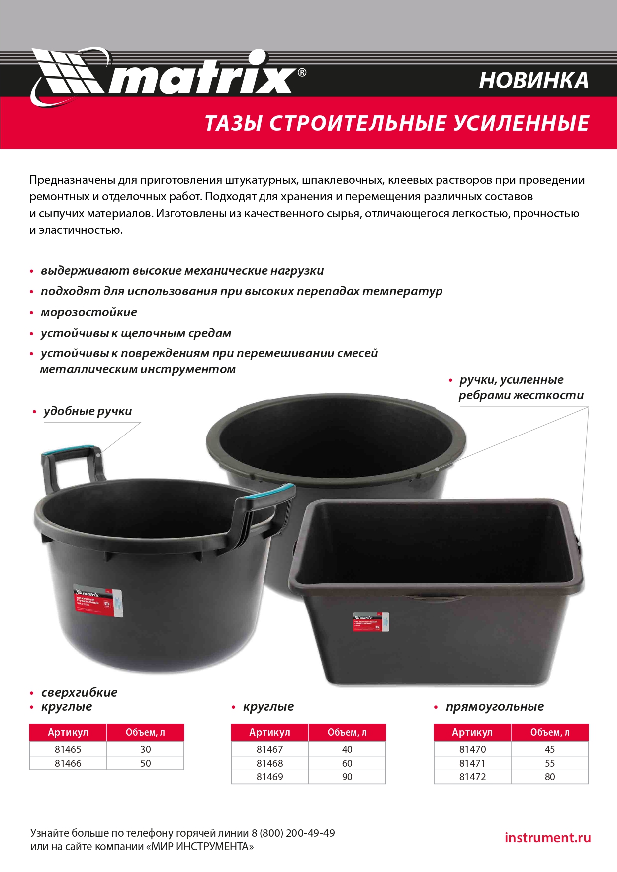 Таз круглый строительный гибкий Matrix 81466 объемом 50 л, с ручками, предназначен для замешивания строительных растворов любого типа при проведении ремонтно-отделочных работ. Благодаря диаметру 555 мм для приготовления смеси удобно использовать различный отделочный инструмент (шпатели, кисти). Пригодится такой таз и в быту: он удобен для хранения сыпучих материалов, сбора и утилизации мусора, проведения влажной уборки. Для соблюдения точности дозировки при замешивании на внутренней стенке таза нанесена мерная шкала.