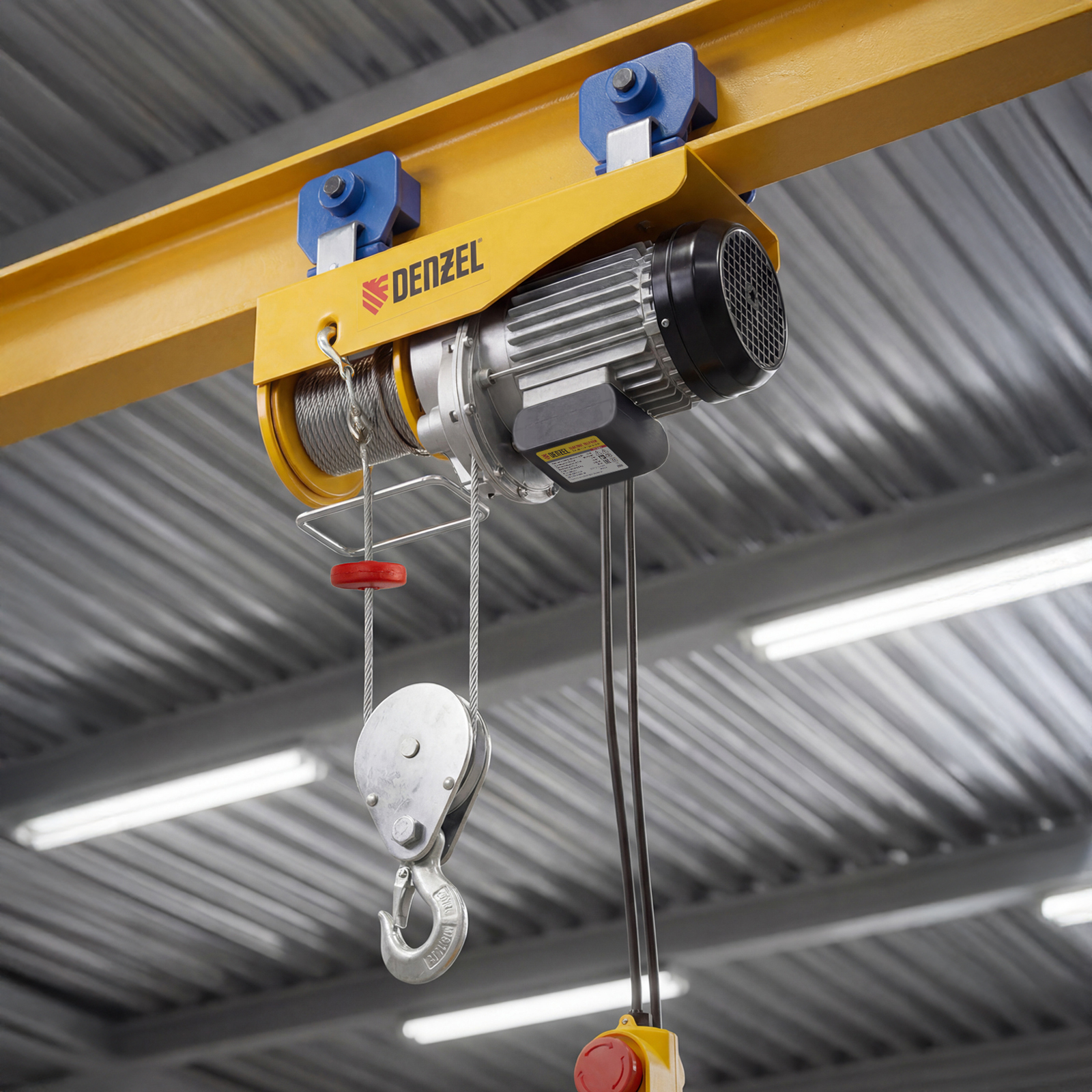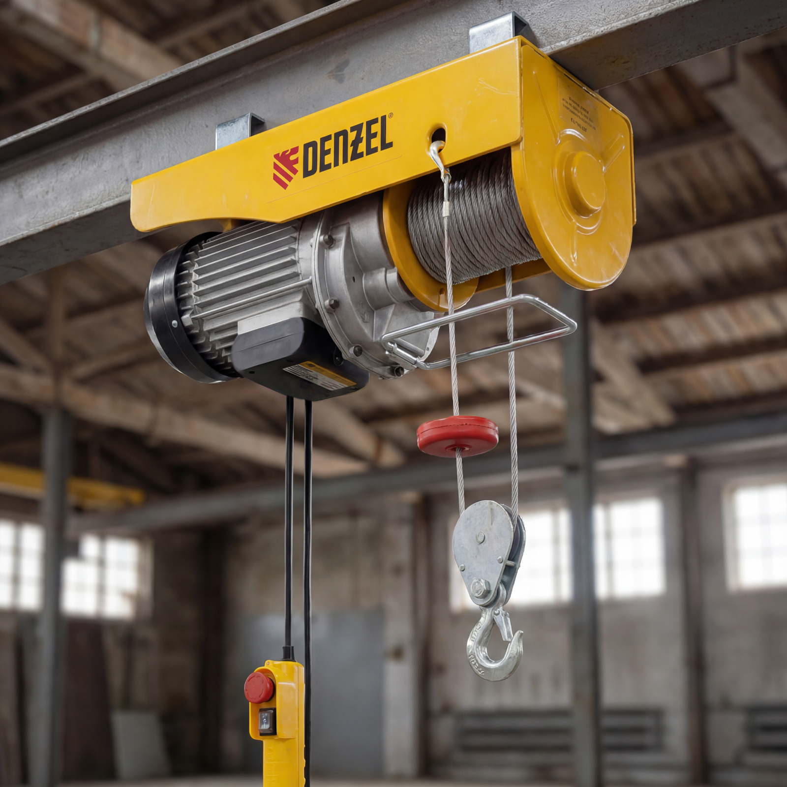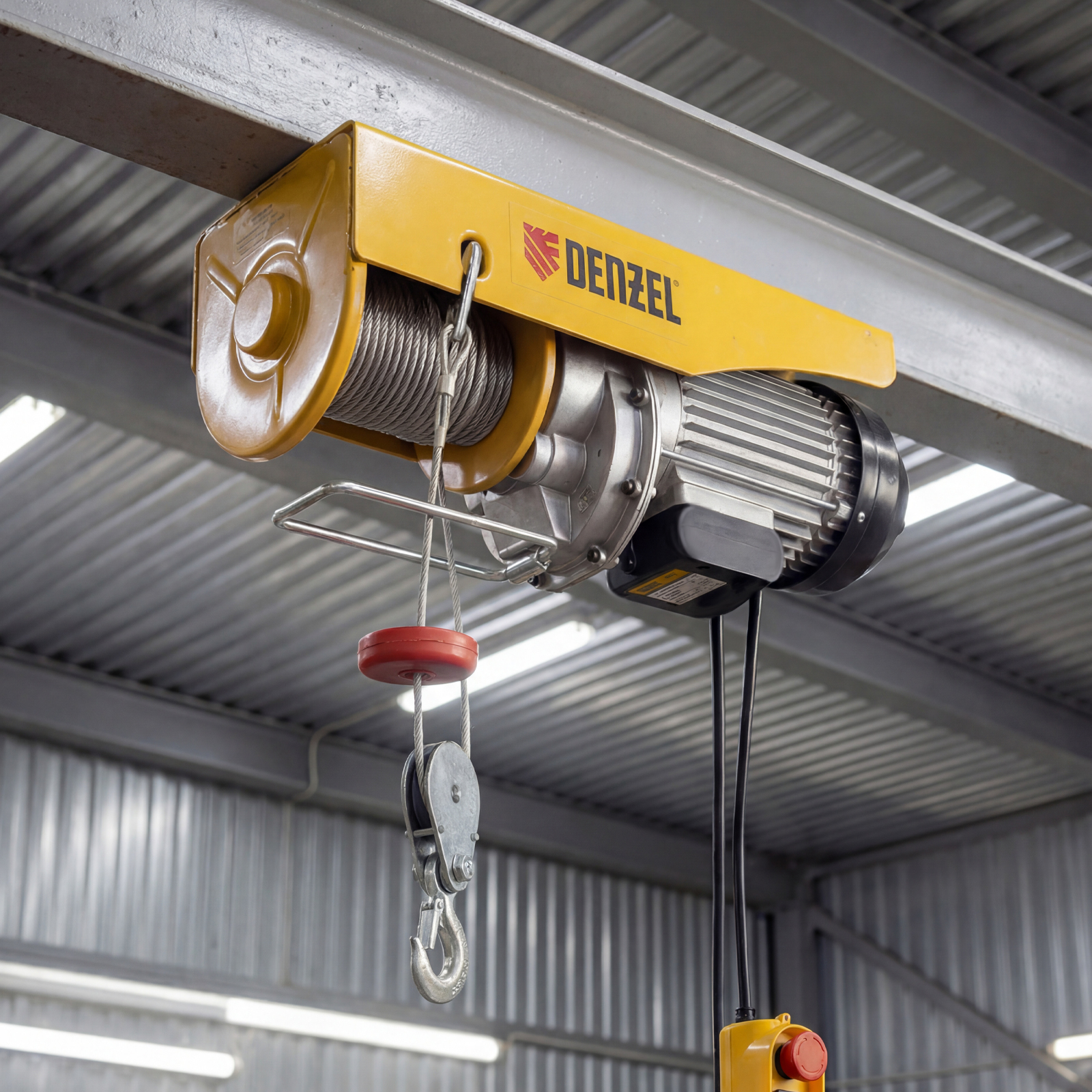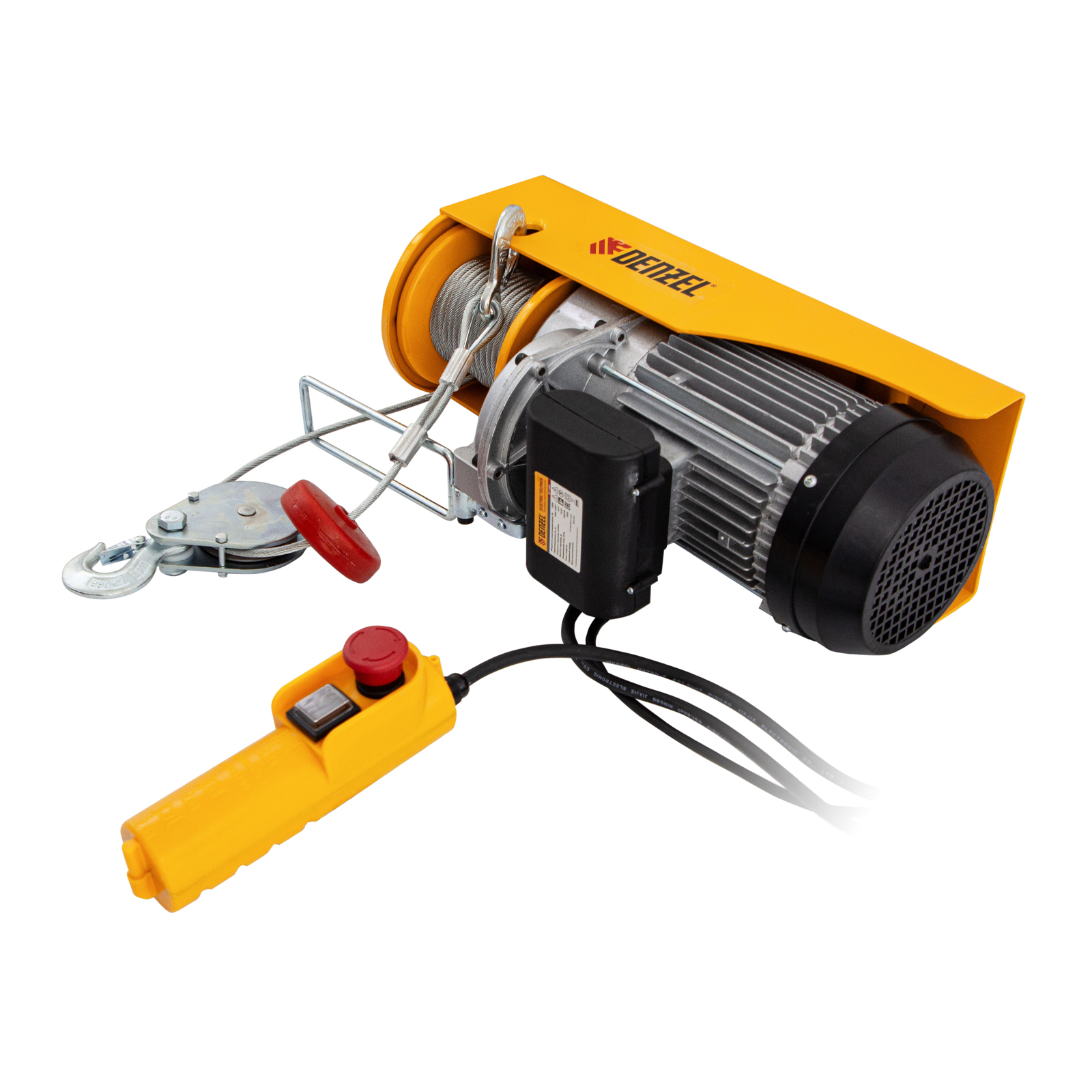 Электрический тельфер Denzel TF-1200 52018 мощностью 1800 Вт способен поднимать автомобильные двигатели, строительные материалы и другие грузы массой до 0,6 т напрямую и до 1,2 т с помощью блока полиспаста. Высота подъема составляет 6 м при использовании полиспаста и 12 м без него, скорость — 4 и 8 м/мин соответственно. Устройство пригодится в гараже, автомастерской или на строительной площадке. Полиспаст входит в комплект поставки.