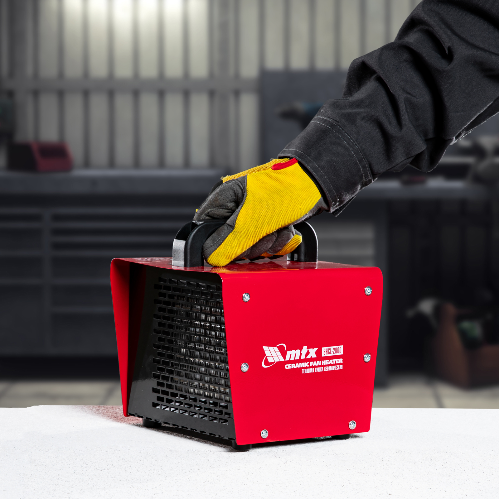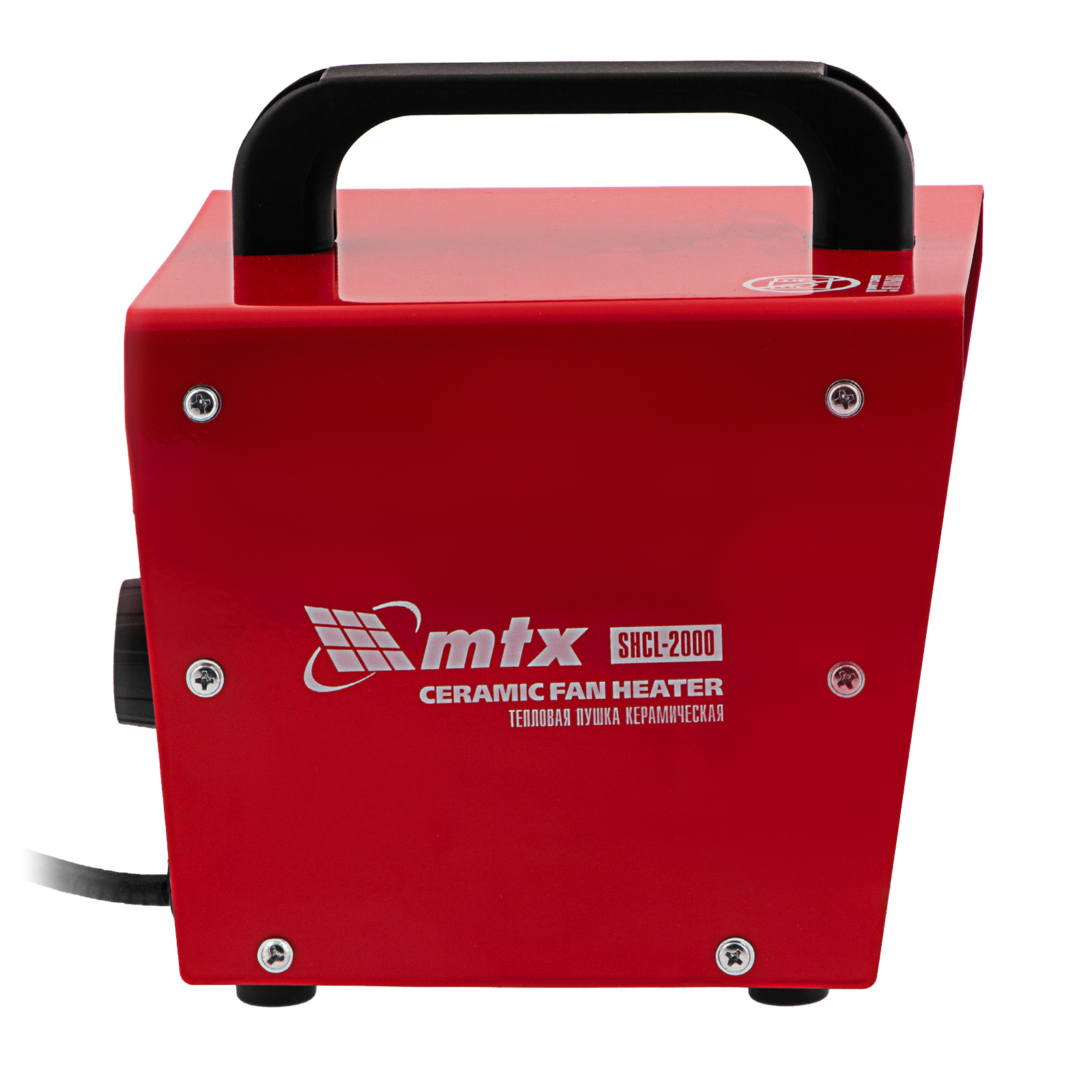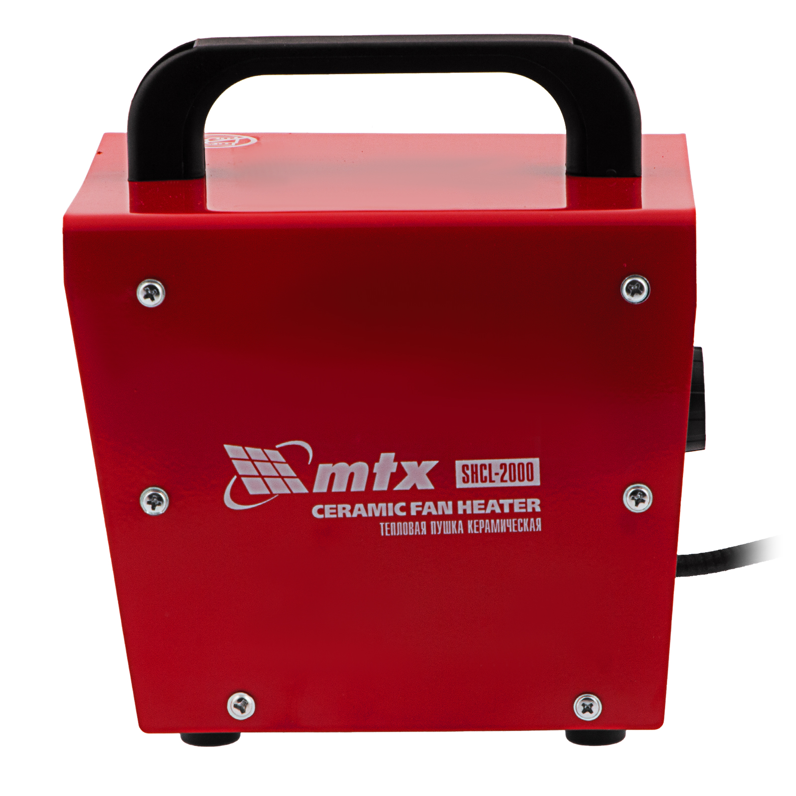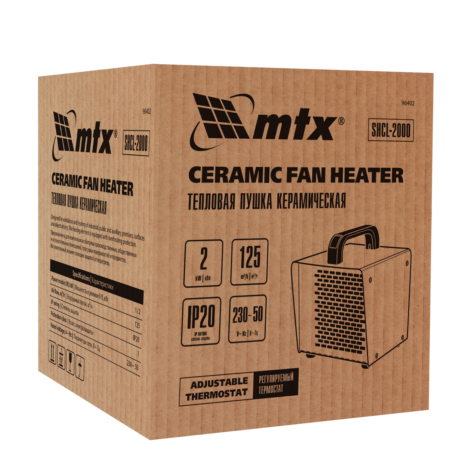 Керамическая тепловая пушка MTX SHCL-2000 96402 производительностью 125 куб. м/ч, в квадратном корпусе, работает в режиме нагрева на полной мощности 2 кВт или частичной 1 кВт, а также в режиме вентиляции. Предназначена для обогрева цехов, складов, мастерских и других нежилых помещений площадью до 20 кв. м. Также позволяет быстро просушивать различные поверхности, например, стяжки пола или оштукатуренные стены.,Отличительная черта пушки — технология PTC. Металлокерамические нагревательные элементы обладают функцией саморегуляции электрического сопротивления, что обеспечивает оптимальную температуру нагревательного элемента и пожаро-, взрывобезопасность изделия. При сохранении физической целостности нагревательный элемент не теряет своих свойств на протяжении всего срока службы.